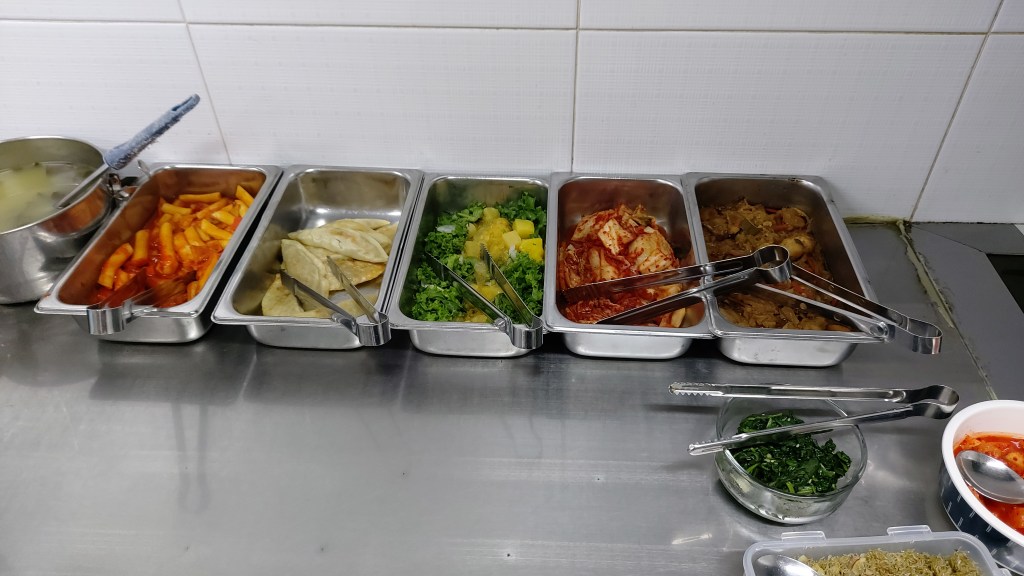 At the hagwon where I teach, lunch is served each day for the kindergarten students. It’s a separate lunch to the teachers’, which usually features some spicy things. The lunch is provided by a catering business but we make our own rice and food for snack. When I taught English to Tibetan refugees in India, we had simple lunches that usually featured a Tibetan bread called tingmo, and dinner was almost always rice and dal. Fruit was provided once a week and if you happened to get to lunch late, you were left trying to find the least rotten piece of fruit. As to be expected, the lunches served at my school in Korea are much different.