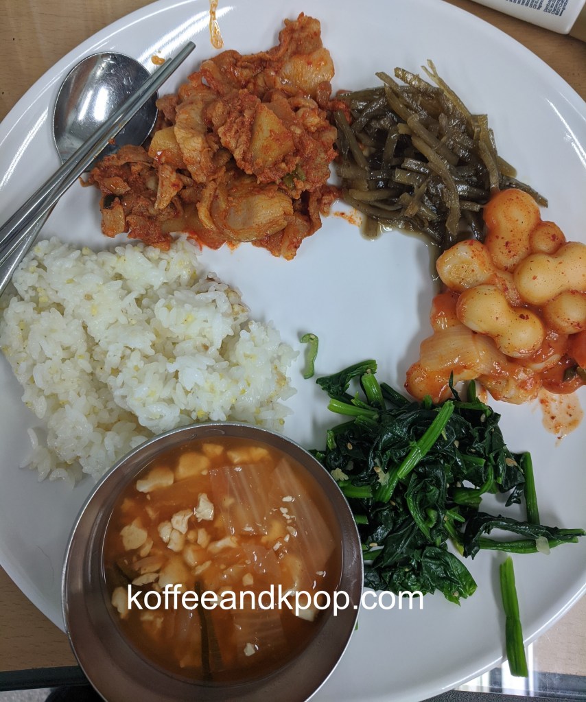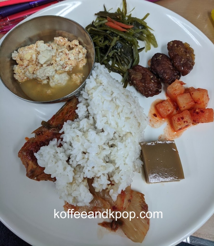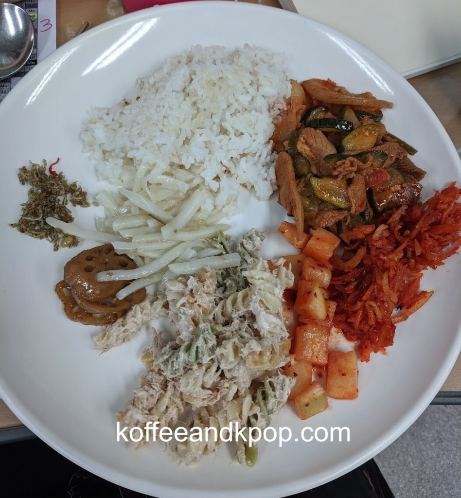 Below are some photos of the school lunch here in Korea. In the first picture, there’s tofu and mushroom soup, white rice, chicken nuggets, bean sprout salad, macaroni, lotus root, and spicy slaw. In the other photos, there’s various foods such as steamed green vegetables, sliced potato, spicy pork belly, acorn jelly, burdock root, anchovies, cubed radish kimchi, cabbage kimchi, omelet, fish with tartar sauce, spicy cucumber, tuna salad, apple salad, fried wonton, and tteokbokki.
