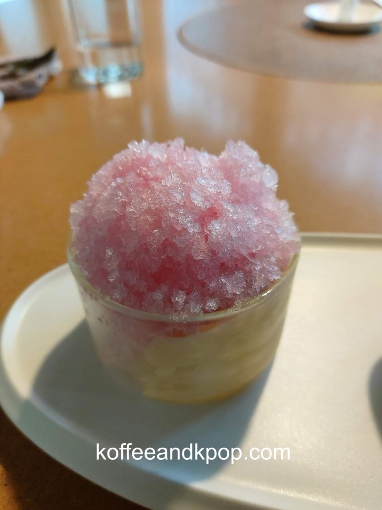 The Omija Granite was “a desert that reinterprets fruit salad and shaved ice with crispy raspberry meringue, elegant sweet rose ice cream, and ice made of omija, a traditional Korean food ingredient.