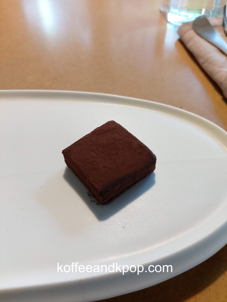 The third pairing was a Nel drip coffee (which you could have hot or iced) paired with a piece of passion fruit chocolate. I ordered the Nel drip hot. You could also have ordered a mugwort tea if you wanted a caffeine-free option. The Nel drip uses a piece of fabric (which I lovingly refer to as a “sock”) instead of a paper filter to “maximize the deep flavor and soft texture of coffee beans.”