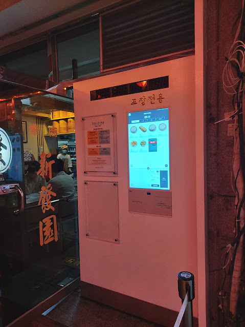 Before I decided to go back to my hotel for the night, I had to get food. I walked back to Chinatown and discovered that there was still a crowd outside one particular dumpling restaurant, called Sinbalwon/Shinfayuen. They had a take-out menu kiosk off to the side, so I took a look at what they had.