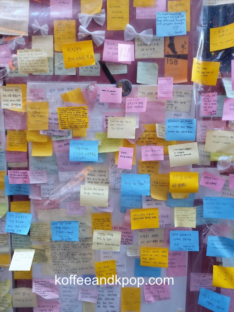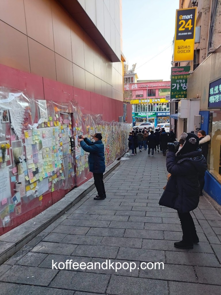 The alleyway itself has several layers of post-it notes expressing thoughts and prayers. Someone had hung clear plastic on top of the first layer, and people have kept adding post-it notes to the top of the plastic, creating a beautiful layered effect. There are some white chrysanthemums, a traditional Korean flower that represents grief, as well as a few dried bouquets under the plastic. You can see how many more post-it notes were posted from December 25th to the 31st when we visited again.