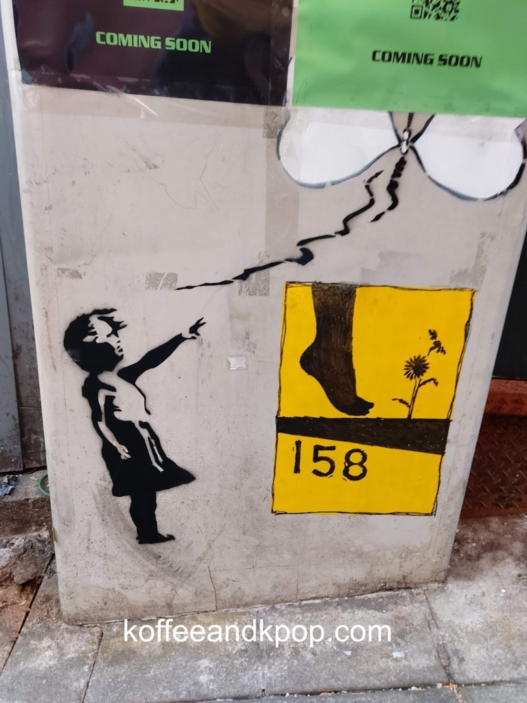 The alleyway in which the crowd crush took place is only a few meters from Itaewon Station exit 1. At the front entrance to the alley is a large blue poster that reads, “Memory is strong. With the power of our memories, I hope we can create a world where disasters and disasters do not repeat. Please remember the world of 159 people.” (Note: I think the poster creator is counting the suicide of the high school survivor as the 159th casualty here, as I would as well. Elsewhere, there is graffiti of a foot being lifted up off the ground and the number 158, the actual death count of the crowd crush.)