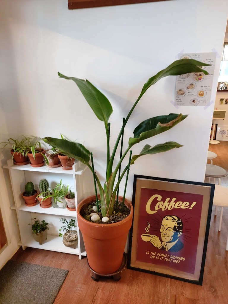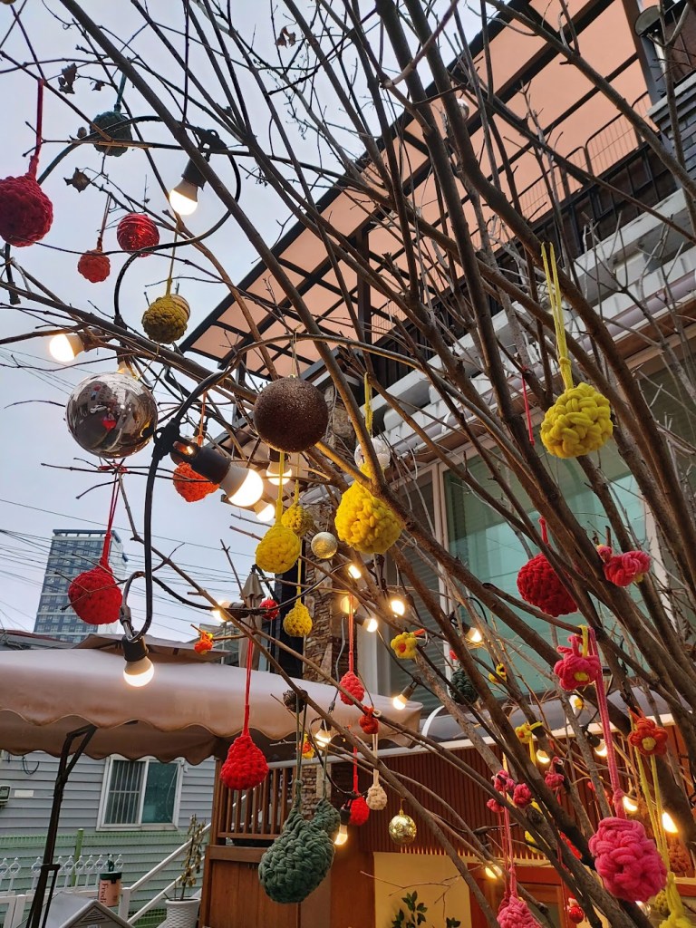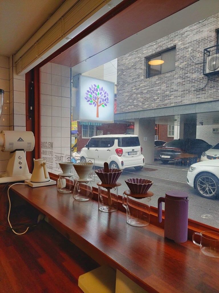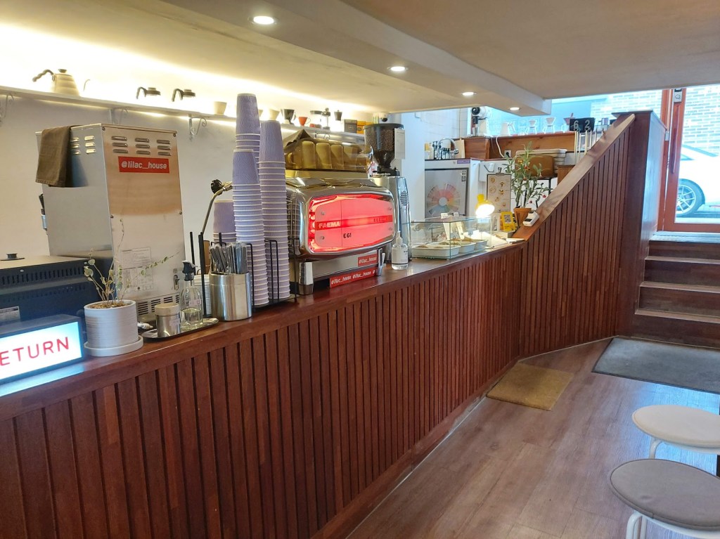 entrance to Lilac House, featuring white tile and ochre woodview of the espresso bar from enteringA4 posters taped up on the wall featuring their lilac croiffle and sriracha chicken sandoone little nook in the café, featuring round tables and inspiring posters taped on the wallthe wifi password posted on the wall beside a poster of a cloudy sky seen from an airplane windowmore inspiring images posted on the wall with lilac colored tapea large table in a green room with lots of bookshelvesbooks on the bookshelf in the green roombooks and a scent diffuser on the bookshelf in the green rooma shelf of tiny plants next to a big plant and a poster that has a man with a coffee cup and the word “Coffee!”self-serve water and utensils areaview of the espresso bar and register from inside the shopa standing “open” sign on the front entrancebeautiful purple drippers on top of Cafe Onion carafesa yellow poster taped on the wall featuring a picture of their lilac croiffledifferent colored aprons hanging on hookscoffee drippers set up in the window facing the streetblackboard hanging above the entrance with some chalk drawings of the menu itemsmenu in Koreanmenu in Korean and English with pictureschicken basil paninifun yarn baubles hanging from the tree outsidecolorful baubles decorating a tree outside, and there are tables outside as wellentrance to Lilac House