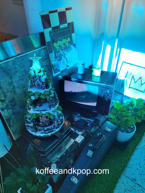 The cafe is a three-story building with a few signs posted on the outside. It has a terrace on the first floor that was open but had plastic sheets put up to keep out the cold. Surprisingly, I stumbled upon a pair of gentlemen there when I went outside to take photos. On the first floor is where you order and pick up your drinks, and the menu is displayed on a computer monitor that also shows what song is playing and has a video monitor focused on you, the guest. I found this a bit… weird. The bathroom is also on the first floor and tucked away in a little nook to the side of the ordering place are some shelves with items for sale, mostly mugs. There’s also a few toy figurines that aren’t for sale. It felt very random.