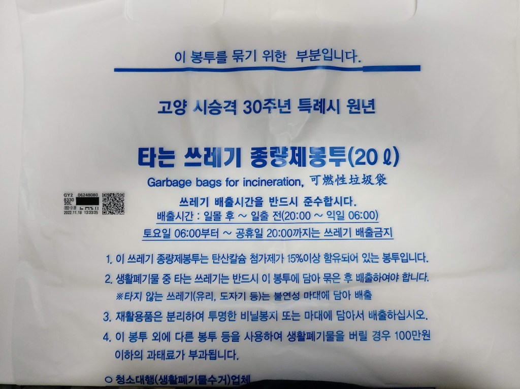 In Korea, they have a 종량제 (Jongnyangje) or VBWF (volume-based waste fee) system that started in 1995. (You can read more about it here.) You’ll have to buy special trash bags in the area where you live in order to throw away your trash. These trash bags are usually sold at convenience stores like 7/11 and GS25. They are usually either white or yellow and come in sizes like 10 liter, 20 liter, 50 liter, and 100 liter. There is usually a space outside your apartment or villa for disposal of these trash bags.
