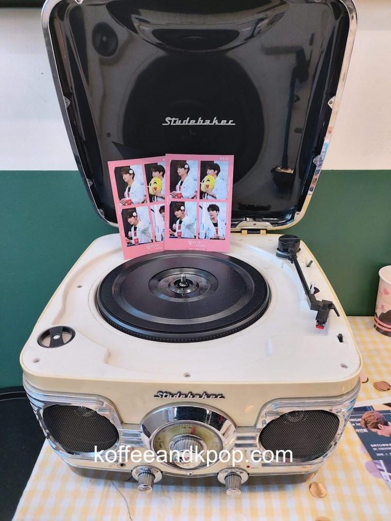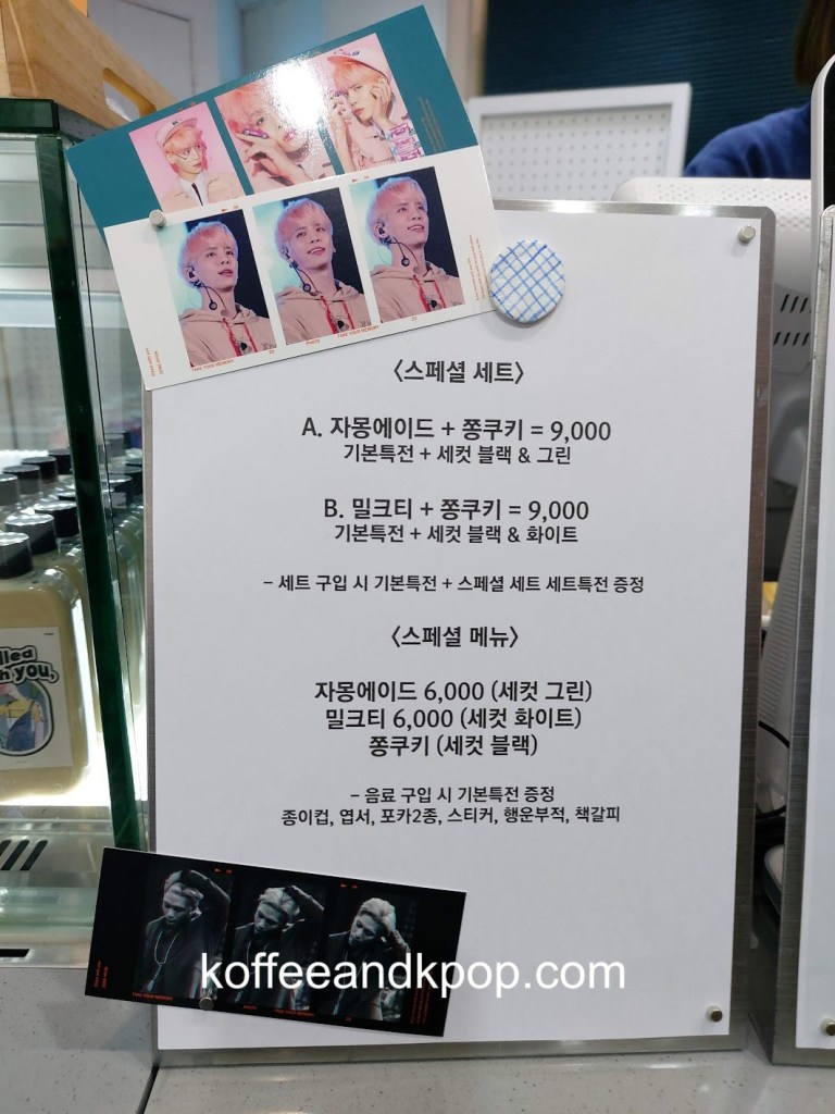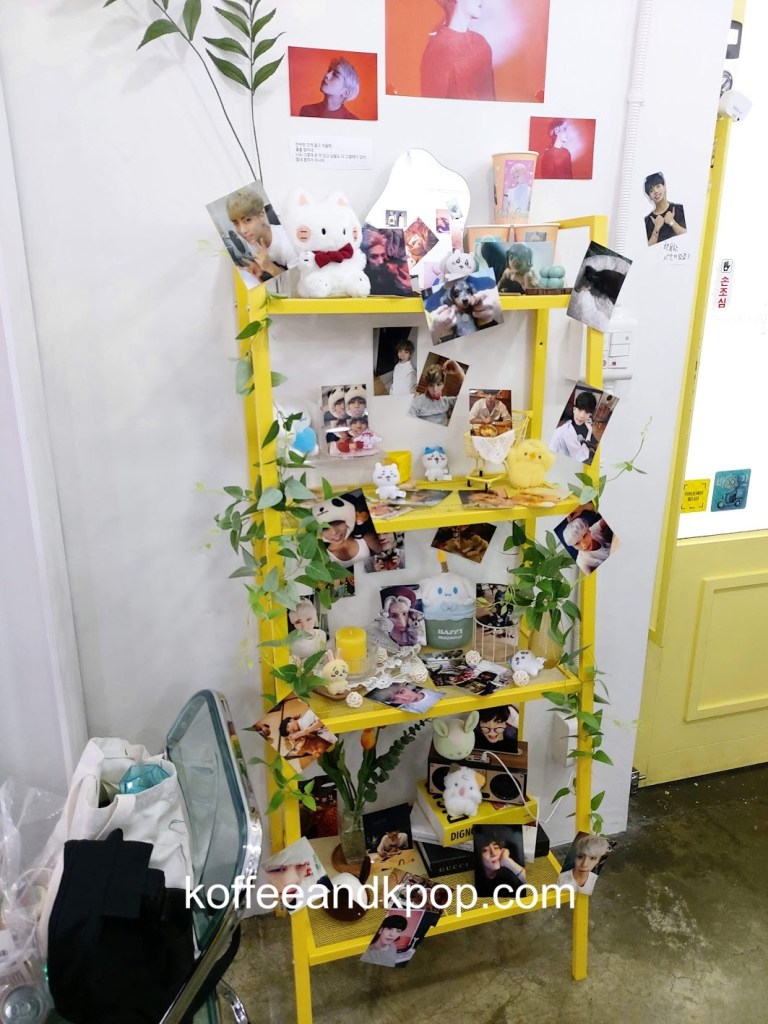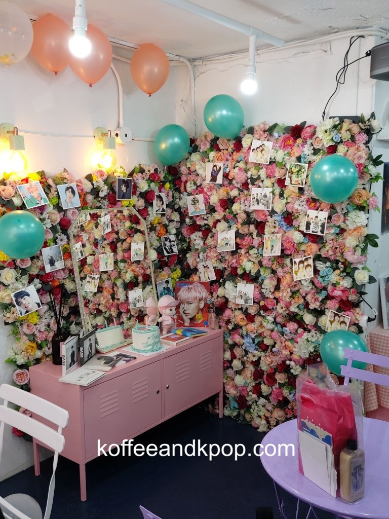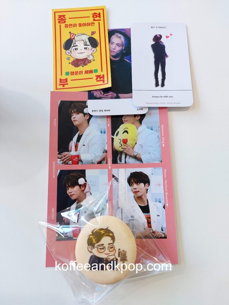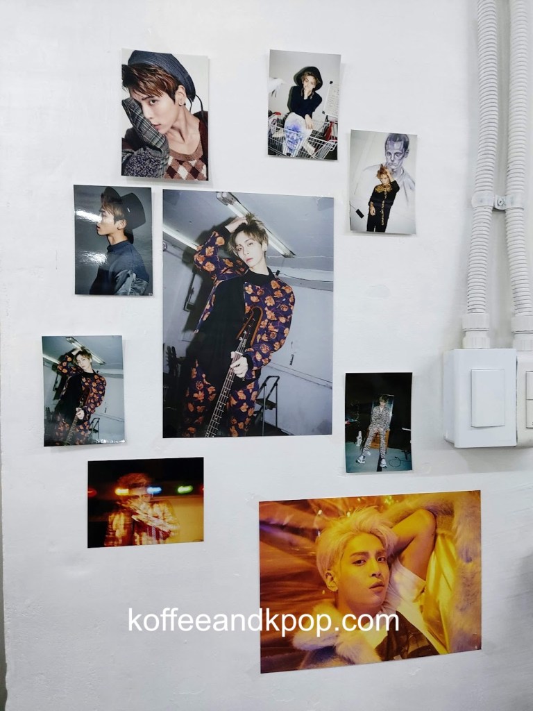 Our third cafe was called Cafe Nita and from a quick look at their location tag, this is a popular cafe to turn into a birthday cafe. I really liked this cafe’s set up and the photos they used for branding. Many of them were of Jonghyun with pink hair, wearing brightly colored clothing. This cafe also had a wall and post-it notes where you could write notes for Jonghyun, the first cafe of the day that we had seen do this. We were given the usual: special paper cup, stickers, photocards.