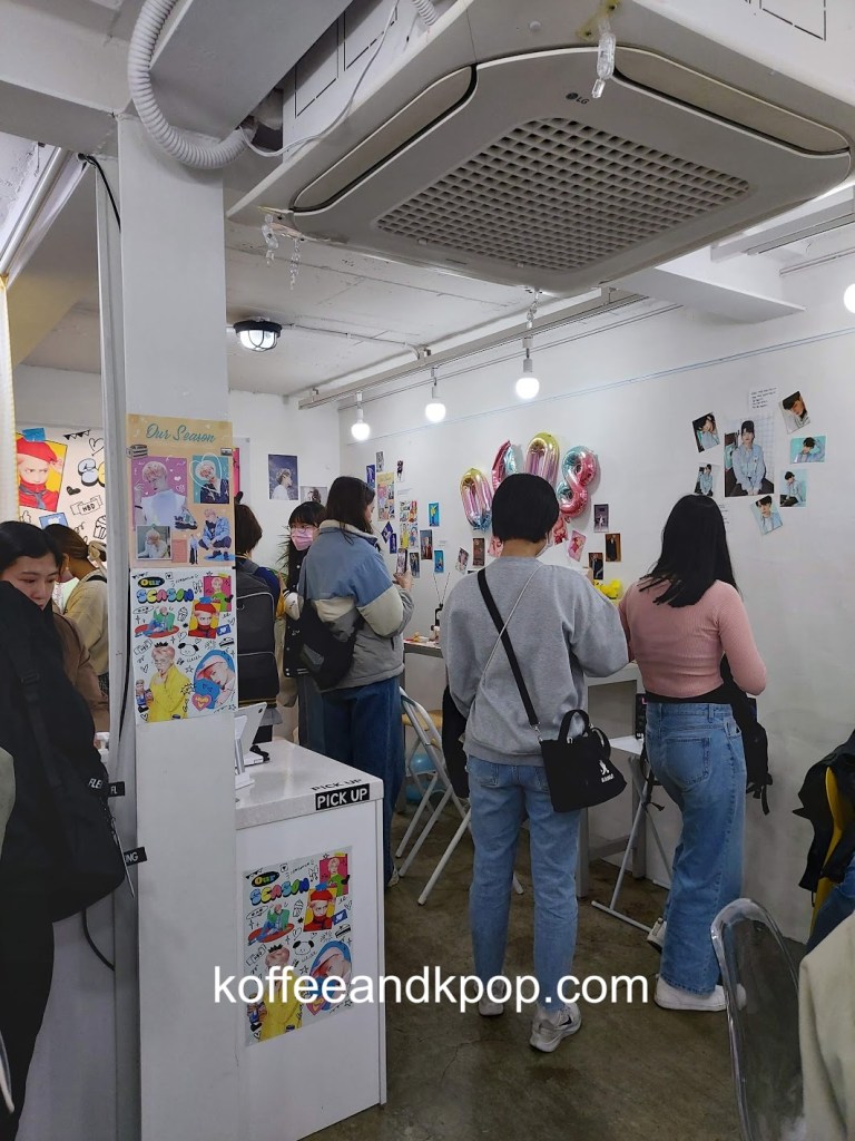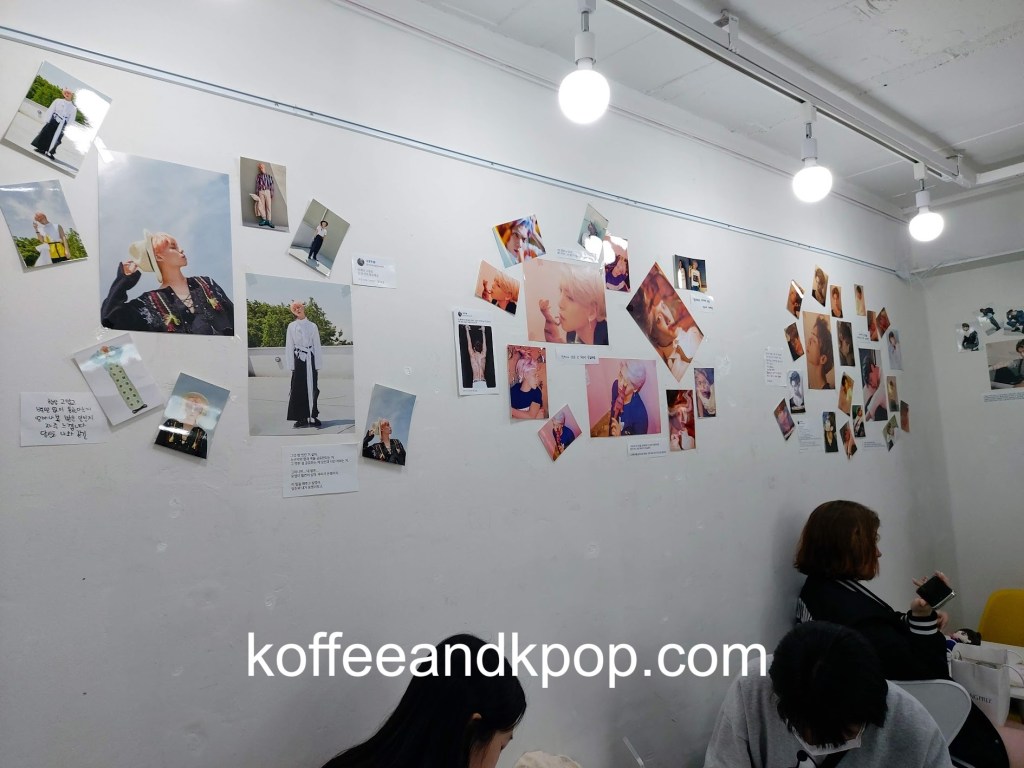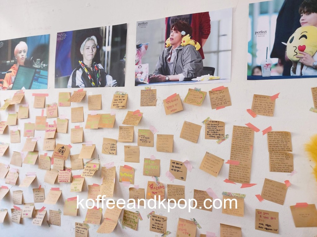 The majority of people in We Meet There were foreigners, whereas the rest of the cafes we had been to had been around 80%-90% Korean. We got the usual: special paper cup, macaron with his image printed on it, photocards and stickers. I bought an additional cold brew because despite having been to so many cafes, I had only had a little bit of the milk tea as far as caffeine for the day had gone. This last cafe also had a wall with post-it notes.