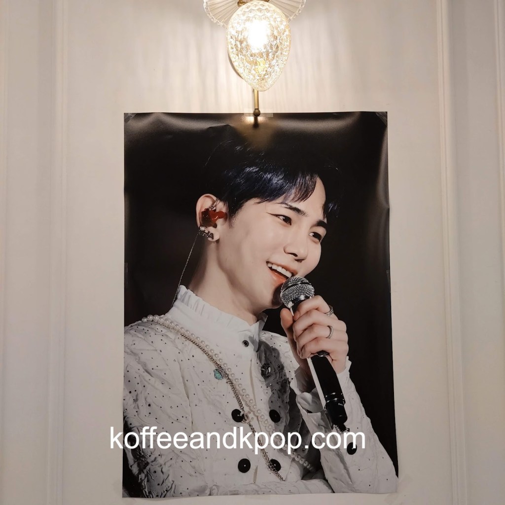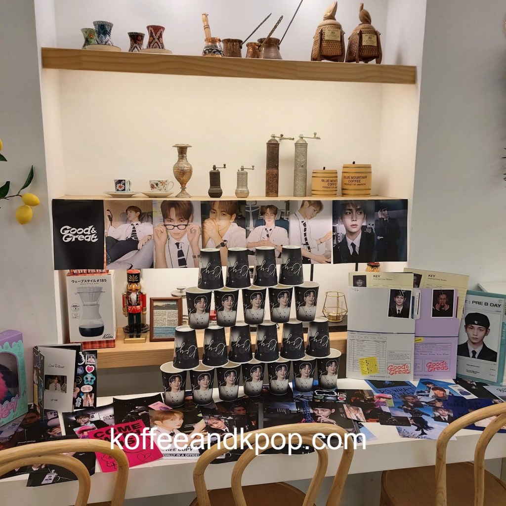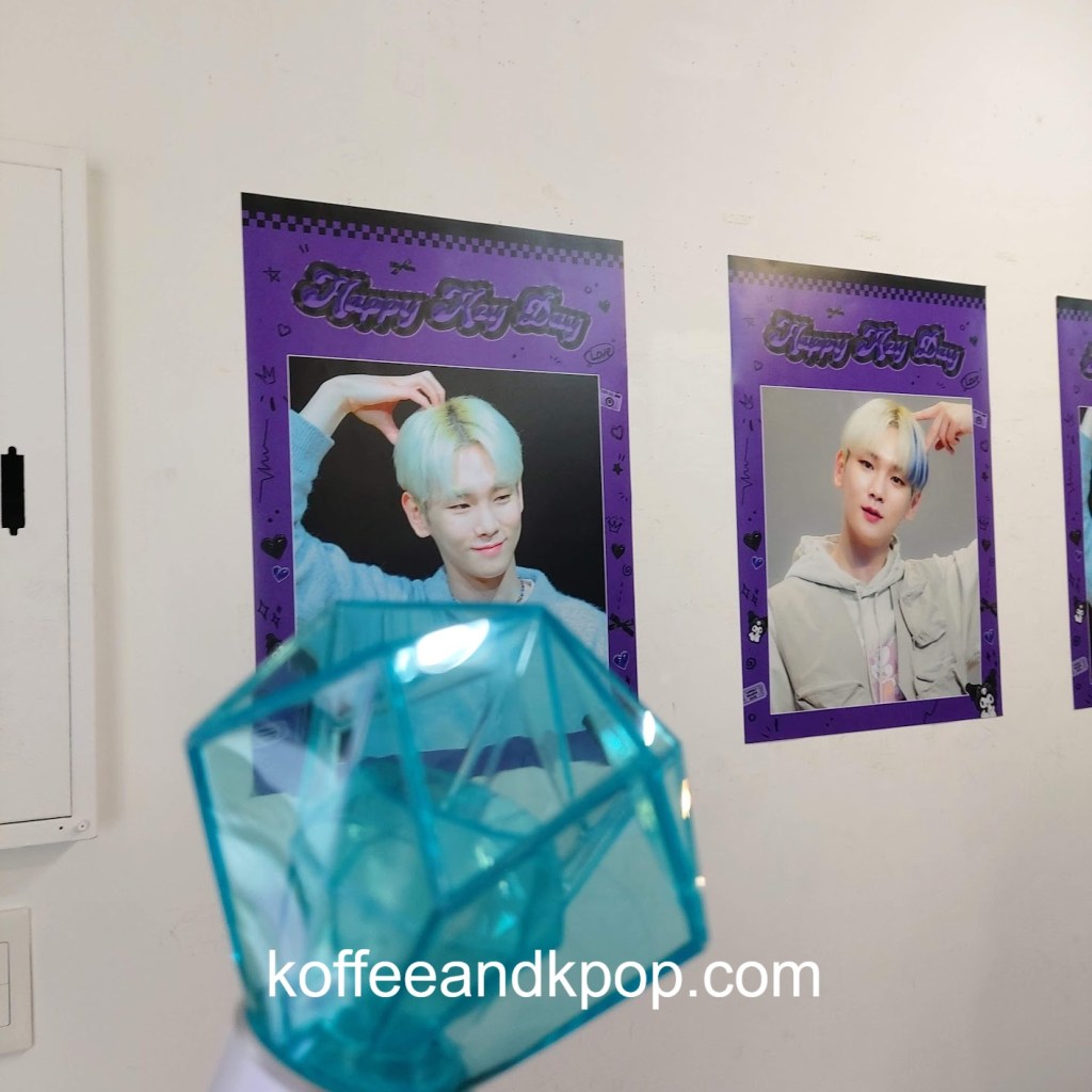 poster declaring “Key Day” at the front of the cafeposter of Key in a beige bedazzled suit, below a fancy light fixturetable display of stacks of the birthday cups along with pictures of Key; on the shelves you can see some coffee equipment like hand grinders and cezve, traditional Turkish coffee potsclose-up of the pictures and birthday cup stackpictures of Key sitting on the top of the wrap-around seating area–this cafe was quite spaciouspictures of bedazzled Key on stageposter of Key in a blue houndstooth suita small white vase of orange and yellow flowers on a small table meant for two people, below a window with tied-back sheer curtainsperformance pictures of Key in his “Hard” stage outfitmirror decorated with square photos that seem to be taken from Key’s instagramposter of Key wearing a white suit with pearls and gems and holding a microphone while gazing lovingly at the crowda gray and black Slayer espresso machine topped with stacks of white paper cups with dark brown cup sleevestwo menus posted side-by-side, one with regular espresso drinks and desserts and the other with their pour over offeringsbirthday paper cup, bottle of lemon iced tea, stickers, postcard, an adorable boarding pass, 3×5 picture, and a sugar cookie in Bok-sillee’s imageclose-up of the cookie