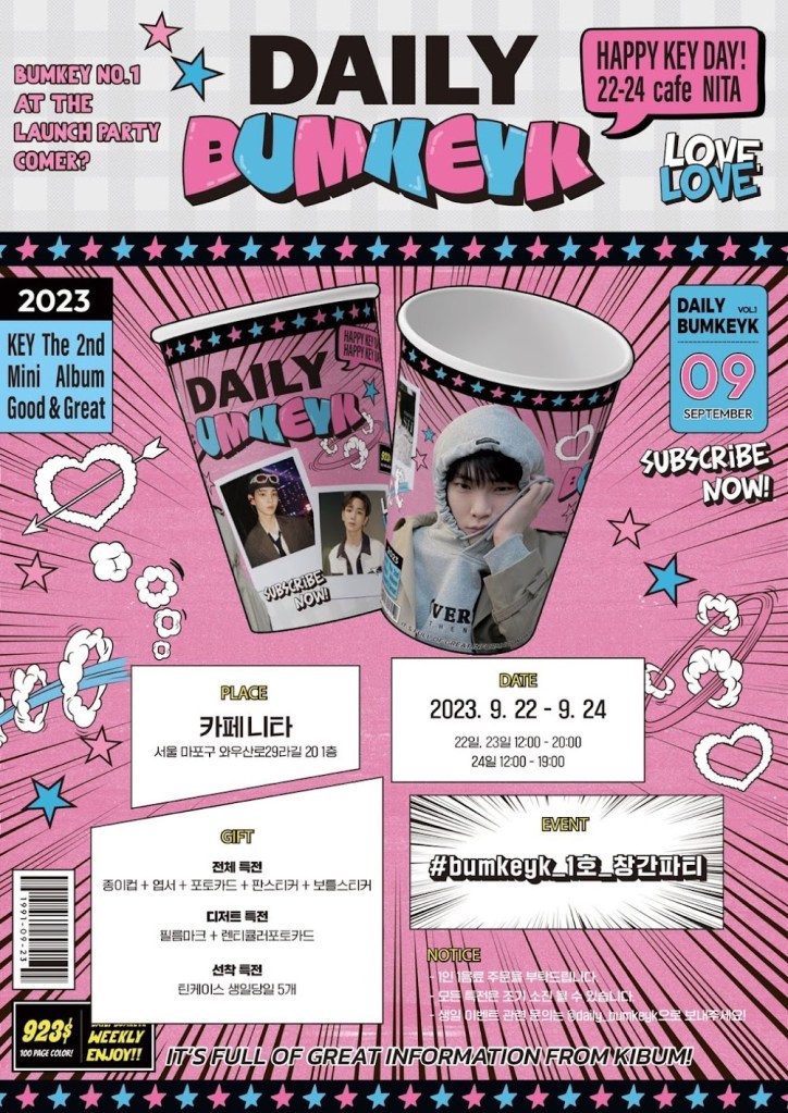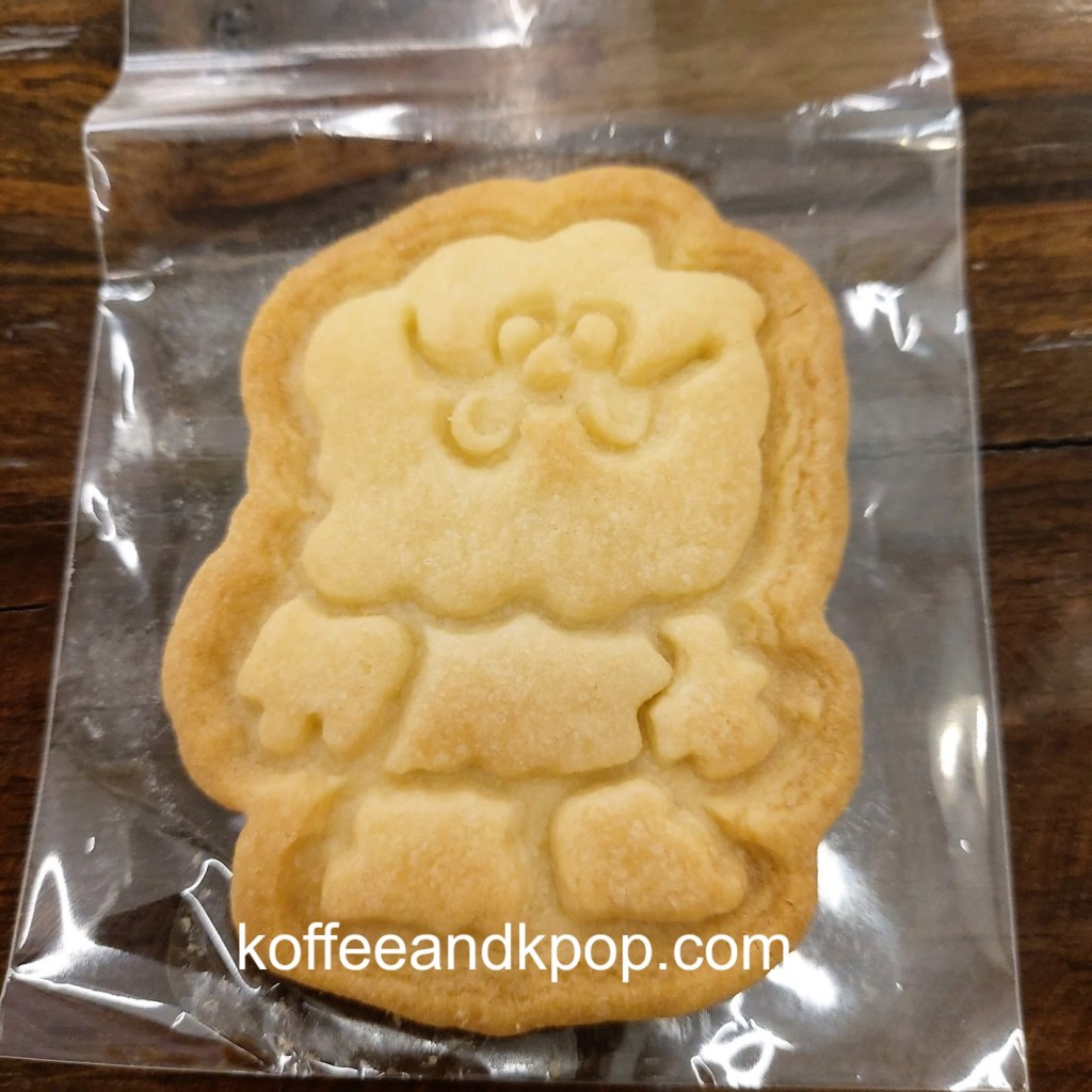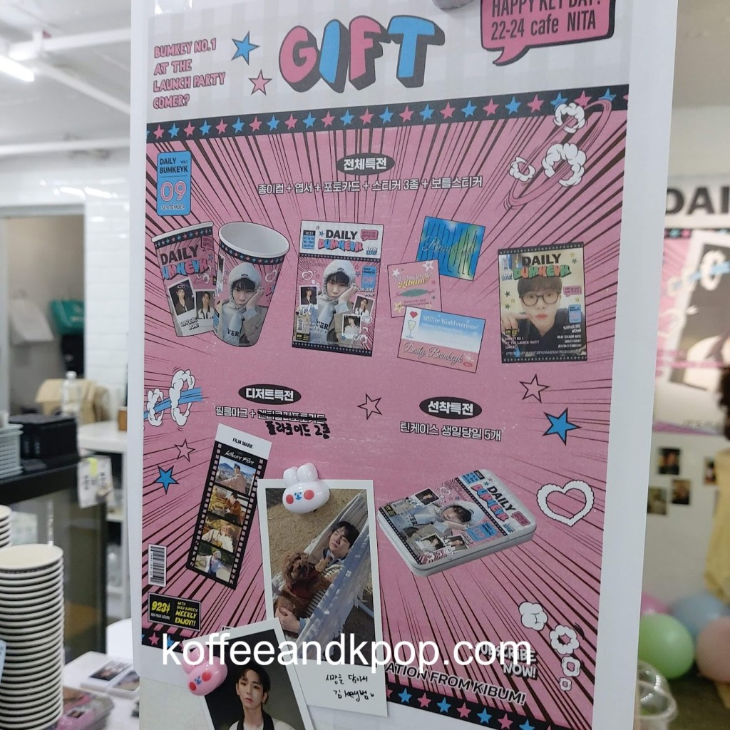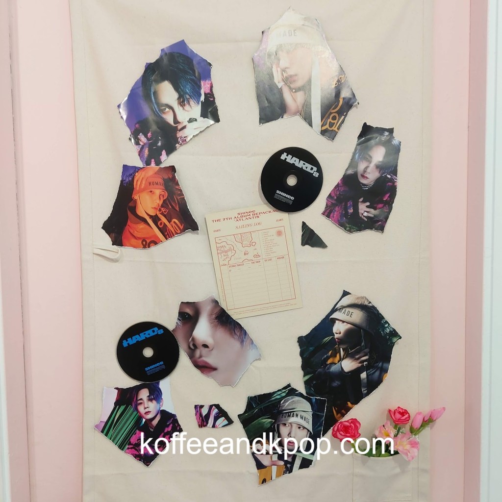 poster declaring “Key Day” at the front of the cafeposter of Key in a beige bedazzled suit, below a fancy light fixturetable display of stacks of the birthday cups along with pictures of Key; on the shelves you can see some coffee equipment like hand grinders and cezve, traditional Turkish coffee potsclose-up of the pictures and birthday cup stackpictures of Key sitting on the top of the wrap-around seating area–this cafe was quite spaciouspictures of bedazzled Key on stageposter of Key in a blue houndstooth suita small white vase of orange and yellow flowers on a small table meant for two people, below a window with tied-back sheer curtainsperformance pictures of Key in his “Hard” stage outfitmirror decorated with square photos that seem to be taken from Key’s instagramposter of Key wearing a white suit with pearls and gems and holding a microphone while gazing lovingly at the crowda gray and black Slayer espresso machine topped with stacks of white paper cups with dark brown cup sleevestwo menus posted side-by-side, one with regular espresso drinks and desserts and the other with their pour over offeringsbirthday paper cup, bottle of lemon iced tea, stickers, postcard, an adorable boarding pass, 3×5 picture, and a sugar cookie in Bok-sillee’s imageclose-up of the cookie