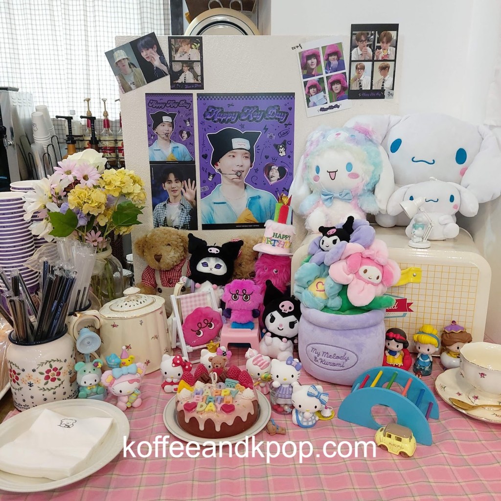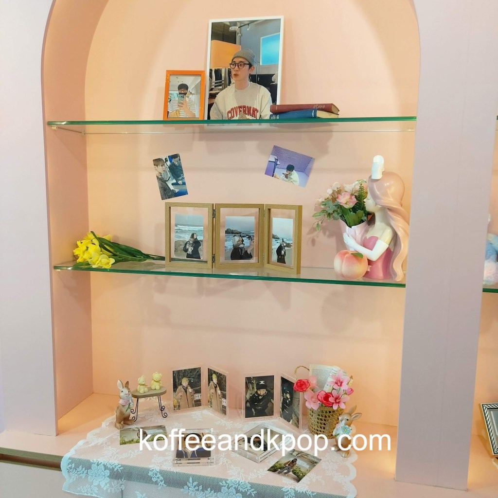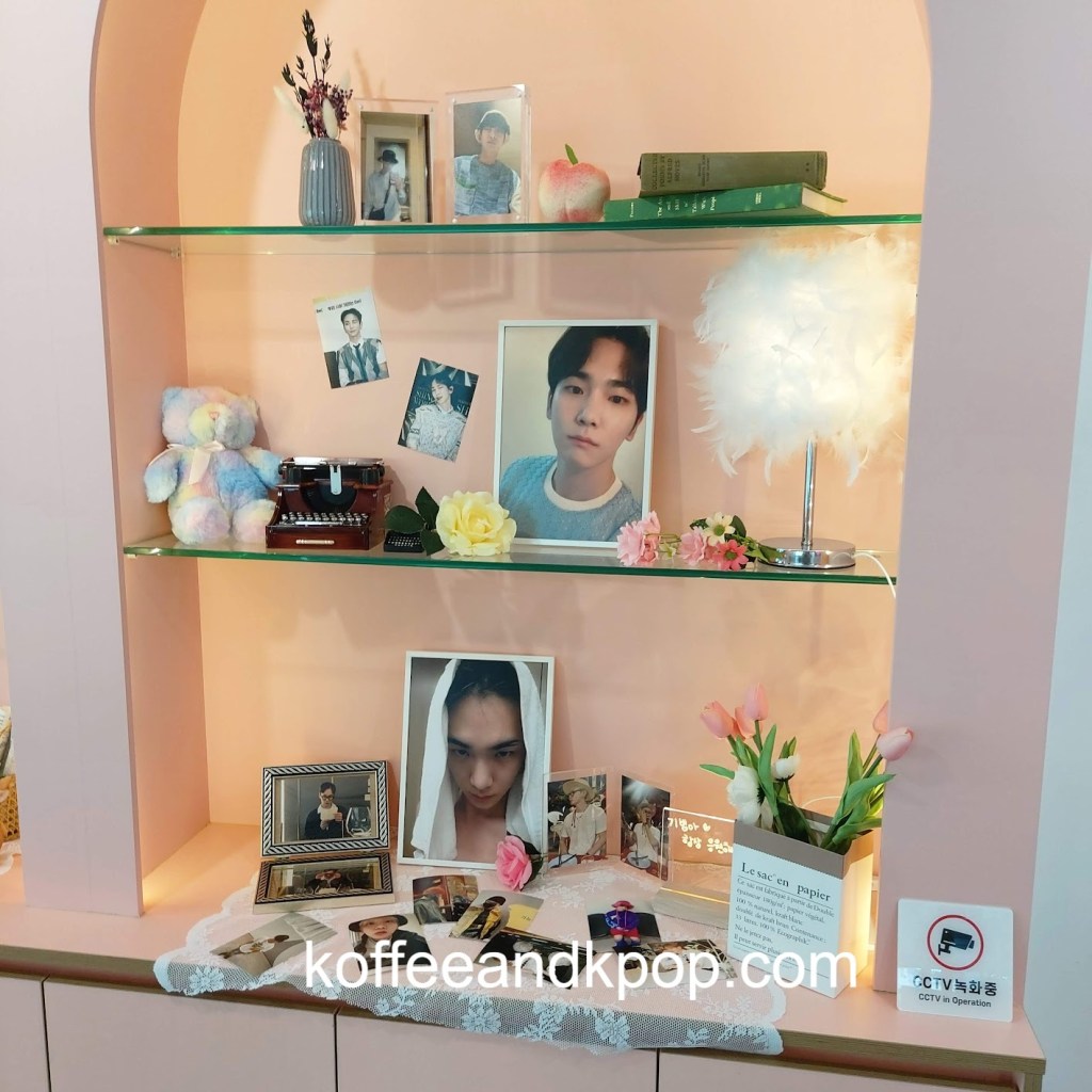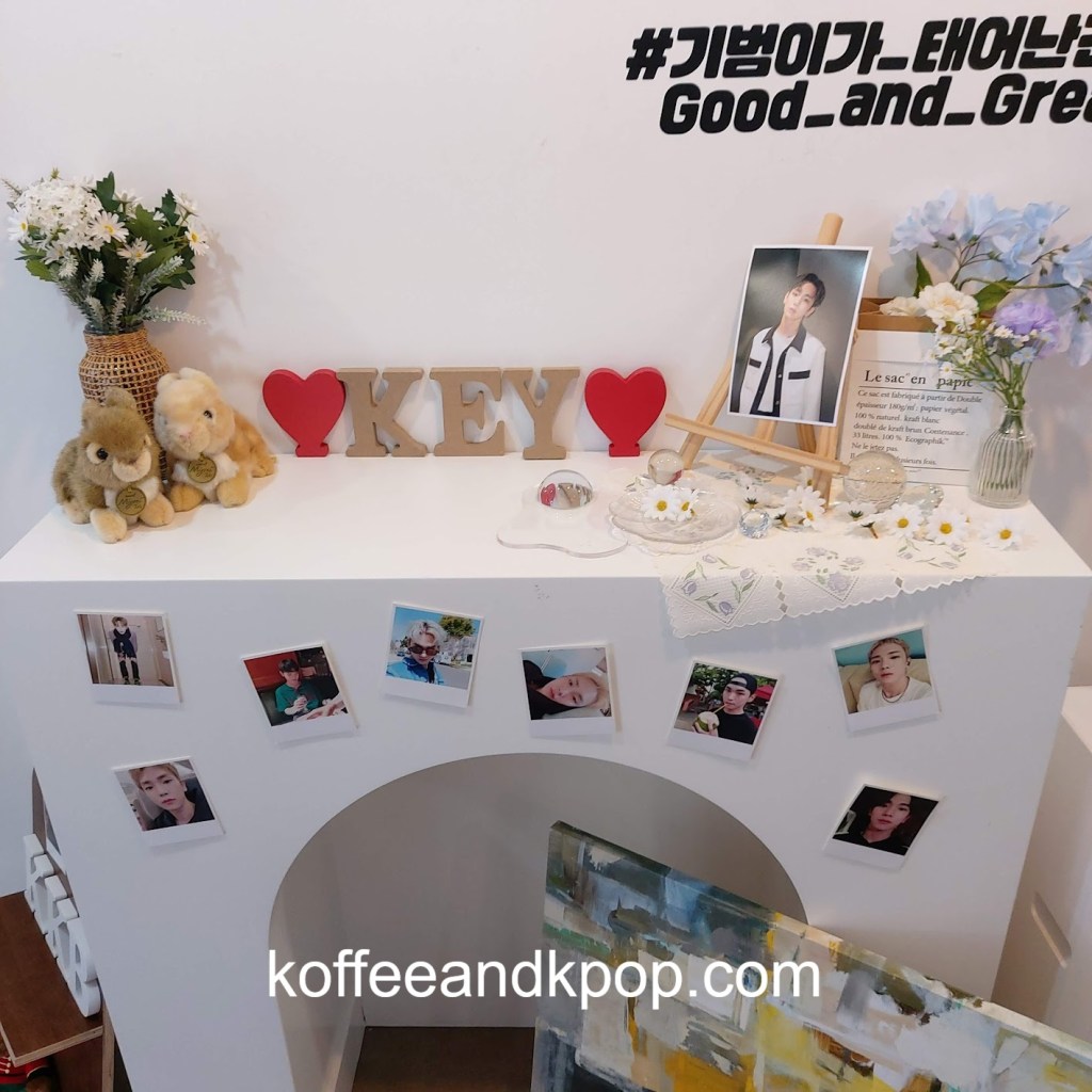 fan made photocards on a table with a fuzzy pink covering and cherry blossom scent diffusera cute little blue locker with the right side open to display a stack of the birthday cups, and there are pictures of Key on the outside of the left closed side of the lockerthree tiered shelves with pictures of Key and some stacked birthday cups and a Shinee lightstick at the bottomanother three tiered shelf with more pictures of Key and random cute things like books and teddy bearsyet another three tiered shelf of pictures and random cute itemsanother three tiered shelf with picturesthey really loved these three tiered shelves for pictures and random cute itemscute pink wavy mirror with some pictures attached by a string at the top, some handwriting in blue on the mirror itself and a llama hanging out to the left sideclose-up of a table featuring pictures of Key, a pink teddy bear and some pink flowerstorn out pictures of Key from Shinee’s latest album posted on a wall, along with the CDstacks of birthday cups, some with several in a stack, for display and purchase; I actually love this idea for fans that are unable to visit birthday cafes on the birthday weekends or new fans