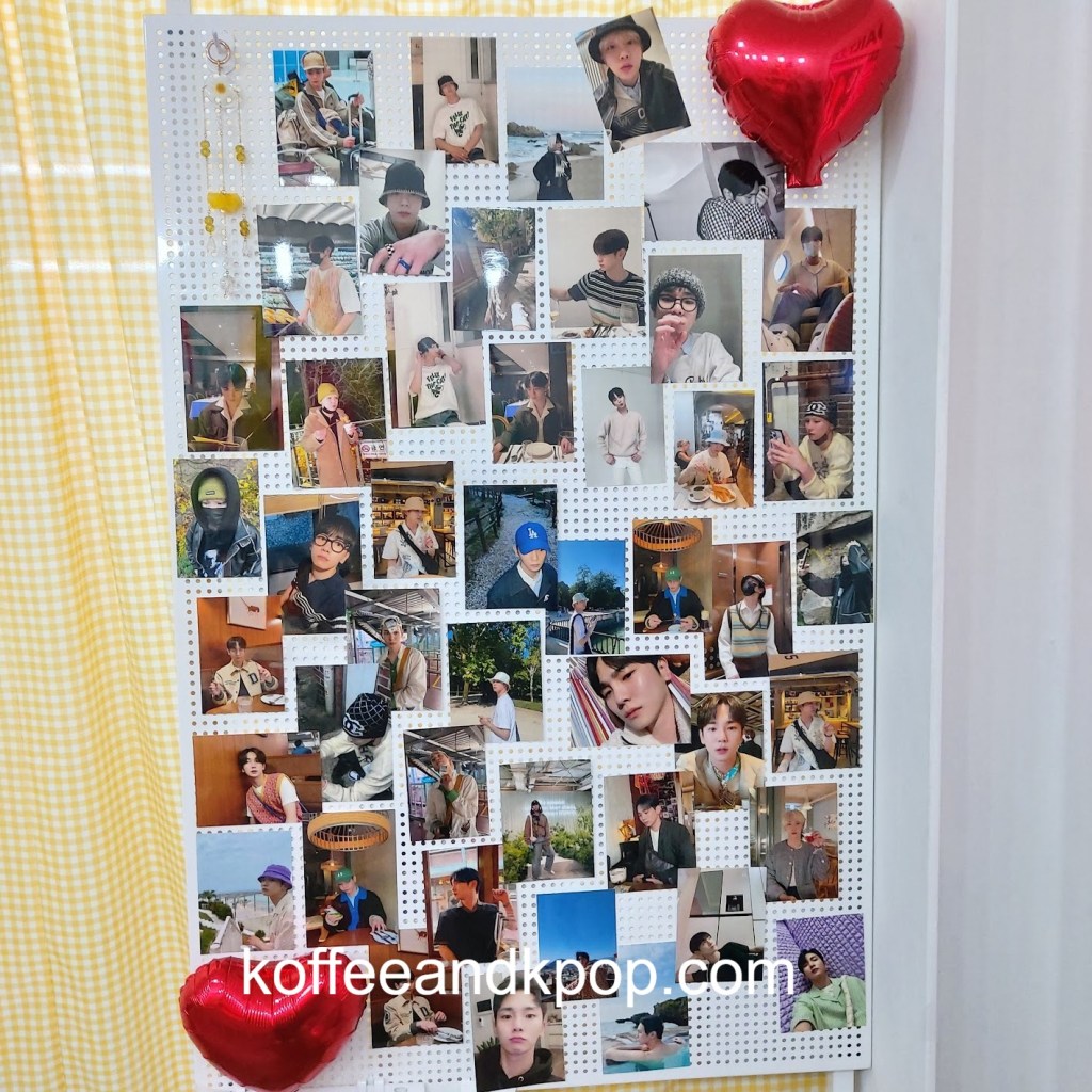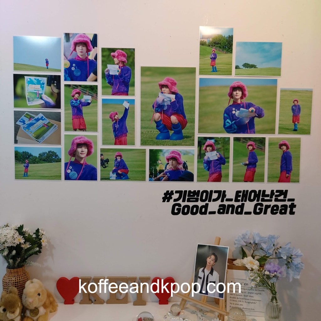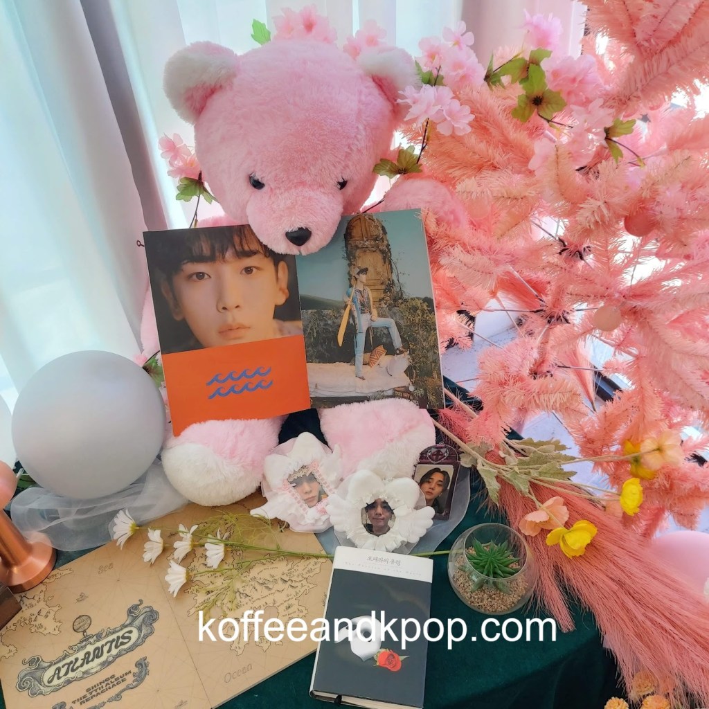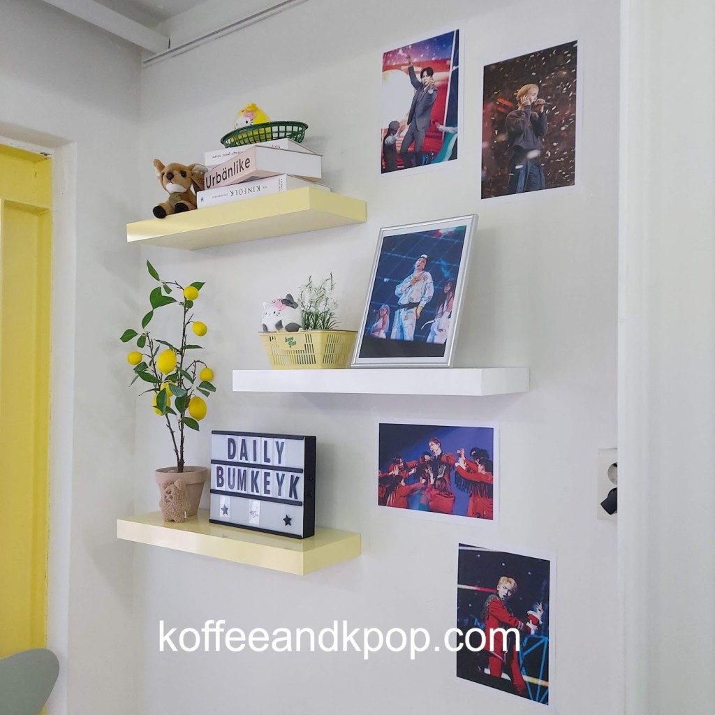 fan made photocards on a table with a fuzzy pink covering and cherry blossom scent diffusera cute little blue locker with the right side open to display a stack of the birthday cups, and there are pictures of Key on the outside of the left closed side of the lockerthree tiered shelves with pictures of Key and some stacked birthday cups and a Shinee lightstick at the bottomanother three tiered shelf with more pictures of Key and random cute things like books and teddy bearsyet another three tiered shelf of pictures and random cute itemsanother three tiered shelf with picturesthey really loved these three tiered shelves for pictures and random cute itemscute pink wavy mirror with some pictures attached by a string at the top, some handwriting in blue on the mirror itself and a llama hanging out to the left sideclose-up of a table featuring pictures of Key, a pink teddy bear and some pink flowerstorn out pictures of Key from Shinee’s latest album posted on a wall, along with the CDstacks of birthday cups, some with several in a stack, for display and purchase; I actually love this idea for fans that are unable to visit birthday cafes on the birthday weekends or new fans