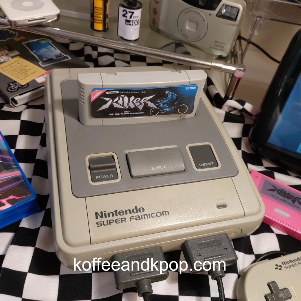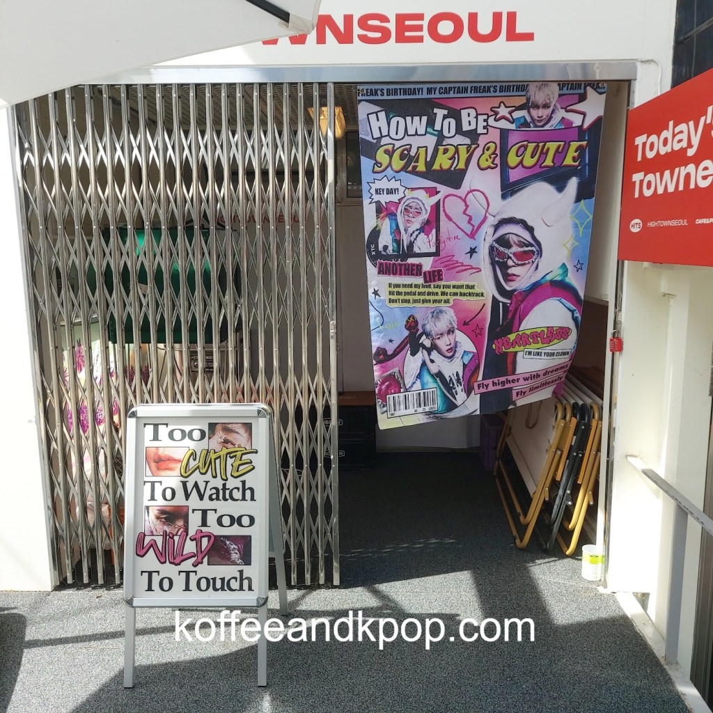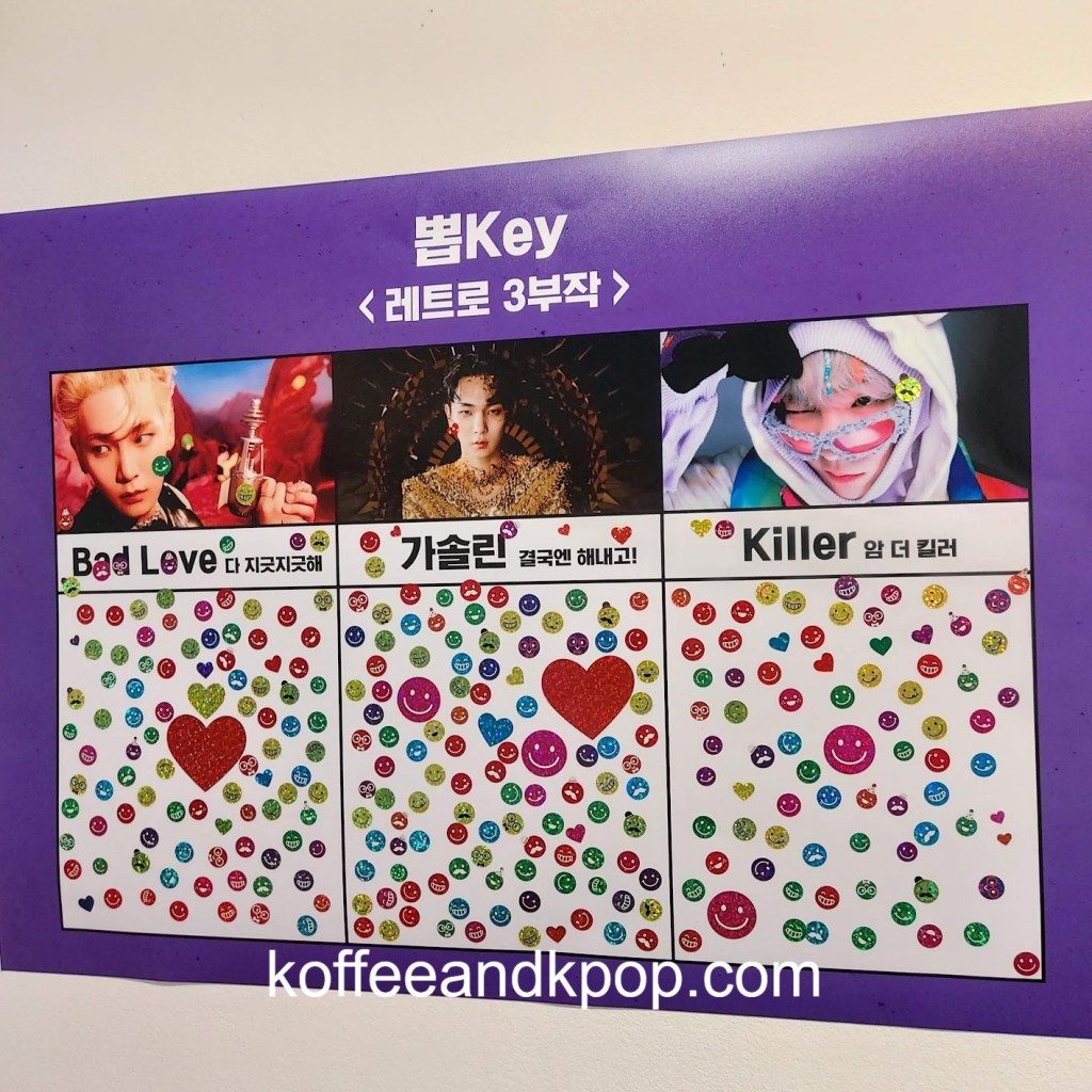 hanging poster and A-frame reading “Too Cute to Watch, Too Wild To Touch”table covered with a black and white checkered cloth, computer monitor, and various pictures and itemspegboard behind the monitor with pictures of KeyBok-sillee, an ipod, a VHS all hanging out on the tablea Nintendo Super Famicom with a disc entered that has a logo for Key’s “Killer” albumclose-up of the “Bad Love” cassette tape“Bad Love” era postersa guestbook was on the table, along with a bunch of stickers you can add to the poster of your favorite version of Key: blonde hair vs. black hair, ball cap vs. beret (black hair and beret seem to have the most stickers)this poster says summer vs. winter, glasses vs lens model (winter and glasses seem to have the most stickers)view of the tiny cafe, filled with people sitting at the few tablesposter reading “Too Cute to Watch Too Wild to Touch”the pouch cold brew I received with a colorful sticker on the front and a paperclip holding a “guest check” that has pink font reading “Am I Scary and Cute?” I really loved this little pouch of cold brew