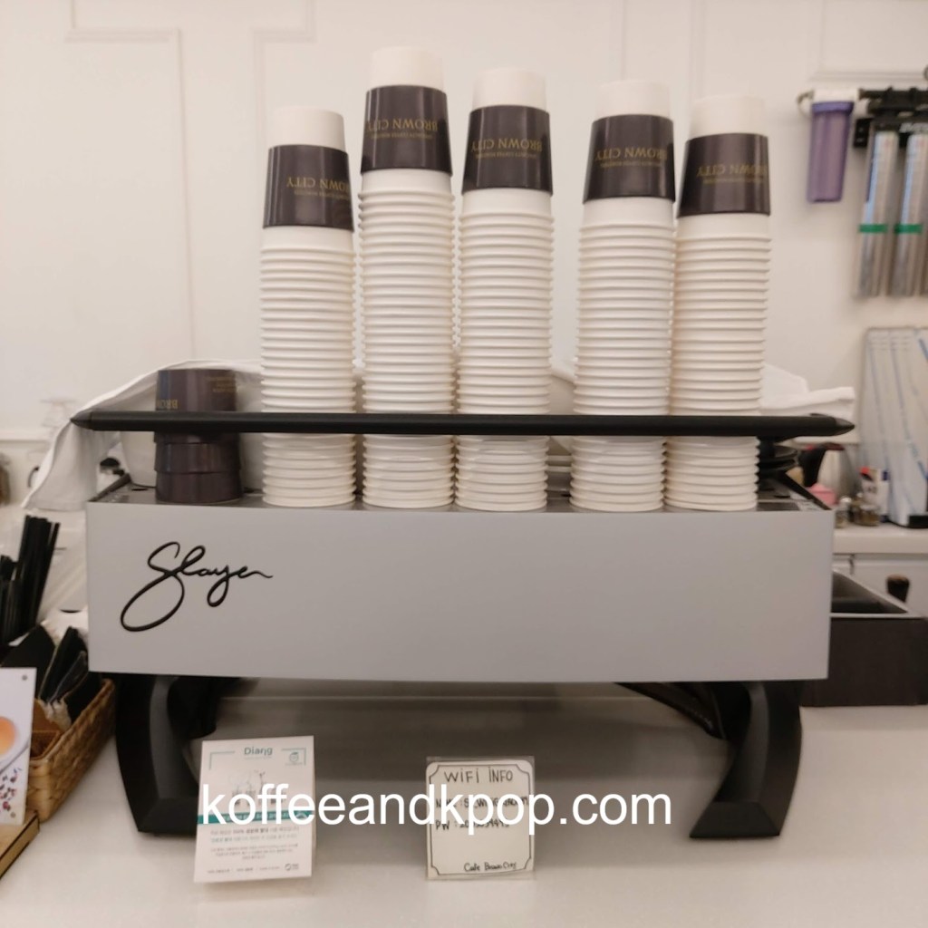 We decided to go to the cafes on Sunday as it would be less busy and my friend was traveling in via bus from Daejeon. Our first stop was Cafe Monggeul Sky Branch (카페몽글 하늘점). This is a popular spot for birthday cafes, judging by the wall of paper birthday cups they had on display and for sale.