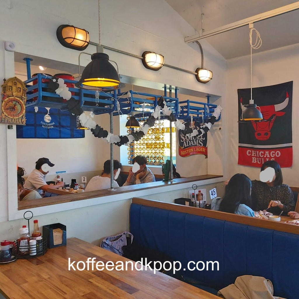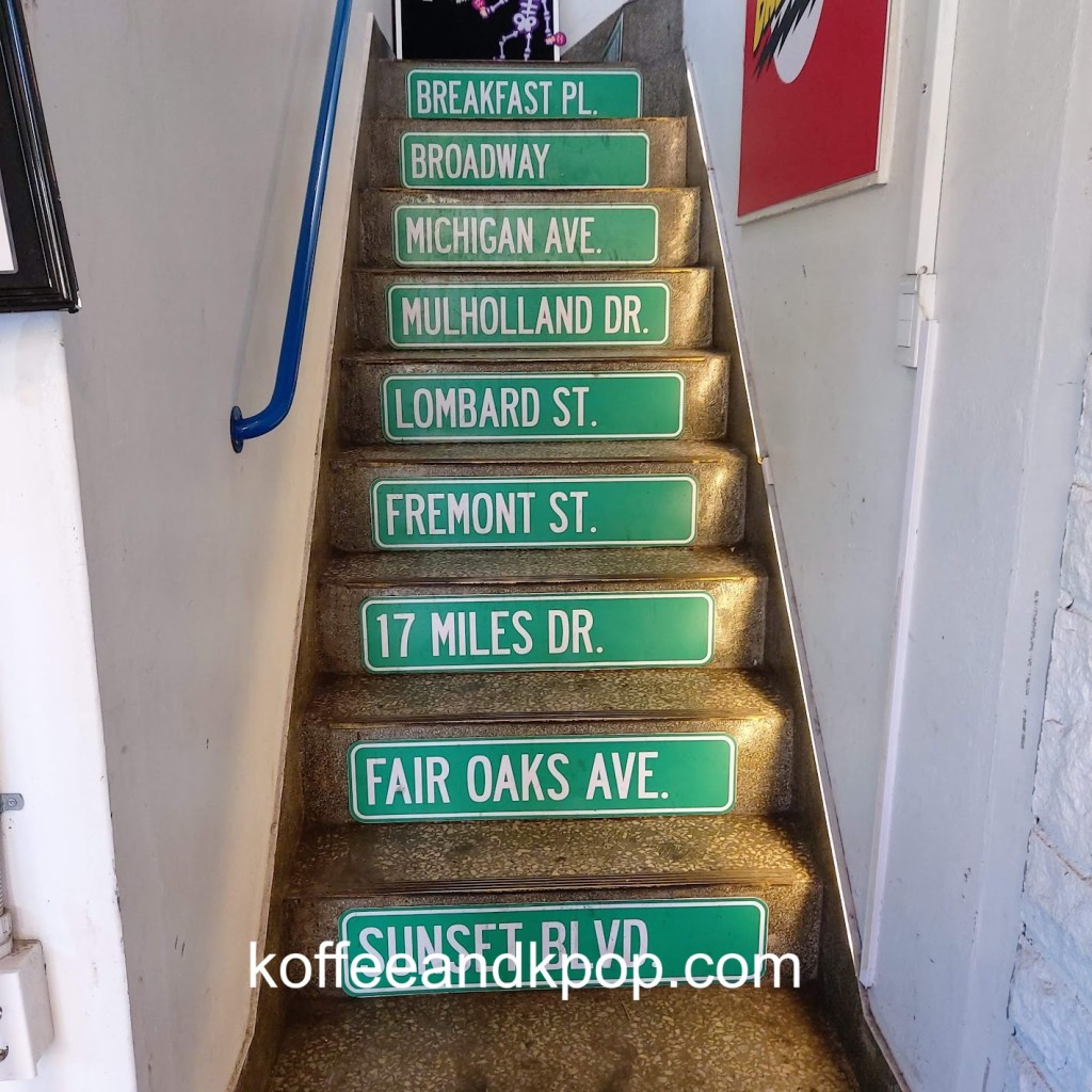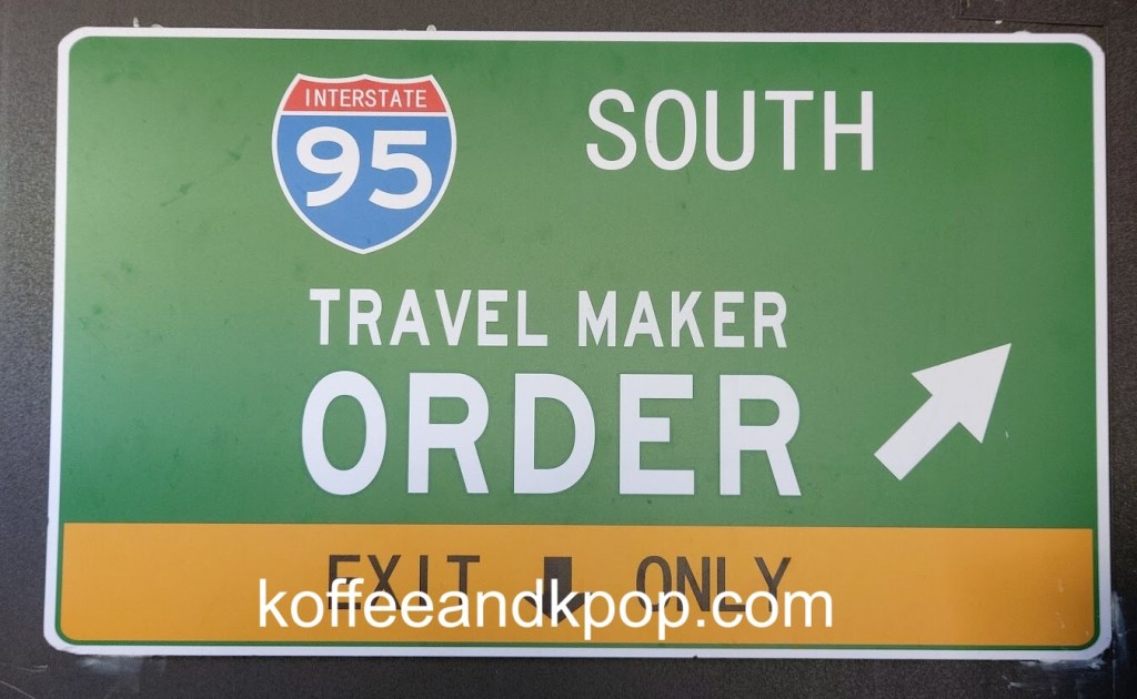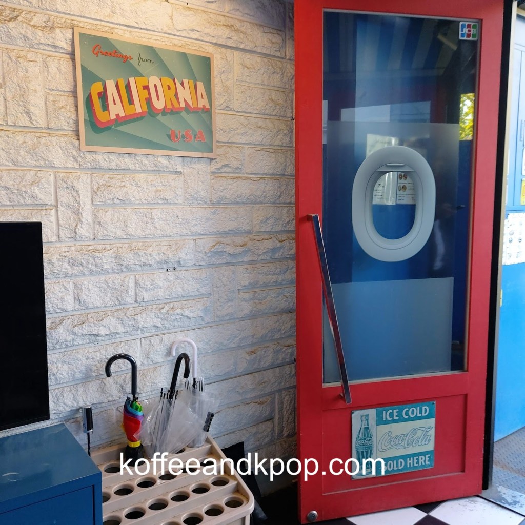 this Interstate 95 South sign makes no sense because it is not in front of an exit and you do not go upstairs to make an order; this is just for decorationmenu posted up outside the restaurant on a blue wall with some American license plates for decorationCatchTable waiting list kiosk next to a computer monitor showing travelmaker_seoul Instagram photosstaircase leading to the restaurant, decorated with famous American street signs in the infamous green with white letteringopen front door of the restaurant with a plane window decal on the glass door; a box for umbrellas is next to the doortwo small tables and four stools for people waiting until their table is readythe restaurant as seen from the street; in blue with white lettering