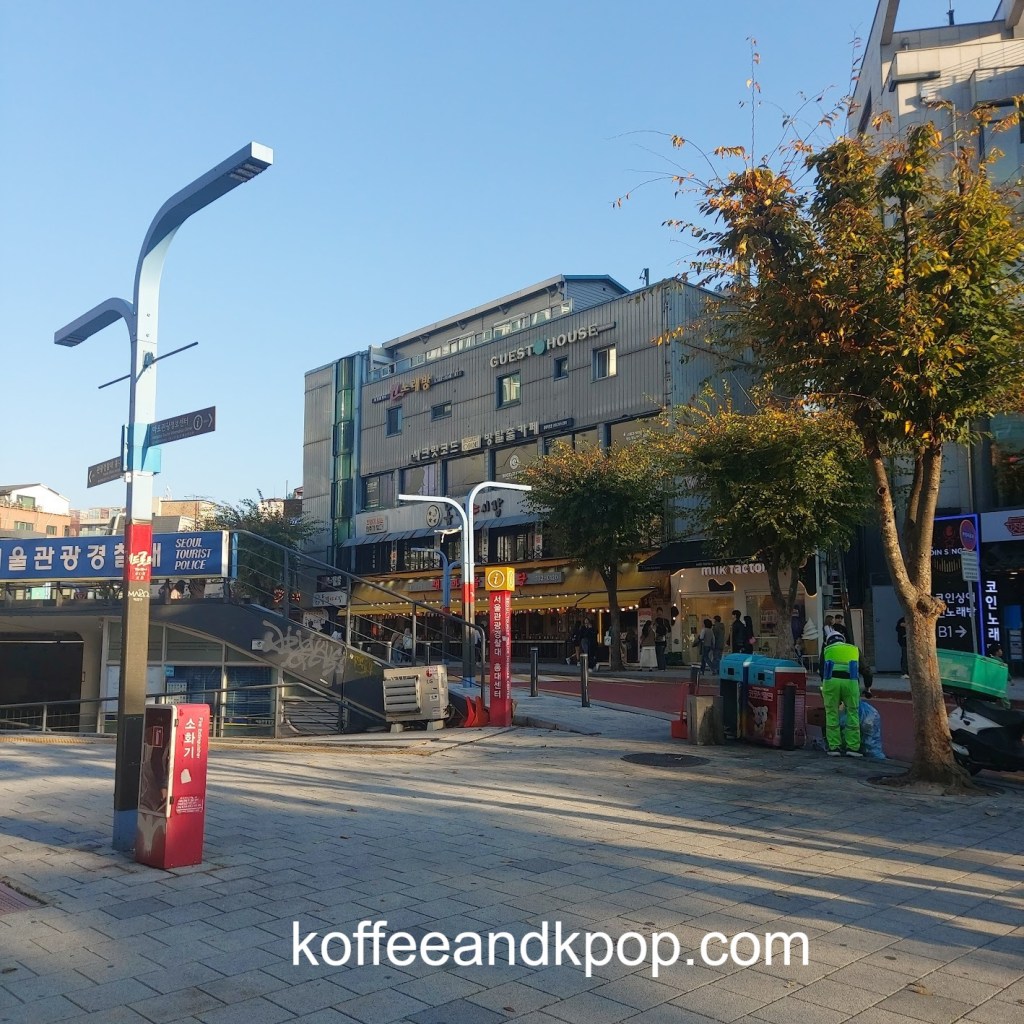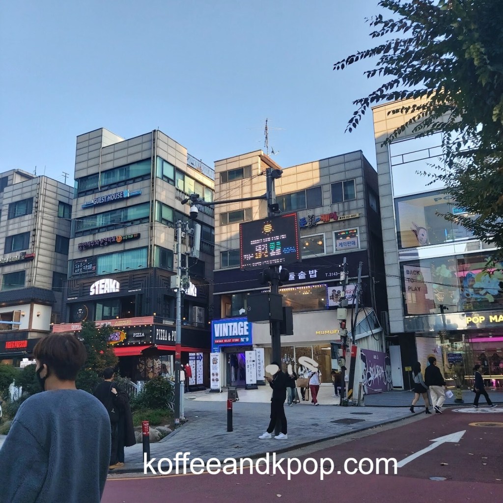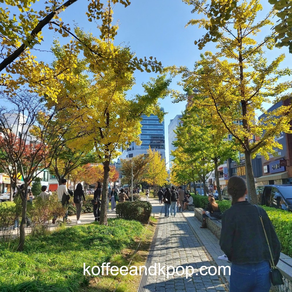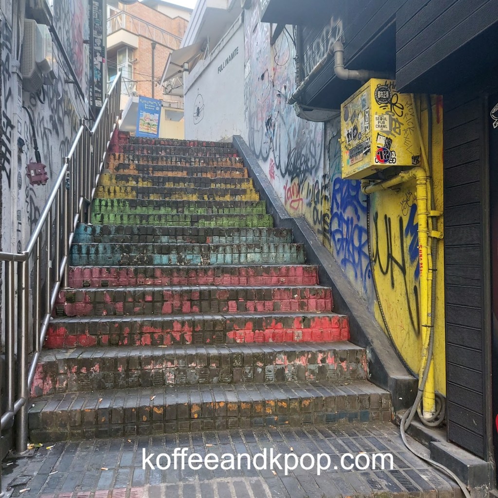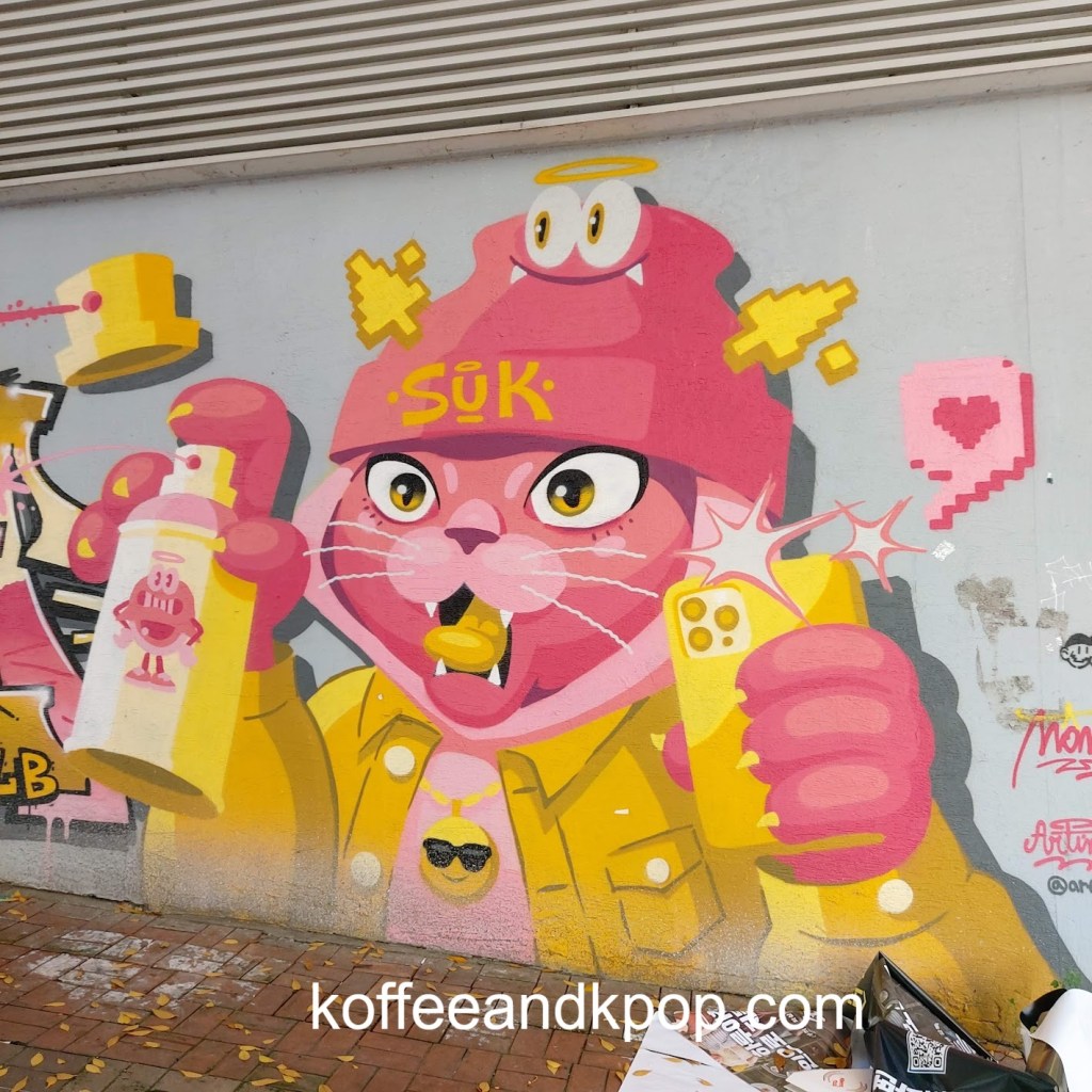 Gyeongui Line Forest Park in the fall with yellow and green leavesCraft Hans, a three story Korean craft beer brewery with balcony covered in plantsa small Buddhist temple (possibly a residence as well?) next to a garish purple building housing a 19+ adult shoplatest Kakao Friends collaboration: Tom and Jerry; Ryan is wearing a Tom suitChunsik wearing a Jerry suit and running away with a sweet potatodirty, yet colorful, trash can on the street, with empty plastic coffee cups sitting on the topsome cool hot pink cat wearing a yellow shirt holding a spraypaint can in one hand and a cell phone in the other graffiti artworkwavy designed buildingstaircase painted in faded rainbow progression; the walls are covered in graffiti tagshere are signs saying that if you want to busk here, you need to register; there are many spaces to sit and perform herethis image makes me believe this is “Red Road,” which was recently converted into pedestrian-only trafficanother view of Red Road; I tried to get a picture of the digital sign that read the temperature and air quality index but it glitched on camerahandmade craft fair along Red Roadfront of a pork belly restaurant with a lit up sign in Hangul, a staircase just inside the door, and Jinro Pinky, the large pink frog mascot of Jinro soju sitting outsideanother view along Red Roadblue vertical subway sign for entrance 7 of Hongik University Station, serving 3 linescute painted tiles in the subway station of a giant pink heart and the words “with you” in yellow handwriting on blue tiles