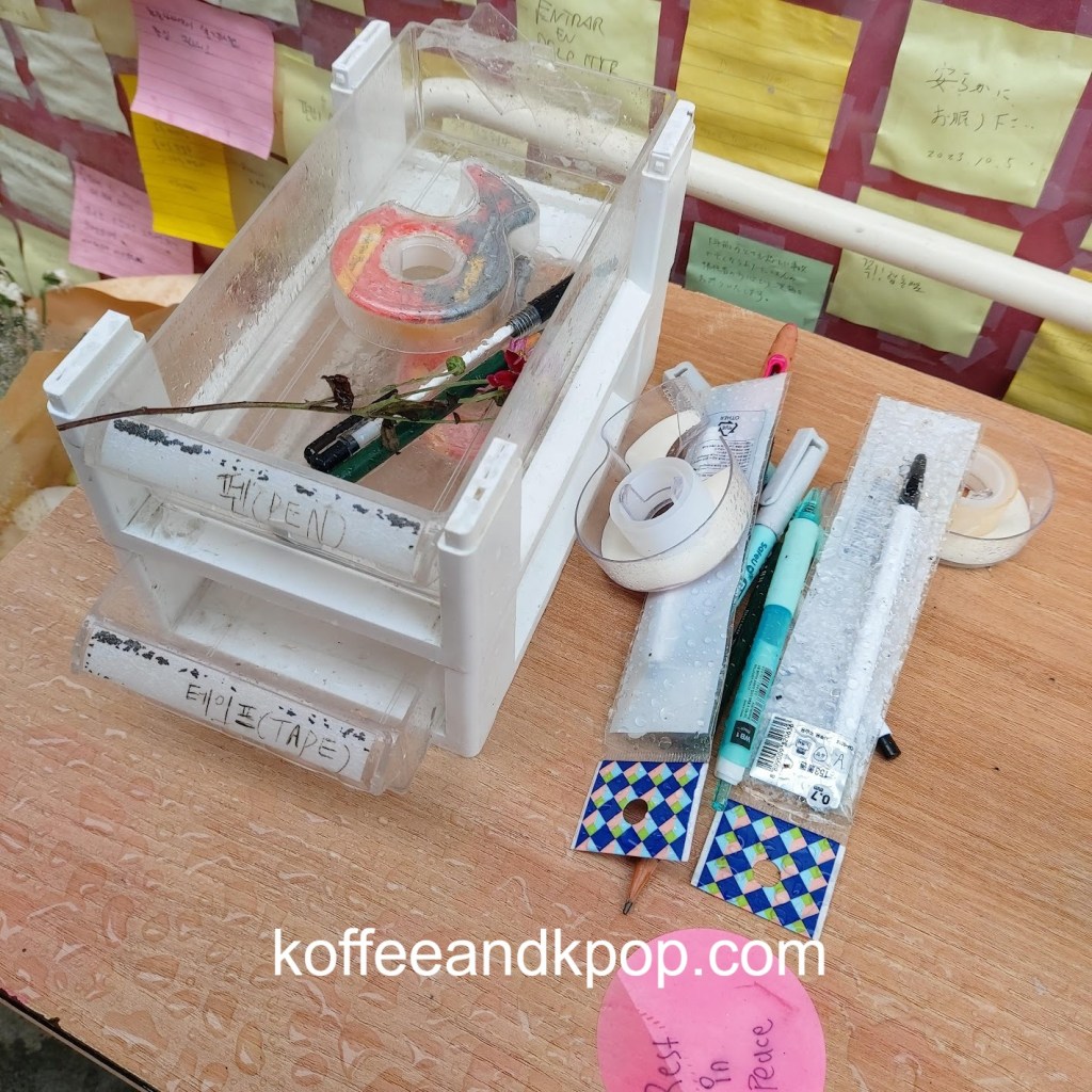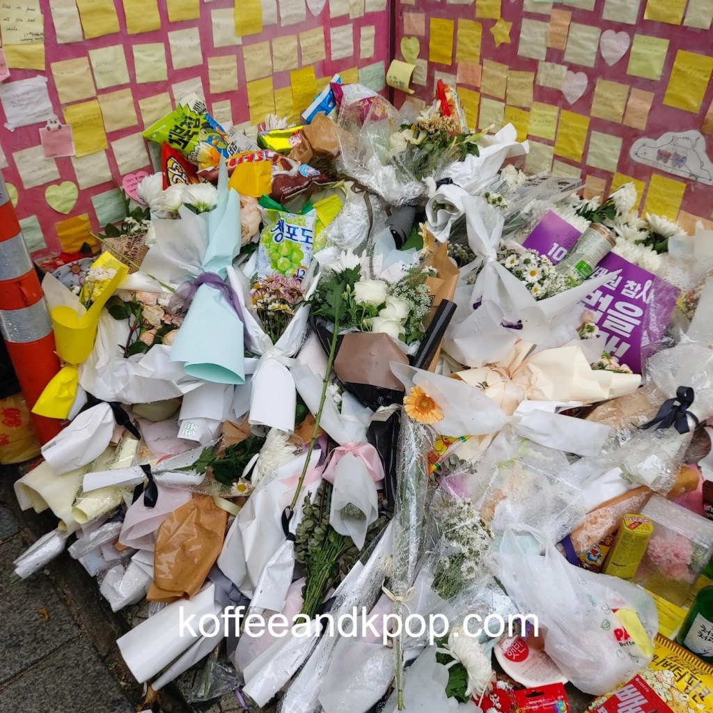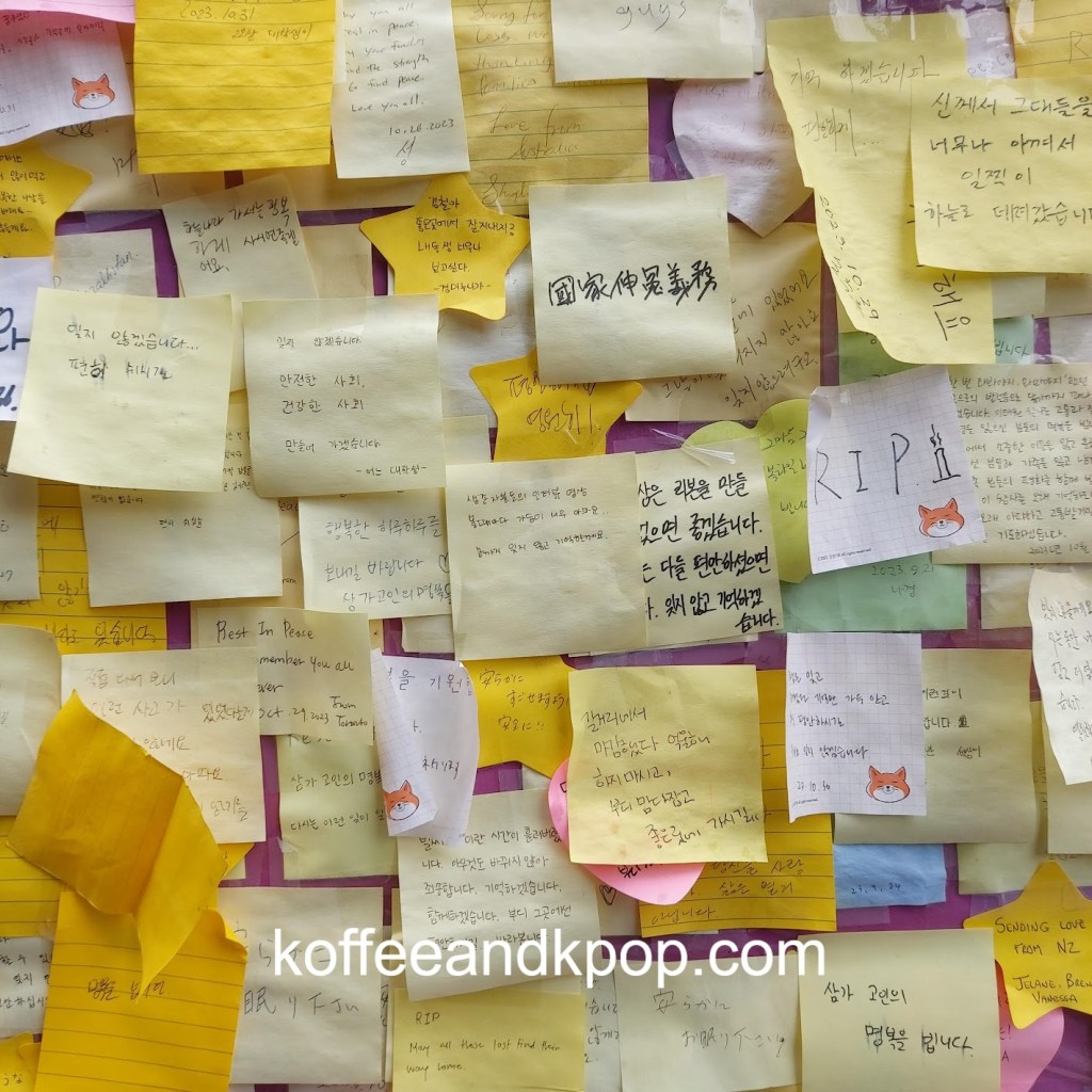 A year later, the makeshift memorial, now with some permanent pieces, still stands. Multi-colored post-it notes flutter in the rain with notes written in languages from all over the world. Rain drops drip down the necks of bottles of soju and collect on the plastic packaging of shrimp chips. The pile of fresh flowers laid by a corner of the memorial is a foot deep.