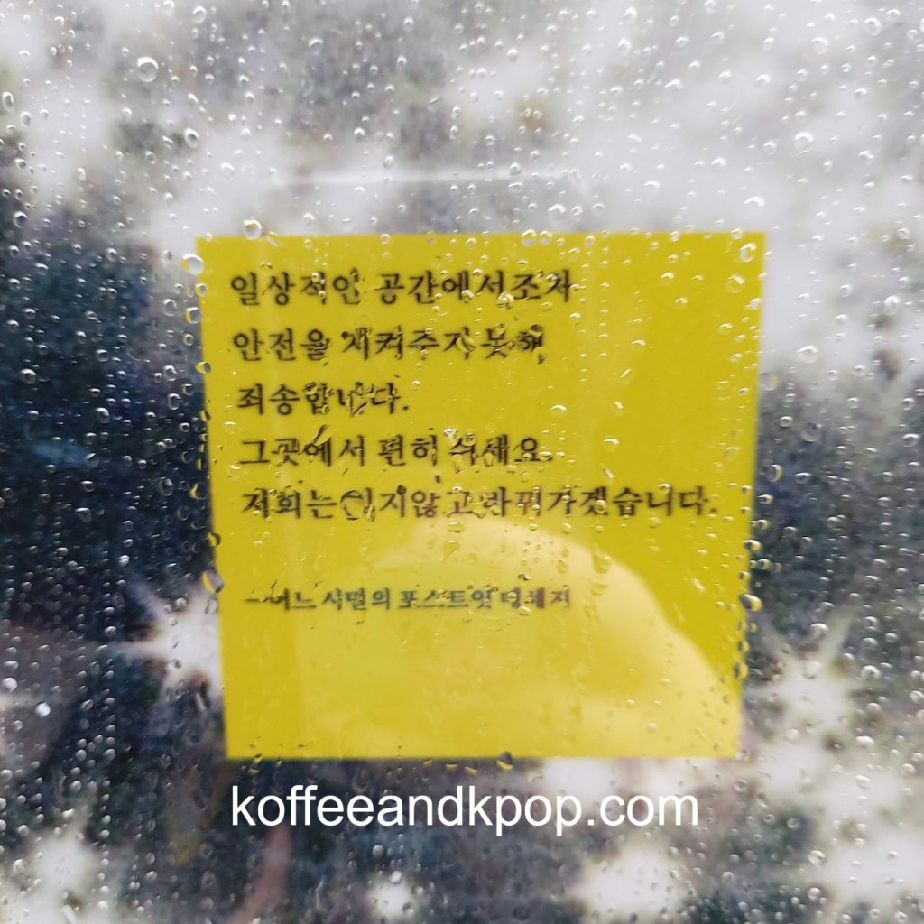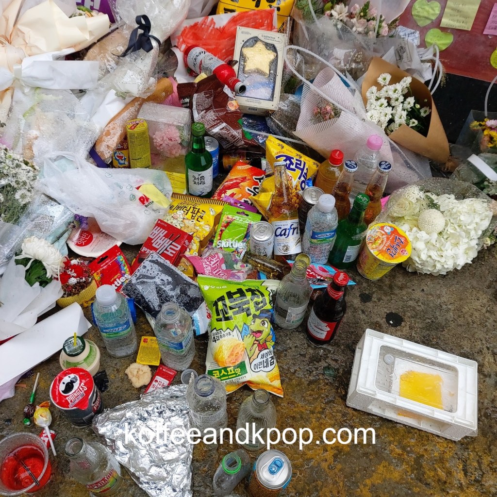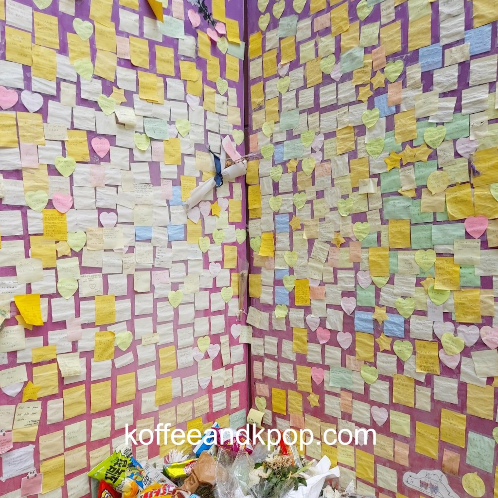 A year later, the makeshift memorial, now with some permanent pieces, still stands. Multi-colored post-it notes flutter in the rain with notes written in languages from all over the world. Rain drops drip down the necks of bottles of soju and collect on the plastic packaging of shrimp chips. The pile of fresh flowers laid by a corner of the memorial is a foot deep.
