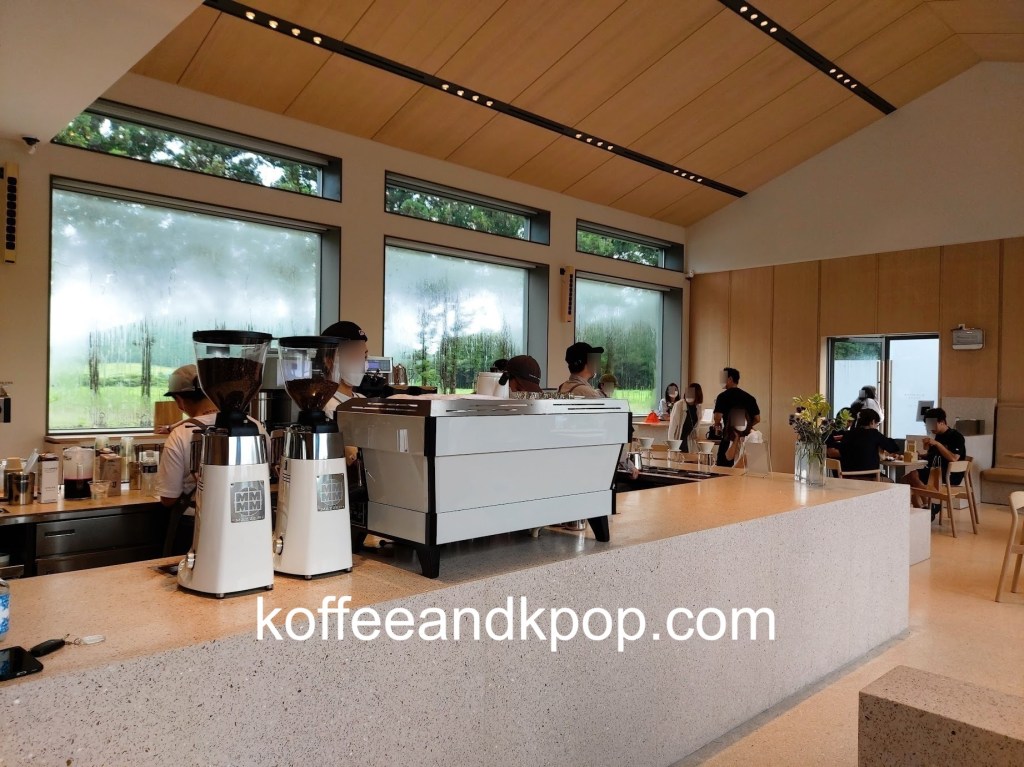 Blue Bottles everywhere are all the same and yet all different. As each cafe is designed for the space in which it exists, this Blue Bottle had a beautiful open window into the Jeju countryside and a barn-like structure with a high, triangular ceiling fit with strips of lighting. All of the chairs and tables were that recognizable light wood, and there was built-in cabinetry under all of the display shelves.