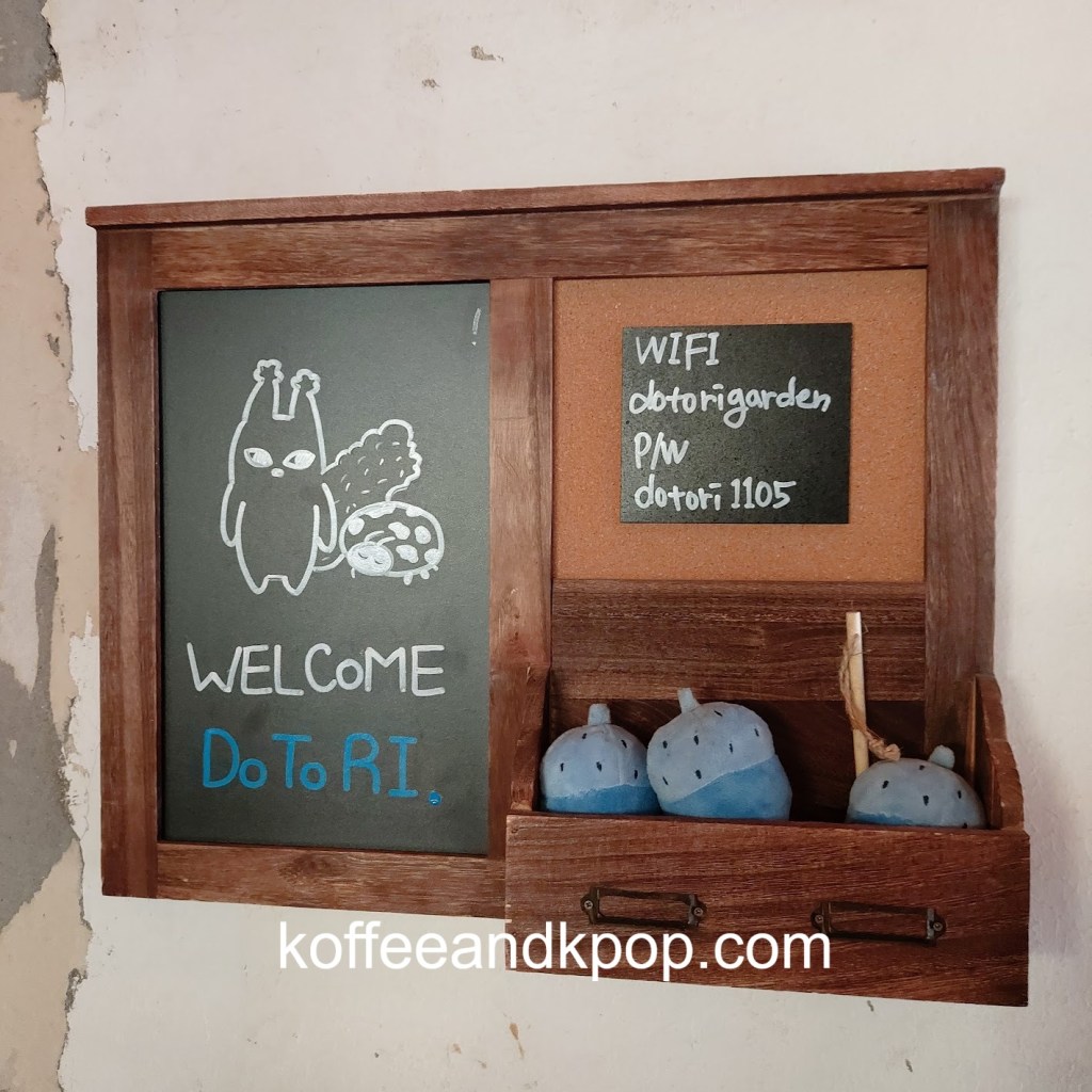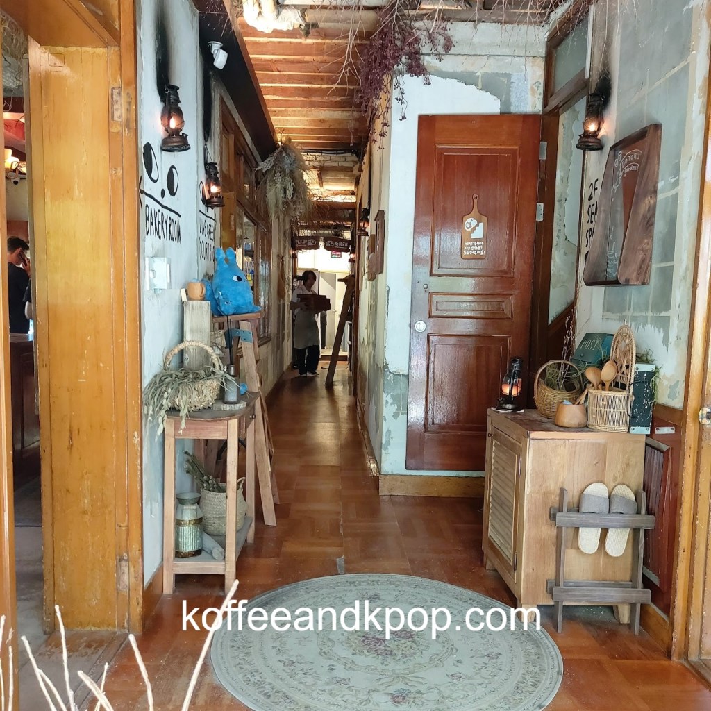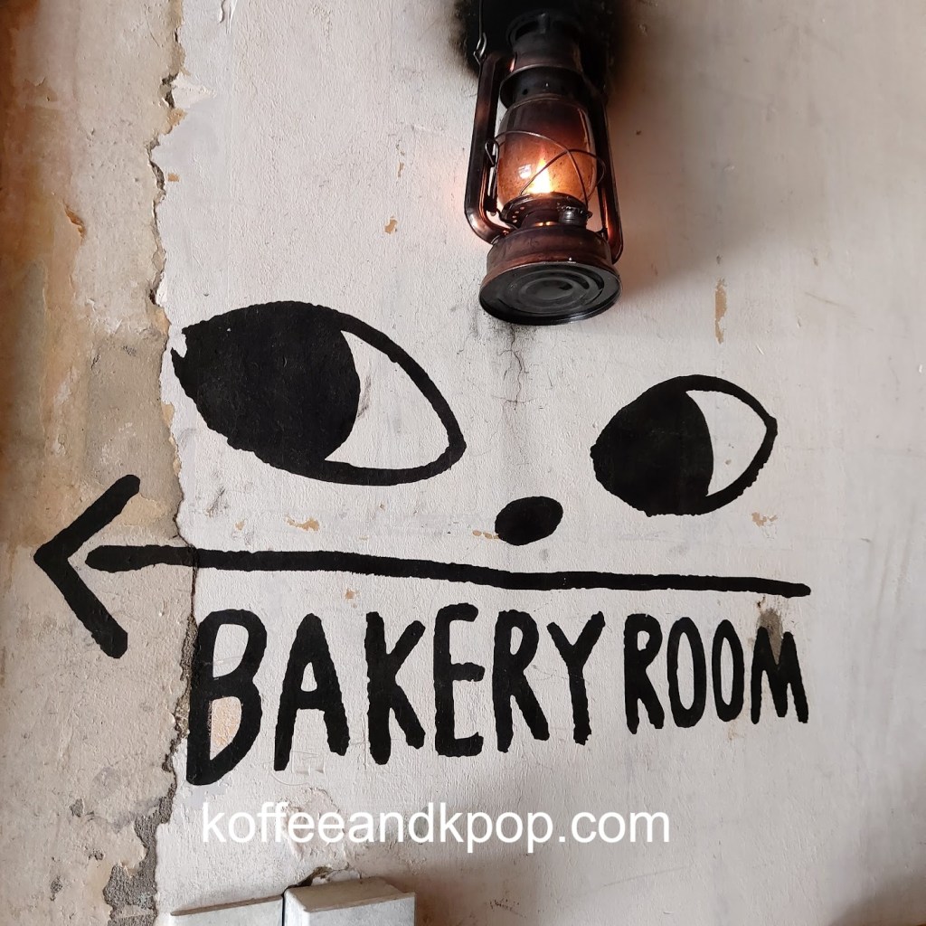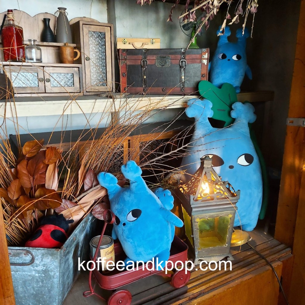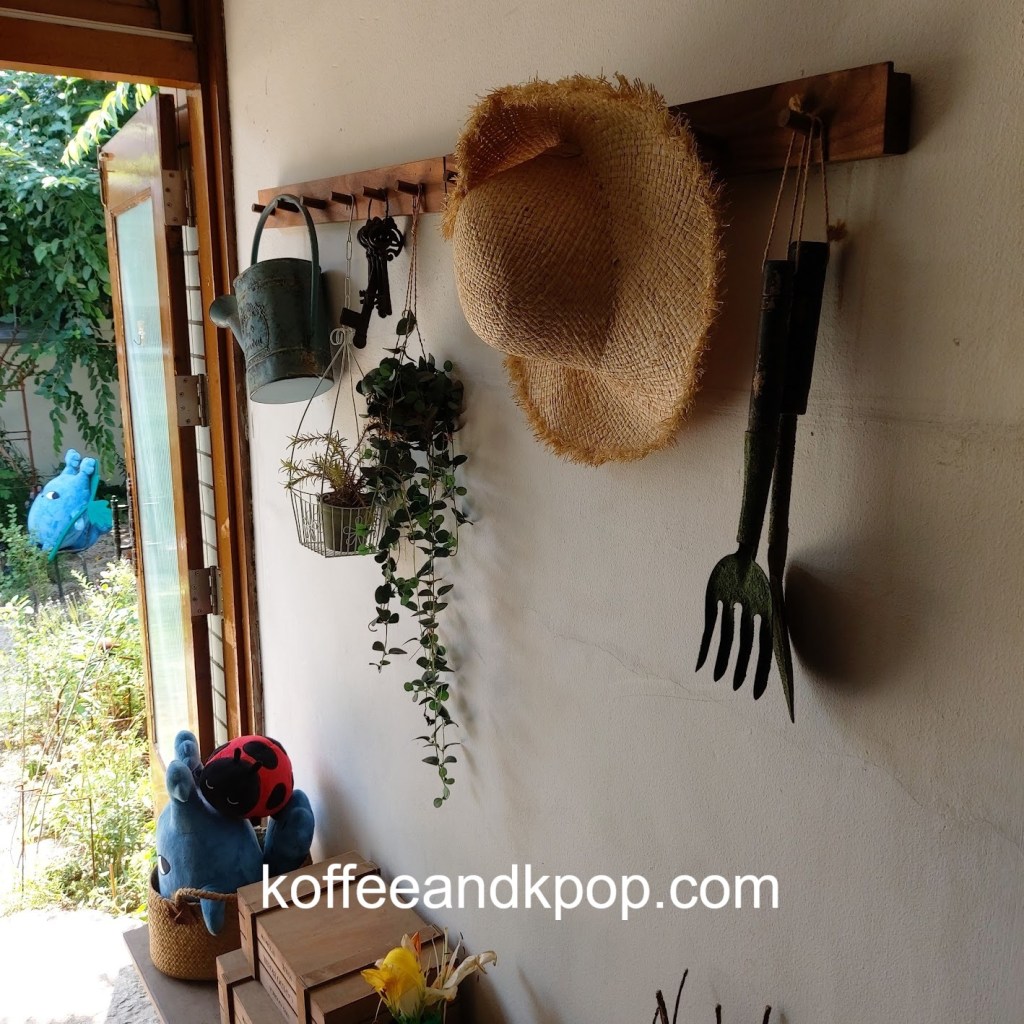 gardening supplies hanging upcaneles while I wait for my buzzer to go off for my brunchDotori character hanging outsideview of the first floor upon enteringstuffed Dotori character next to a colorful stained glass lampcomfy couch in a cornerseriously, the stuffed plushies are everywherecute bookshelfanother cute bookshelf next to a grandfather clockwelcome chalkboard with wifi passworda pair of almond-shaped eyes painted on the wall with the word “return” underneath an arrowa pair of almond-shaped painted eyes on a wall with the word “bakery room” underneath an arrowcozy second floor vibesmore cozy vibesbeautiful round tiled flooroutdoor area with, you guessed it, another stuffed plushiesunset view from the main street; Namsan Tower can be seen in the distance