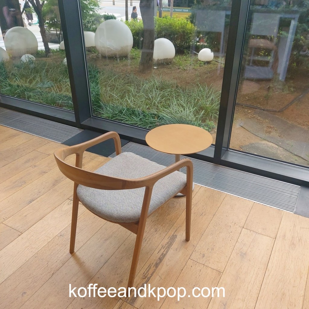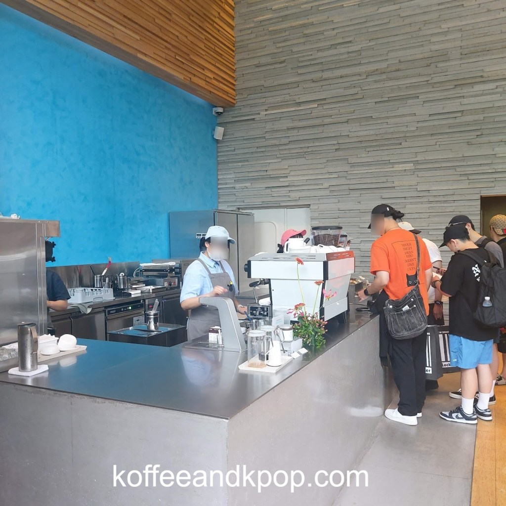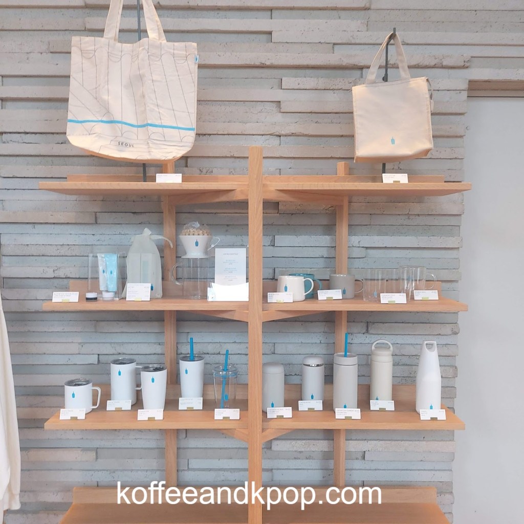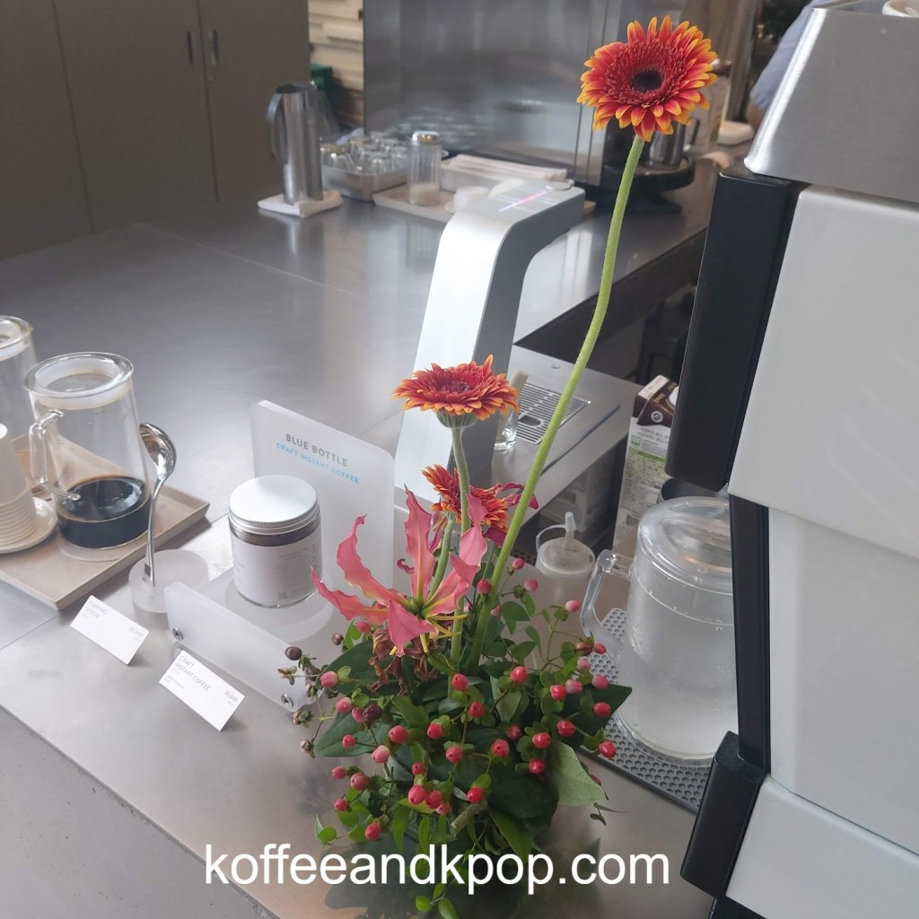 Located on the first floor of the Ryse hotel, the Blue Bottle in Hongdae has a unique set-up. In addition to tables, there is built-in seating along the stairs, and the iconic Blue Bottle image reflects a blue wall behind the espresso bar as well as a blue art installation hanging from a skylight.