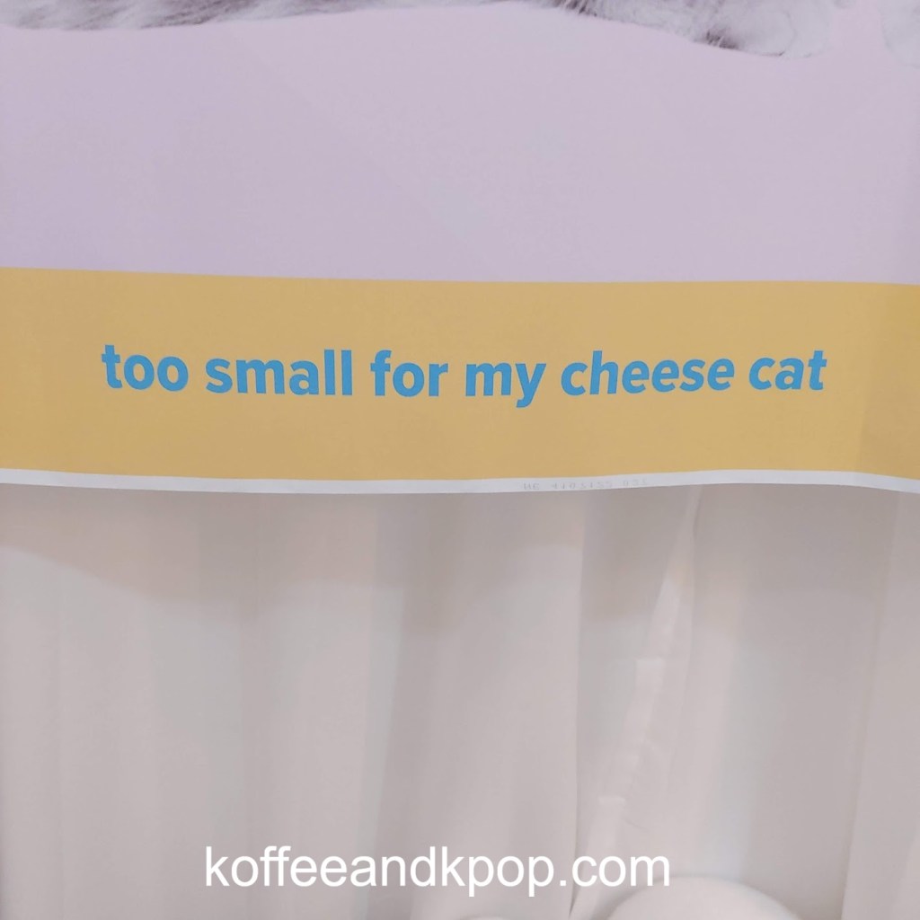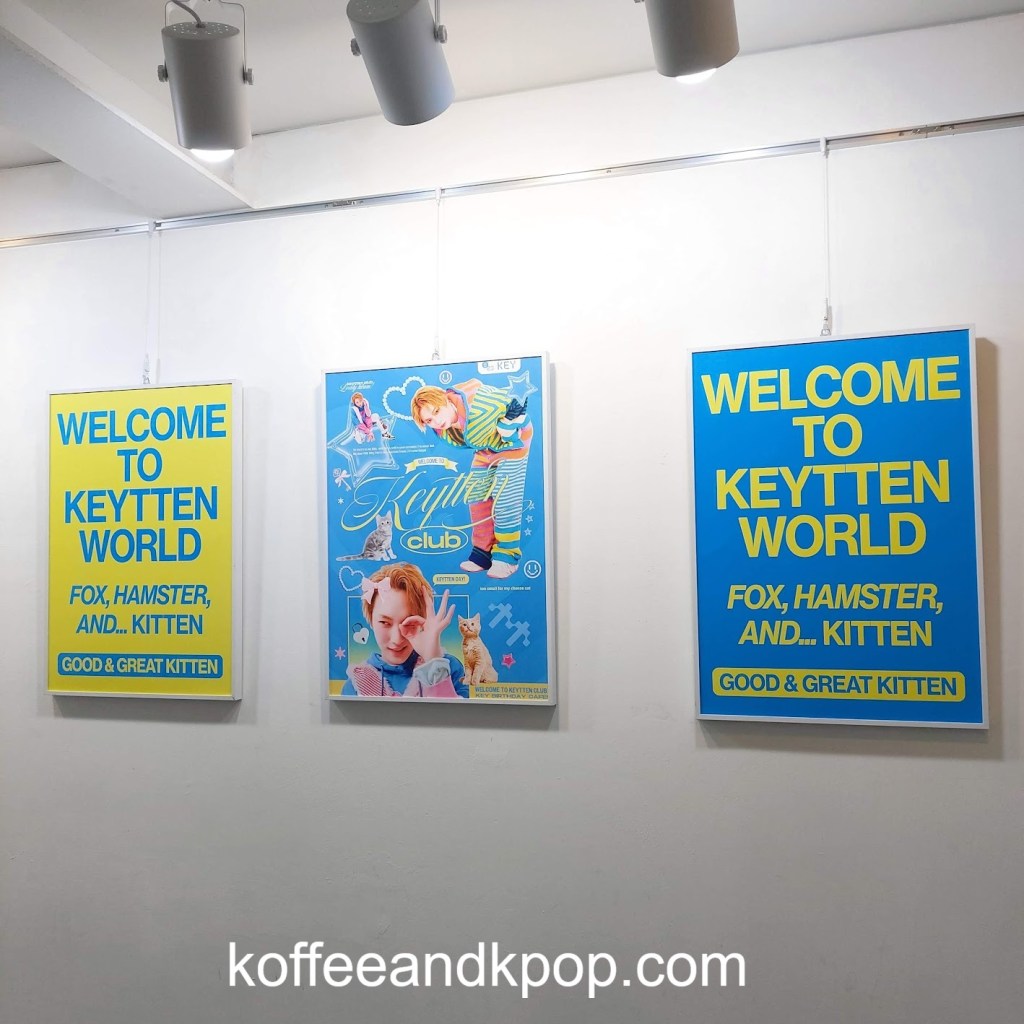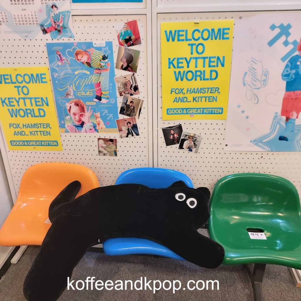 poster outside the cafe“Welcome to Keytten World” in blue and yellowcomputer display and cute postergacha machine prizes… of course I got my least favorite oneposter in the gacha roomphotos on the wallwall covered in posters with an orange, blue, and green chair in front with a large strange stuffed black cat lying across the seatsI was disappointed I couldn’t sit here and take a picture with the cat and wallmore of the cafeanother viewanother place you couldn’t sit“too small for my cheese cat”one of my favorite pictures of Keypin board with four photosthe paper cups you received, along with some cat plushiestable featuring the blue and yellow postersphotos with a black cat plushiephotos on top of an orange cratethe goodies next to a fake aquarium: cold brew, paper cup, calendar, postcard, photocard, two bookmarksBoksilee cookie