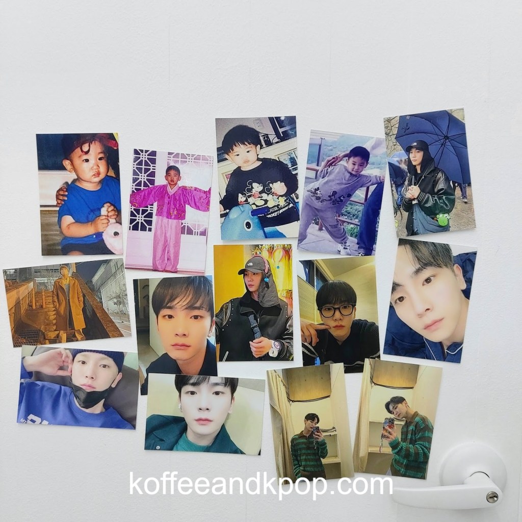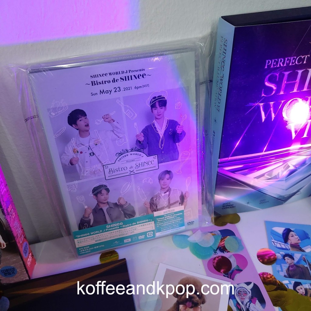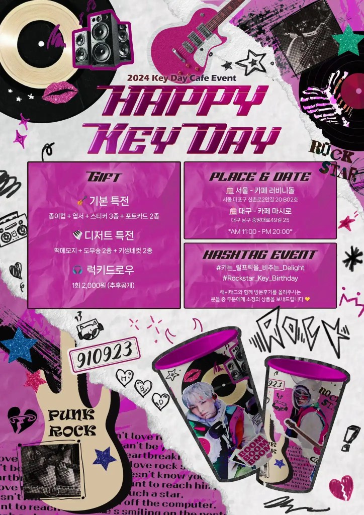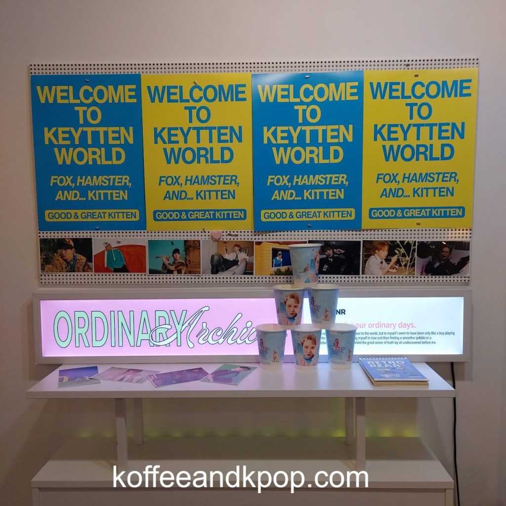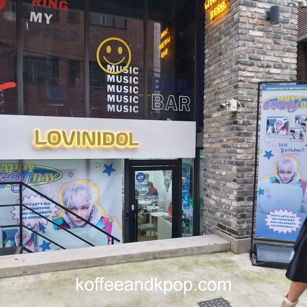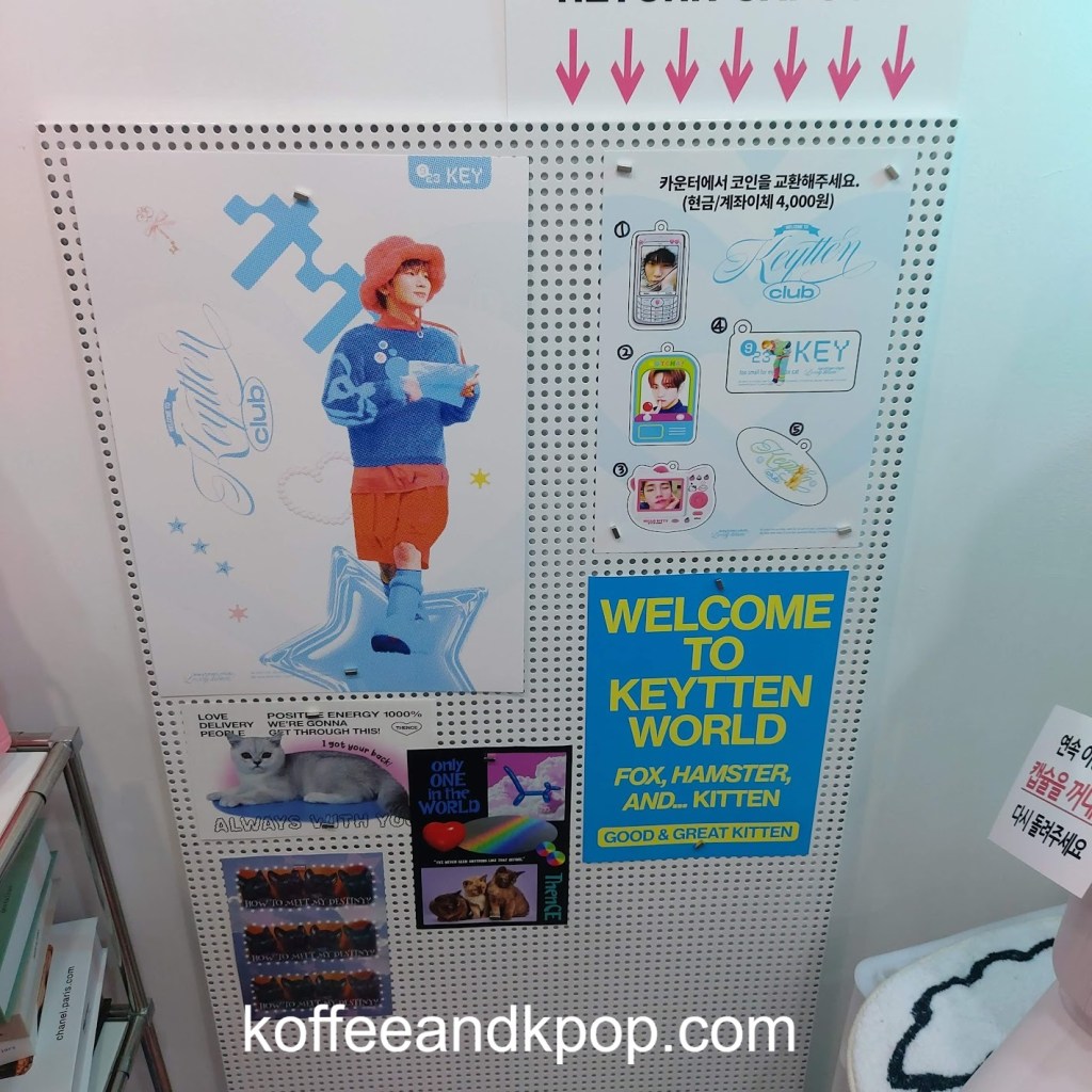 entrance to the cafeposter out front of the cafeheart collage made out of photos of KeyKey poster on a window facing several tables and chairsdisplay of some albums and photobooksmore of the displayShinee World, the first concert DVDBistro de Shinee DVDHappy Key Daymore photos of Keystack of paper cups in the cornerphotos of Key on a tabledisplay on the side of the cash registerframed photos of Key on the wallblue lemonade, two boksilee cookies (vanilla and chocolate), photocards, postcard, and paper cup