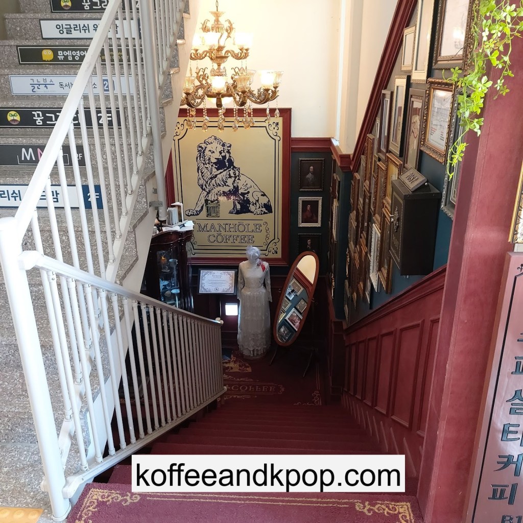 Manhole Coffee wooden sign over the staircase leading downstairsview downstairsclassy Manhole Coffee rugManhole Coffee poster of a regal lionmannequin torso wearing a white dressthe first landing of the stairsmannequin torso wearing a blue suit topframed photos of various British things, such as the Beatles, and several kings