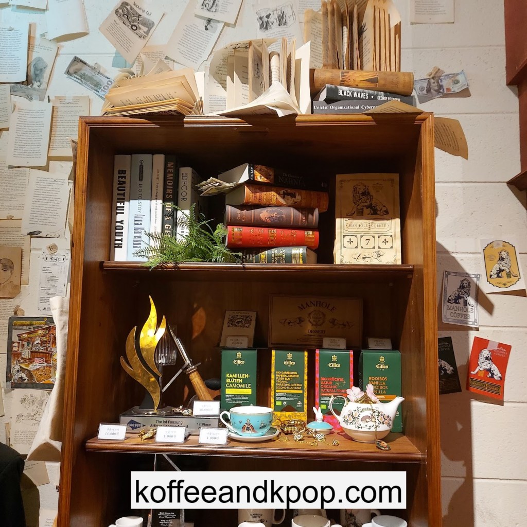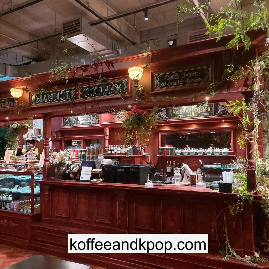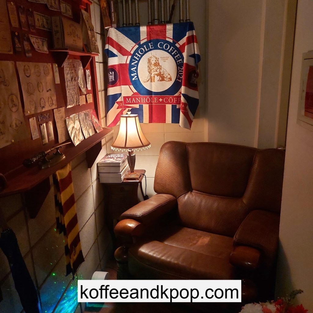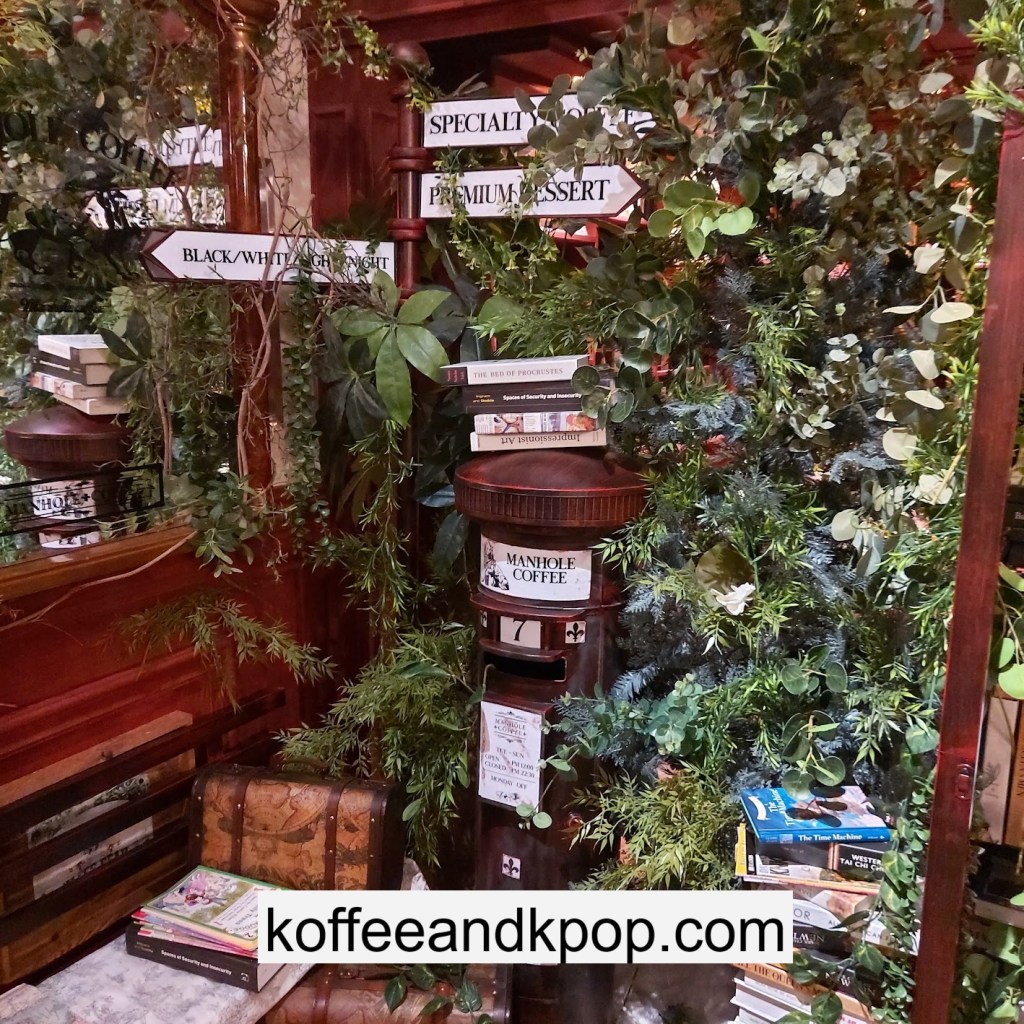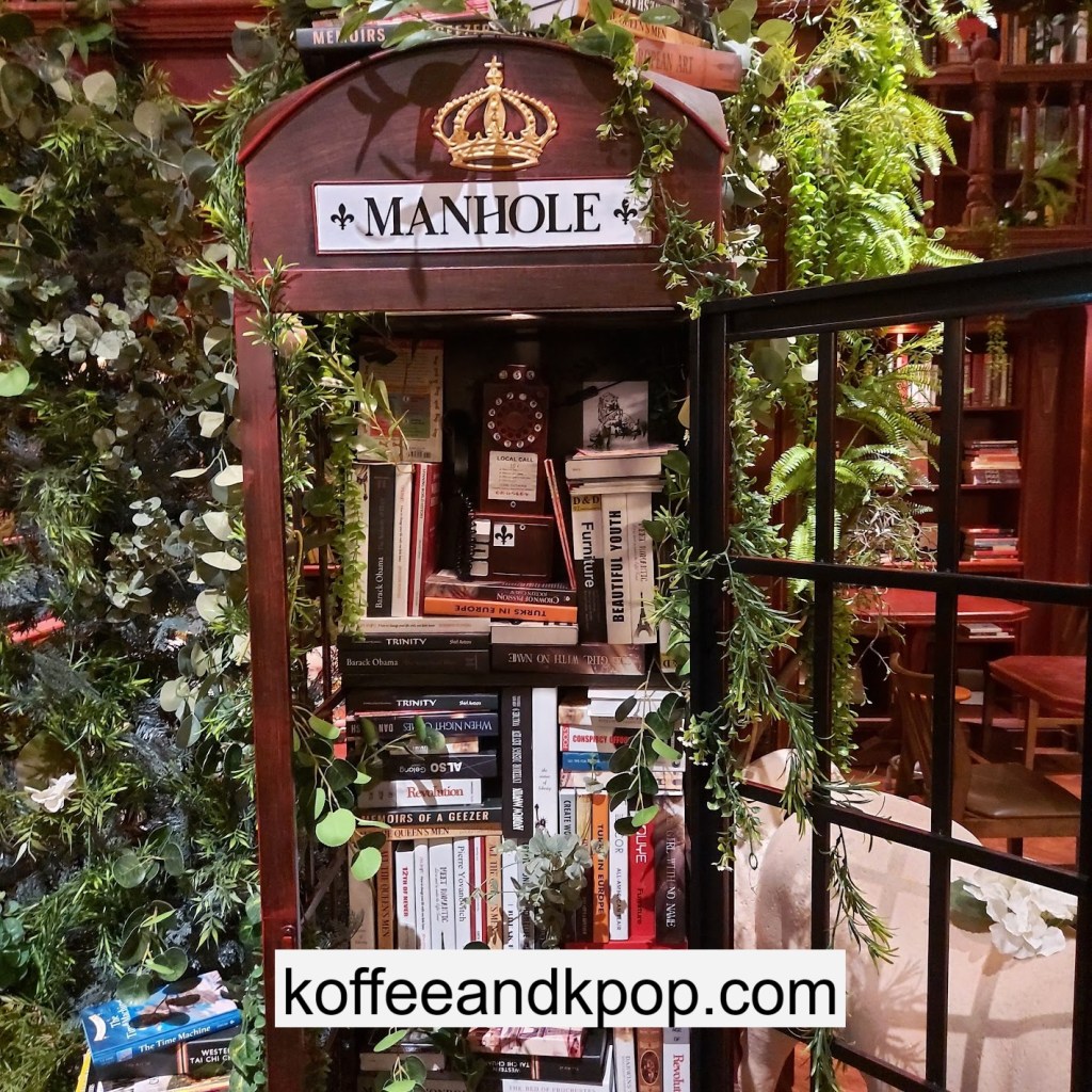 the coffee barcrystal chandelier over a large tableworking fountain with angellots of fake leaves, candles, and a wooden deer head posted on the wallchess game, sadly for display onlymirror, lamp and more framed photos of royaltythe second “floor” which is not real, and all the books from floor to ceilingdisplay of various objects including a telephone and bottle of some kind of (fake) alcoholquill pen and glass bottle of (fake) alcoholthe British telephone booth, full of booksstreet signs and lots of fake plantsBritish post office box with Manhole Coffee’s hours listedtelephone inside the telephone booth, surrounded by bookstwo seated table near the bookcaseanother view of the large tableanother view of the bookcasethe bookcase again; I was sad I couldn’t go up thereclose-up of the bookshelvestable of random things for sale, with some melted candles as wellpianomelted candles on the pianobulletin board above the piano filled with business cards pinned to ita brown leather chair and lamp under a flag featuring Manhole’s logo, oddly in the hallway just outside the toiletssleek black roastershelf with things for sale, as well as some booksanother shelf of things for sale, such as cups and teabook pages pinned to the wallmannequin torso of a black suit and hatred flowers beside the ordering kioskview of the space as a wholelarge wooden gear clock with lots of fake plants