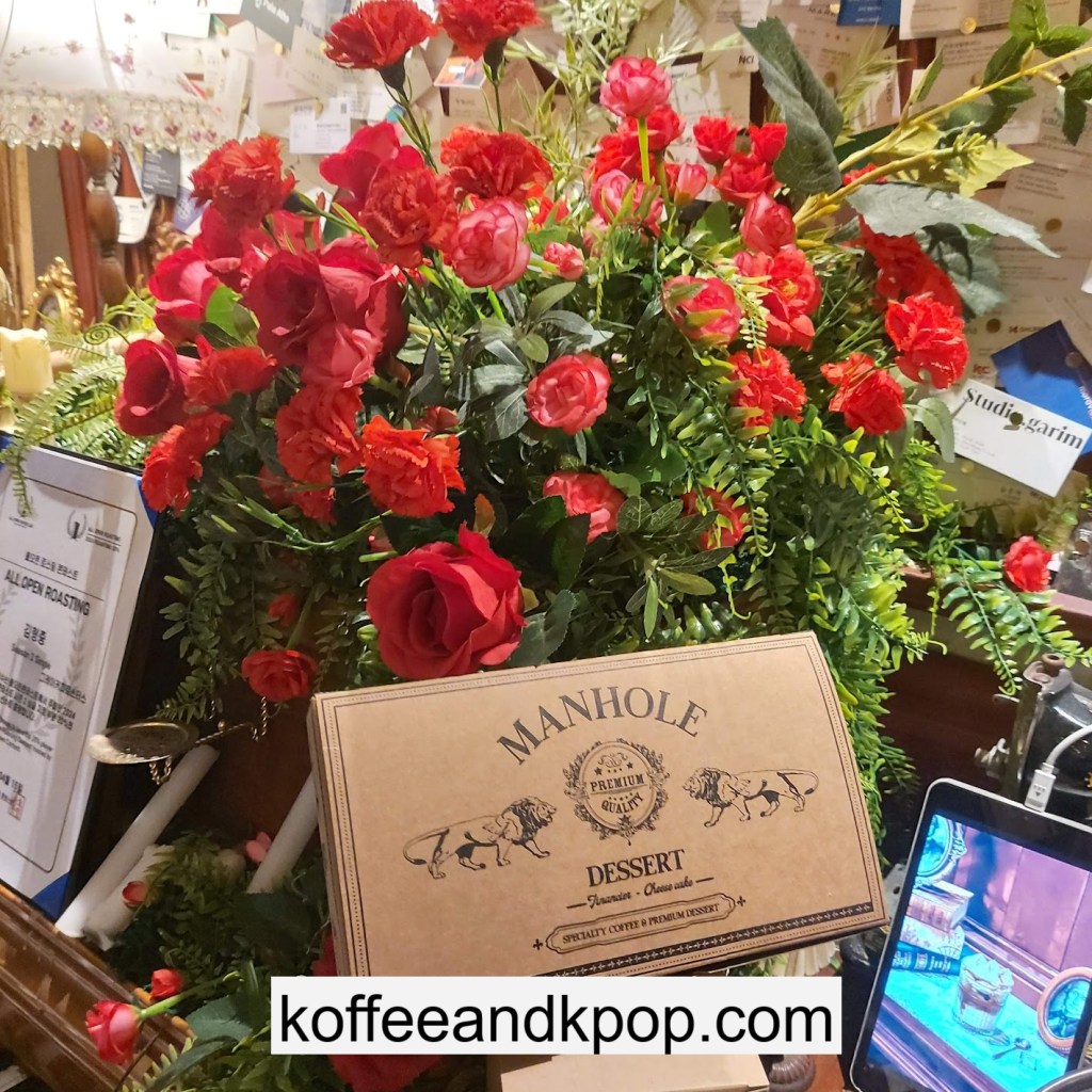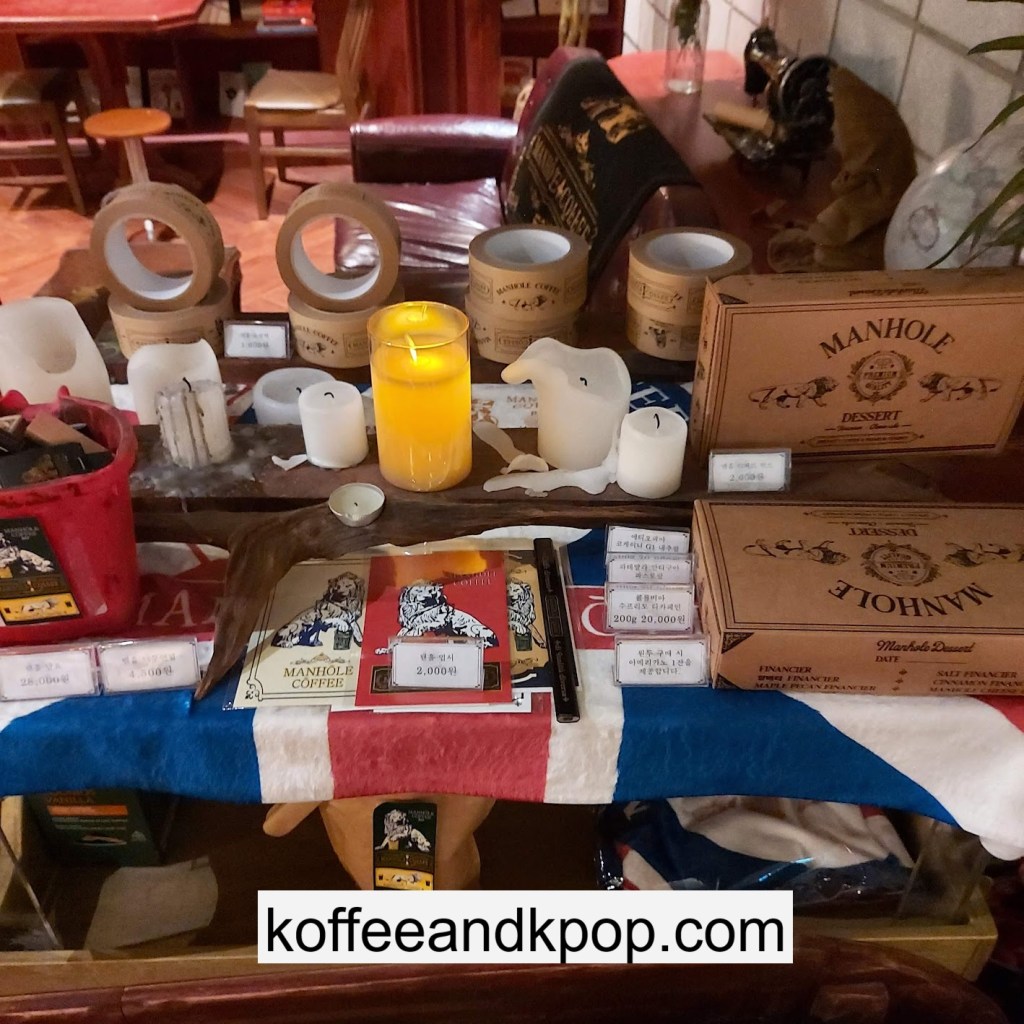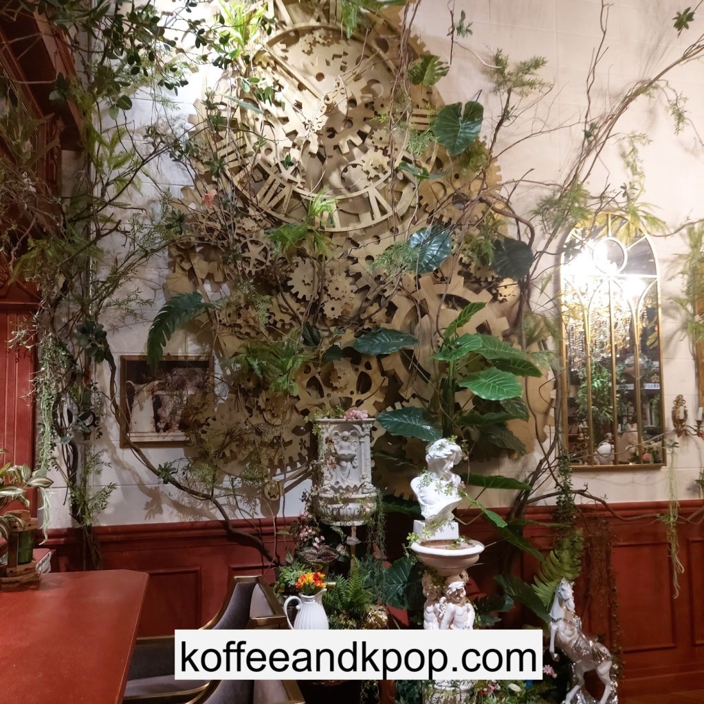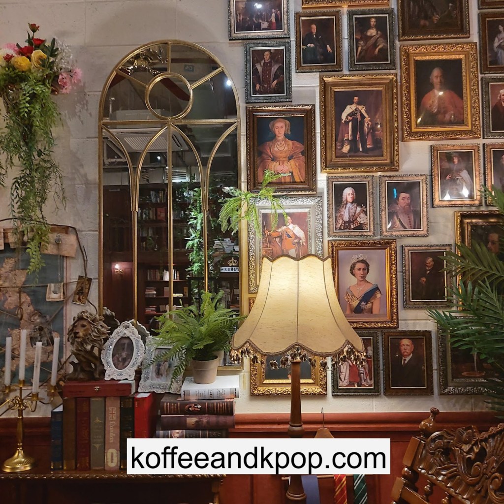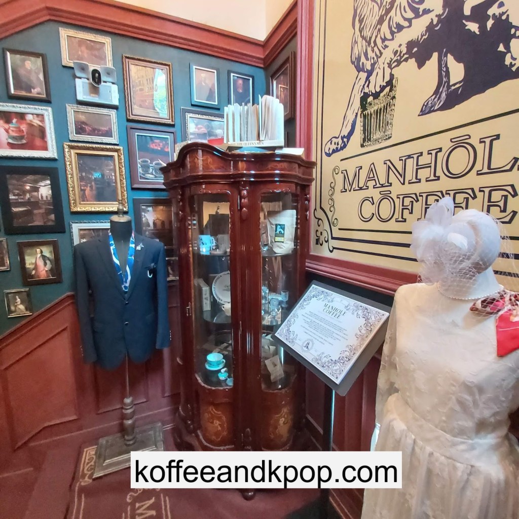 the coffee barcrystal chandelier over a large tableworking fountain with angellots of fake leaves, candles, and a wooden deer head posted on the wallchess game, sadly for display onlymirror, lamp and more framed photos of royaltythe second “floor” which is not real, and all the books from floor to ceilingdisplay of various objects including a telephone and bottle of some kind of (fake) alcoholquill pen and glass bottle of (fake) alcoholthe British telephone booth, full of booksstreet signs and lots of fake plantsBritish post office box with Manhole Coffee’s hours listedtelephone inside the telephone booth, surrounded by bookstwo seated table near the bookcaseanother view of the large tableanother view of the bookcasethe bookcase again; I was sad I couldn’t go up thereclose-up of the bookshelvestable of random things for sale, with some melted candles as wellpianomelted candles on the pianobulletin board above the piano filled with business cards pinned to ita brown leather chair and lamp under a flag featuring Manhole’s logo, oddly in the hallway just outside the toiletssleek black roastershelf with things for sale, as well as some booksanother shelf of things for sale, such as cups and teabook pages pinned to the wallmannequin torso of a black suit and hatred flowers beside the ordering kioskview of the space as a wholelarge wooden gear clock with lots of fake plants
