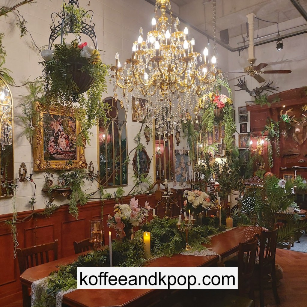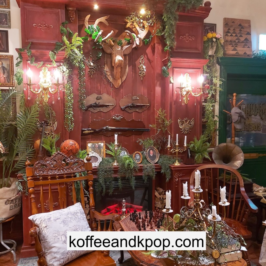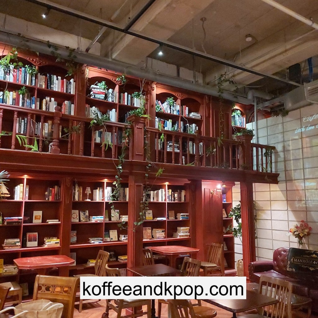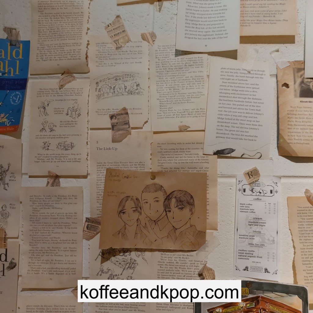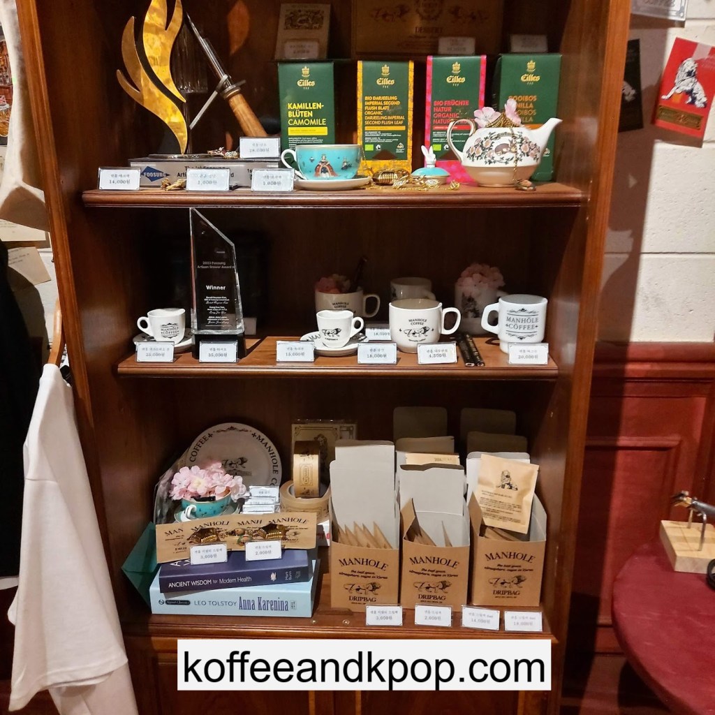 the coffee barcrystal chandelier over a large tableworking fountain with angellots of fake leaves, candles, and a wooden deer head posted on the wallchess game, sadly for display onlymirror, lamp and more framed photos of royaltythe second “floor” which is not real, and all the books from floor to ceilingdisplay of various objects including a telephone and bottle of some kind of (fake) alcoholquill pen and glass bottle of (fake) alcoholthe British telephone booth, full of booksstreet signs and lots of fake plantsBritish post office box with Manhole Coffee’s hours listedtelephone inside the telephone booth, surrounded by bookstwo seated table near the bookcaseanother view of the large tableanother view of the bookcasethe bookcase again; I was sad I couldn’t go up thereclose-up of the bookshelvestable of random things for sale, with some melted candles as wellpianomelted candles on the pianobulletin board above the piano filled with business cards pinned to ita brown leather chair and lamp under a flag featuring Manhole’s logo, oddly in the hallway just outside the toiletssleek black roastershelf with things for sale, as well as some booksanother shelf of things for sale, such as cups and teabook pages pinned to the wallmannequin torso of a black suit and hatred flowers beside the ordering kioskview of the space as a wholelarge wooden gear clock with lots of fake plants