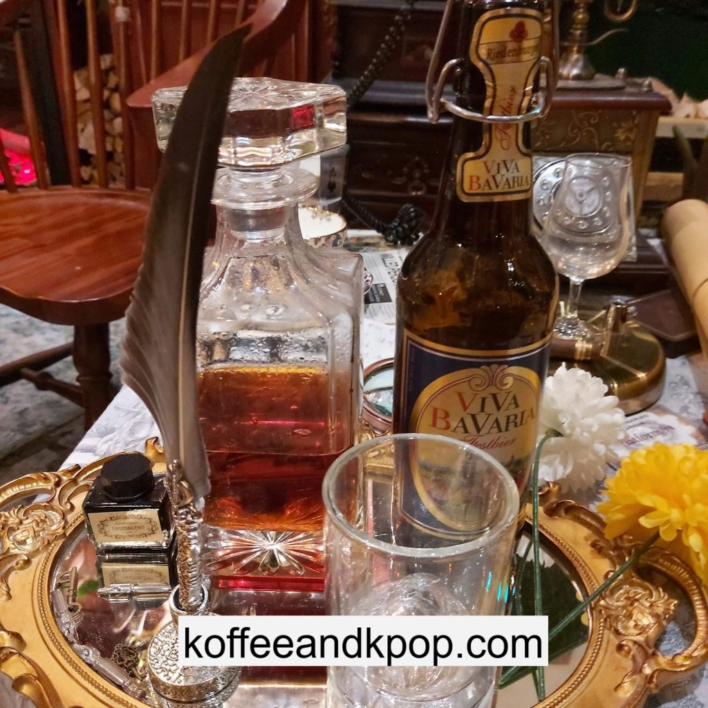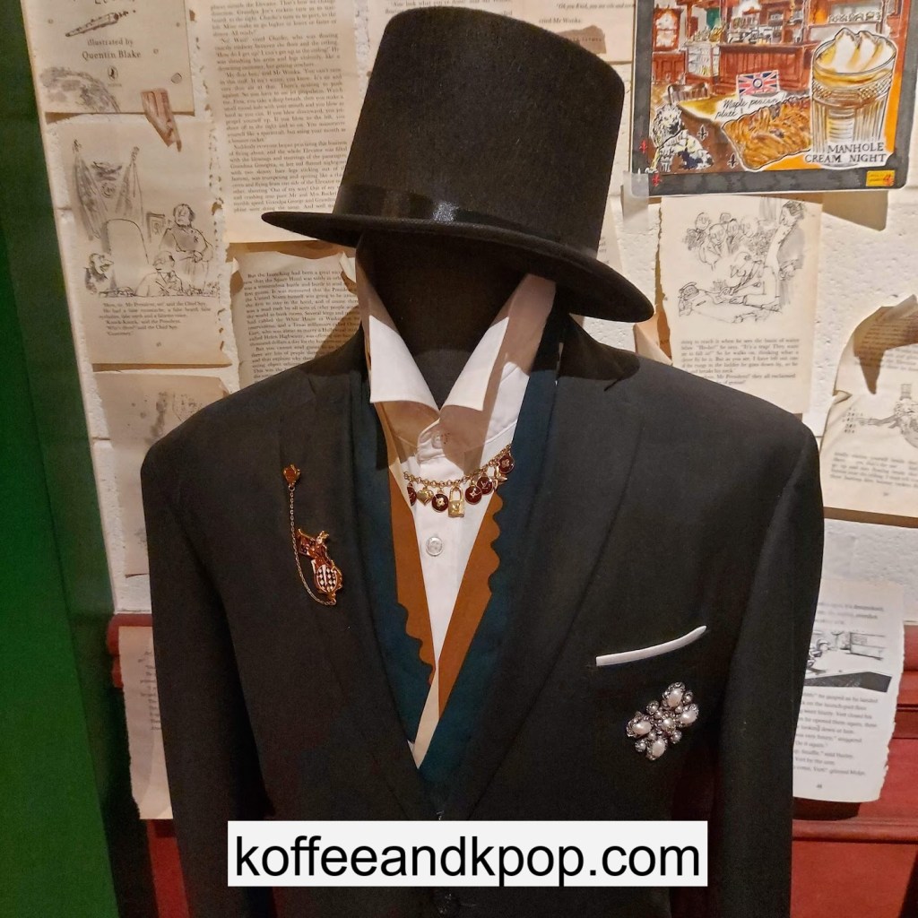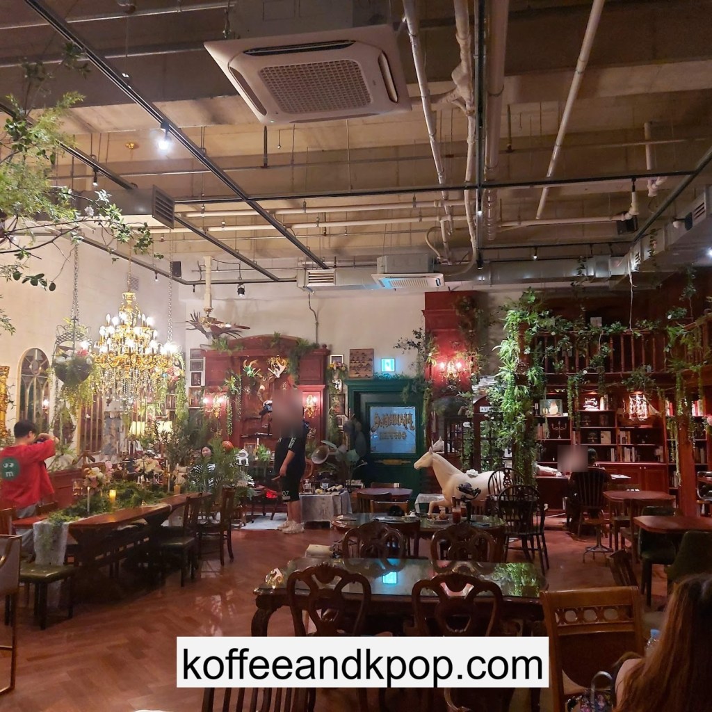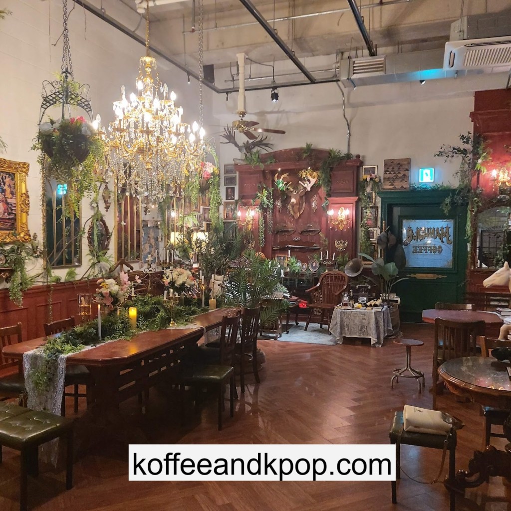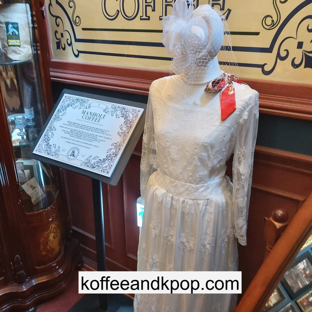 the coffee barcrystal chandelier over a large tableworking fountain with angellots of fake leaves, candles, and a wooden deer head posted on the wallchess game, sadly for display onlymirror, lamp and more framed photos of royaltythe second “floor” which is not real, and all the books from floor to ceilingdisplay of various objects including a telephone and bottle of some kind of (fake) alcoholquill pen and glass bottle of (fake) alcoholthe British telephone booth, full of booksstreet signs and lots of fake plantsBritish post office box with Manhole Coffee’s hours listedtelephone inside the telephone booth, surrounded by bookstwo seated table near the bookcaseanother view of the large tableanother view of the bookcasethe bookcase again; I was sad I couldn’t go up thereclose-up of the bookshelvestable of random things for sale, with some melted candles as wellpianomelted candles on the pianobulletin board above the piano filled with business cards pinned to ita brown leather chair and lamp under a flag featuring Manhole’s logo, oddly in the hallway just outside the toiletssleek black roastershelf with things for sale, as well as some booksanother shelf of things for sale, such as cups and teabook pages pinned to the wallmannequin torso of a black suit and hatred flowers beside the ordering kioskview of the space as a wholelarge wooden gear clock with lots of fake plants
