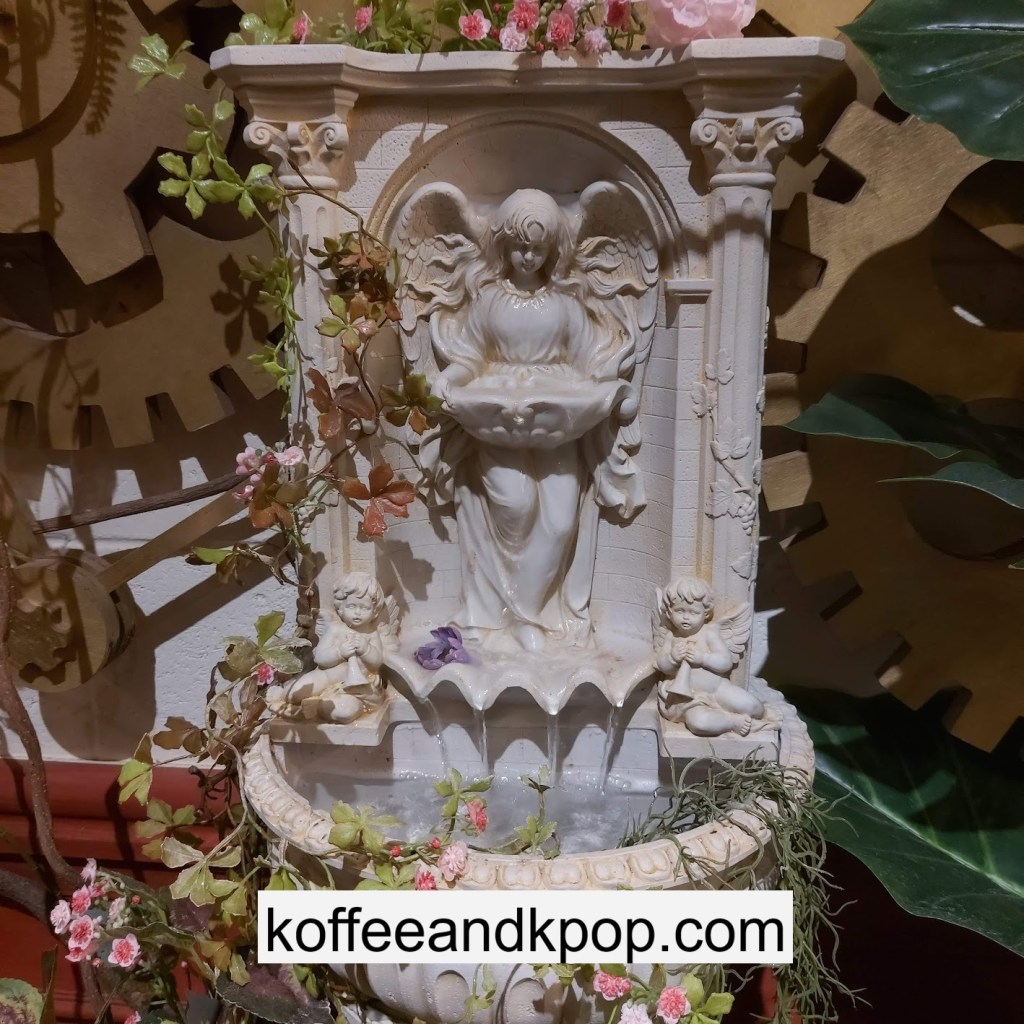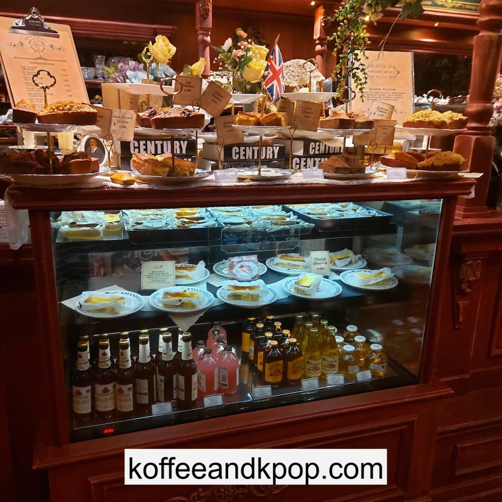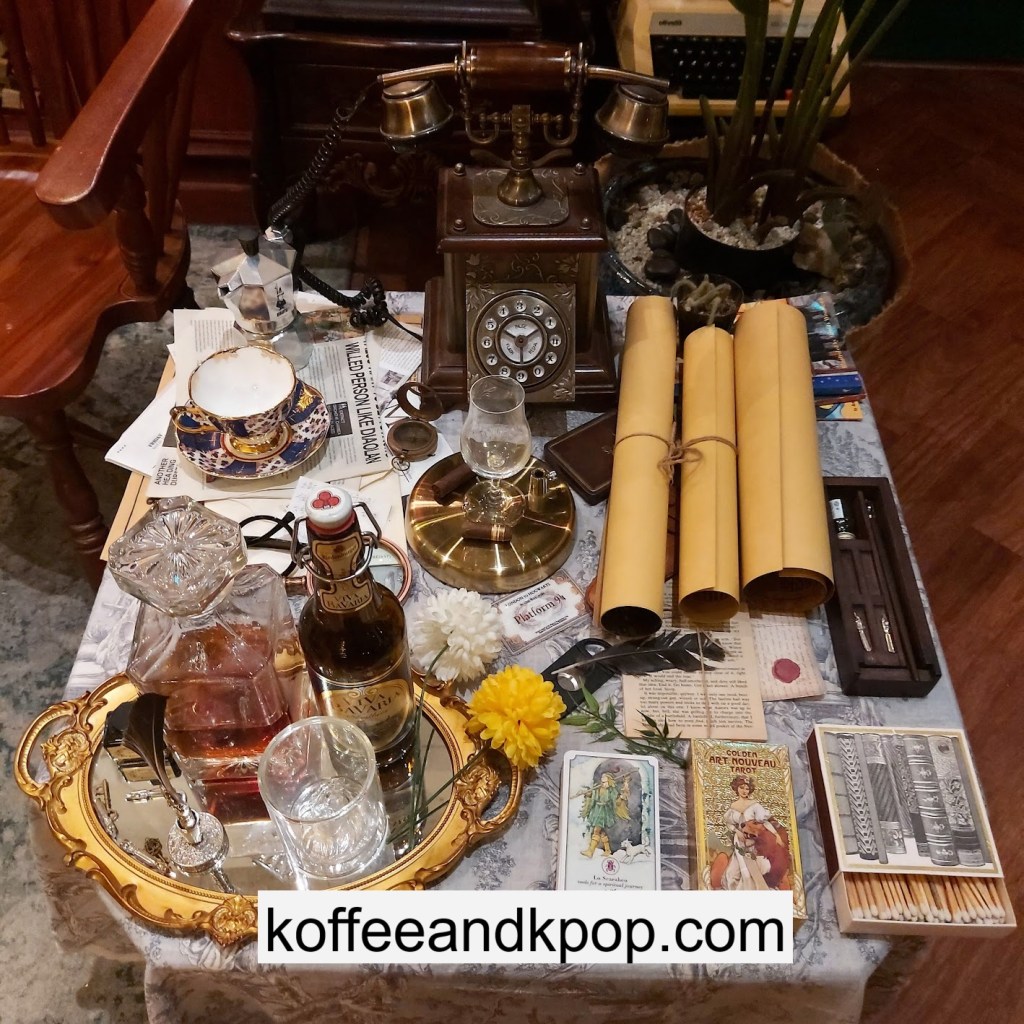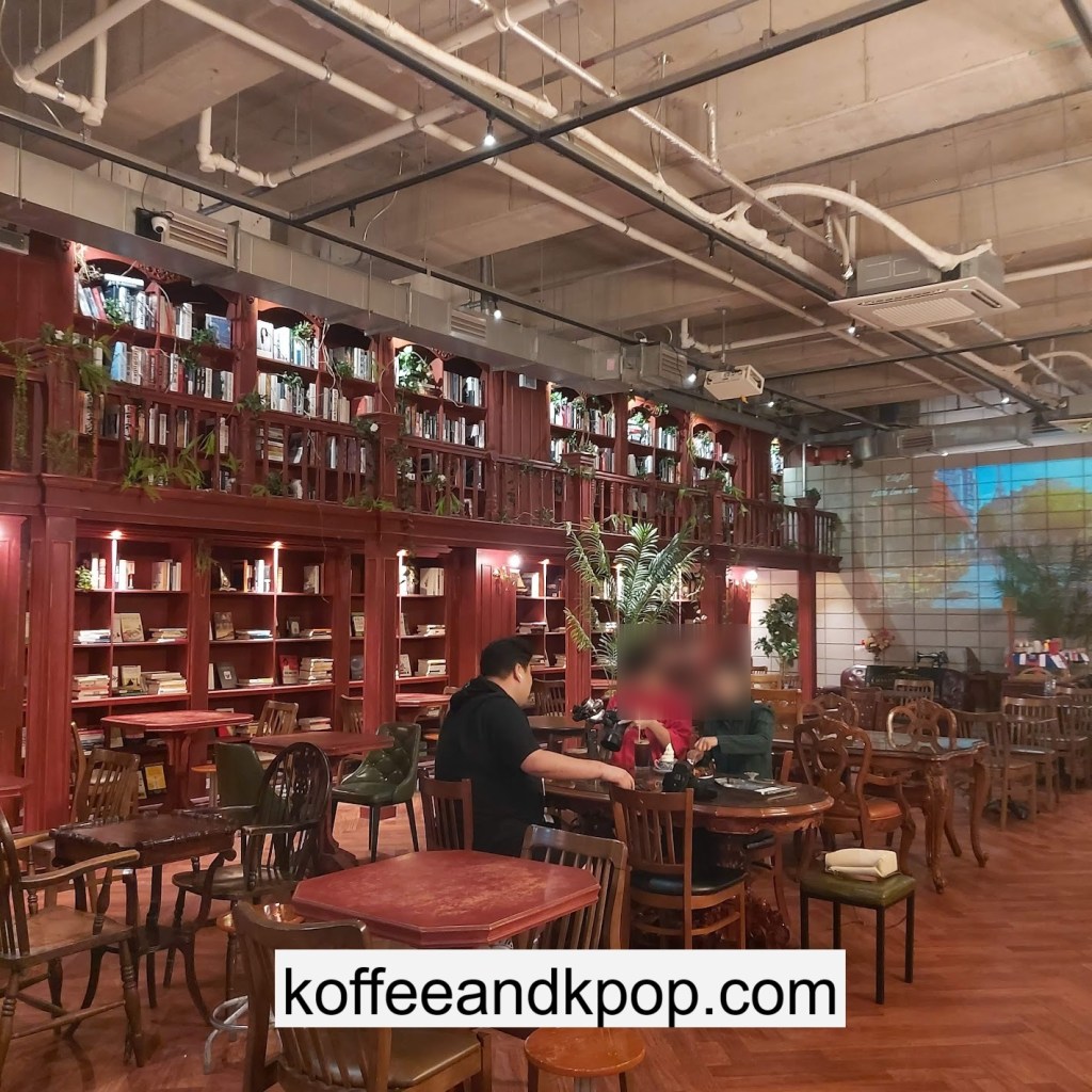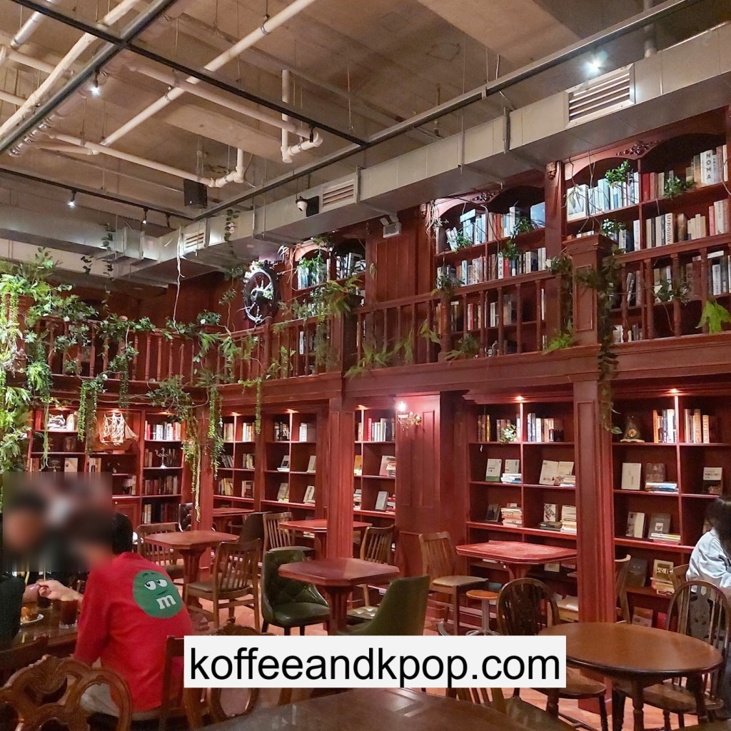 the coffee barcrystal chandelier over a large tableworking fountain with angellots of fake leaves, candles, and a wooden deer head posted on the wallchess game, sadly for display onlymirror, lamp and more framed photos of royaltythe second “floor” which is not real, and all the books from floor to ceilingdisplay of various objects including a telephone and bottle of some kind of (fake) alcoholquill pen and glass bottle of (fake) alcoholthe British telephone booth, full of booksstreet signs and lots of fake plantsBritish post office box with Manhole Coffee’s hours listedtelephone inside the telephone booth, surrounded by bookstwo seated table near the bookcaseanother view of the large tableanother view of the bookcasethe bookcase again; I was sad I couldn’t go up thereclose-up of the bookshelvestable of random things for sale, with some melted candles as wellpianomelted candles on the pianobulletin board above the piano filled with business cards pinned to ita brown leather chair and lamp under a flag featuring Manhole’s logo, oddly in the hallway just outside the toiletssleek black roastershelf with things for sale, as well as some booksanother shelf of things for sale, such as cups and teabook pages pinned to the wallmannequin torso of a black suit and hatred flowers beside the ordering kioskview of the space as a wholelarge wooden gear clock with lots of fake plants