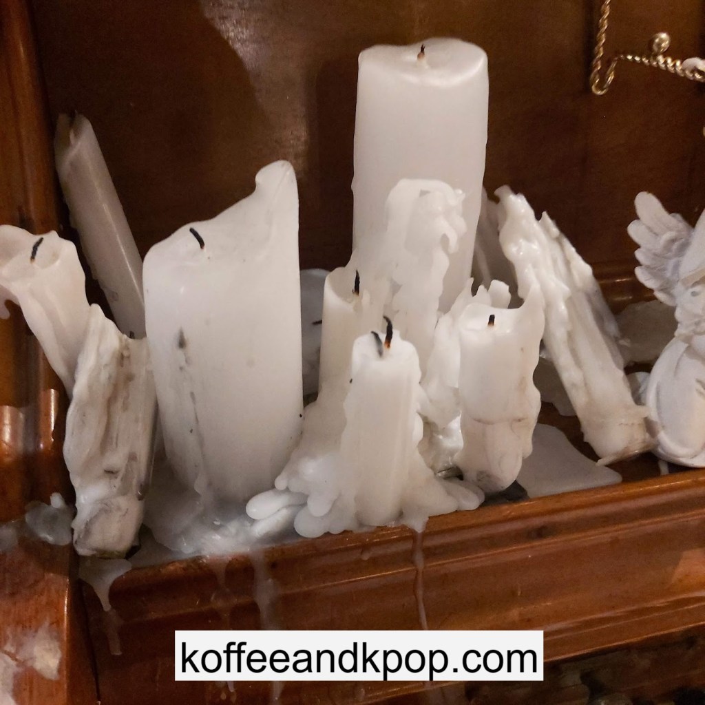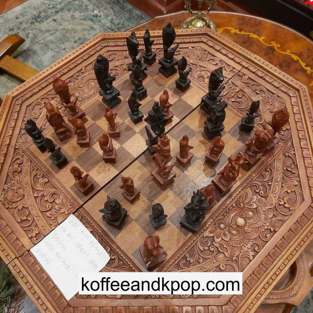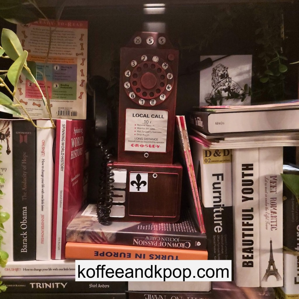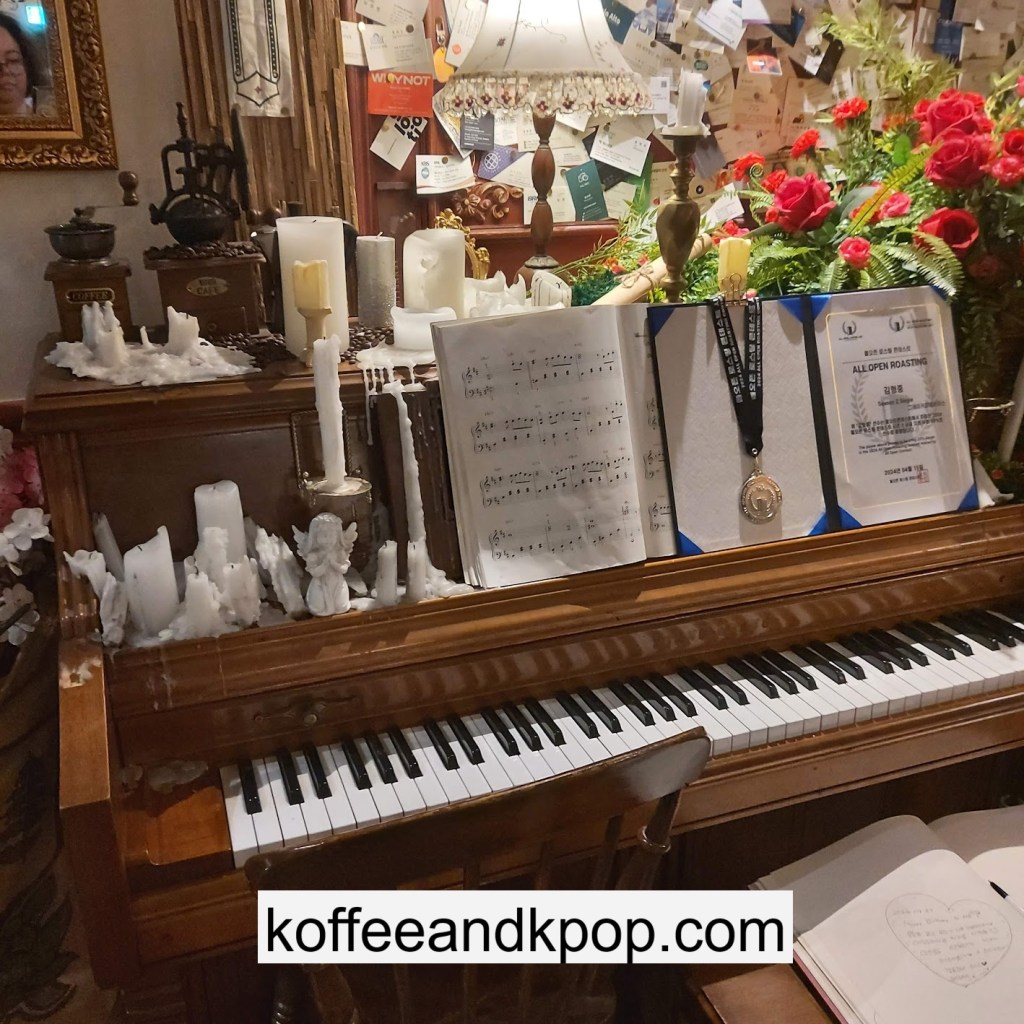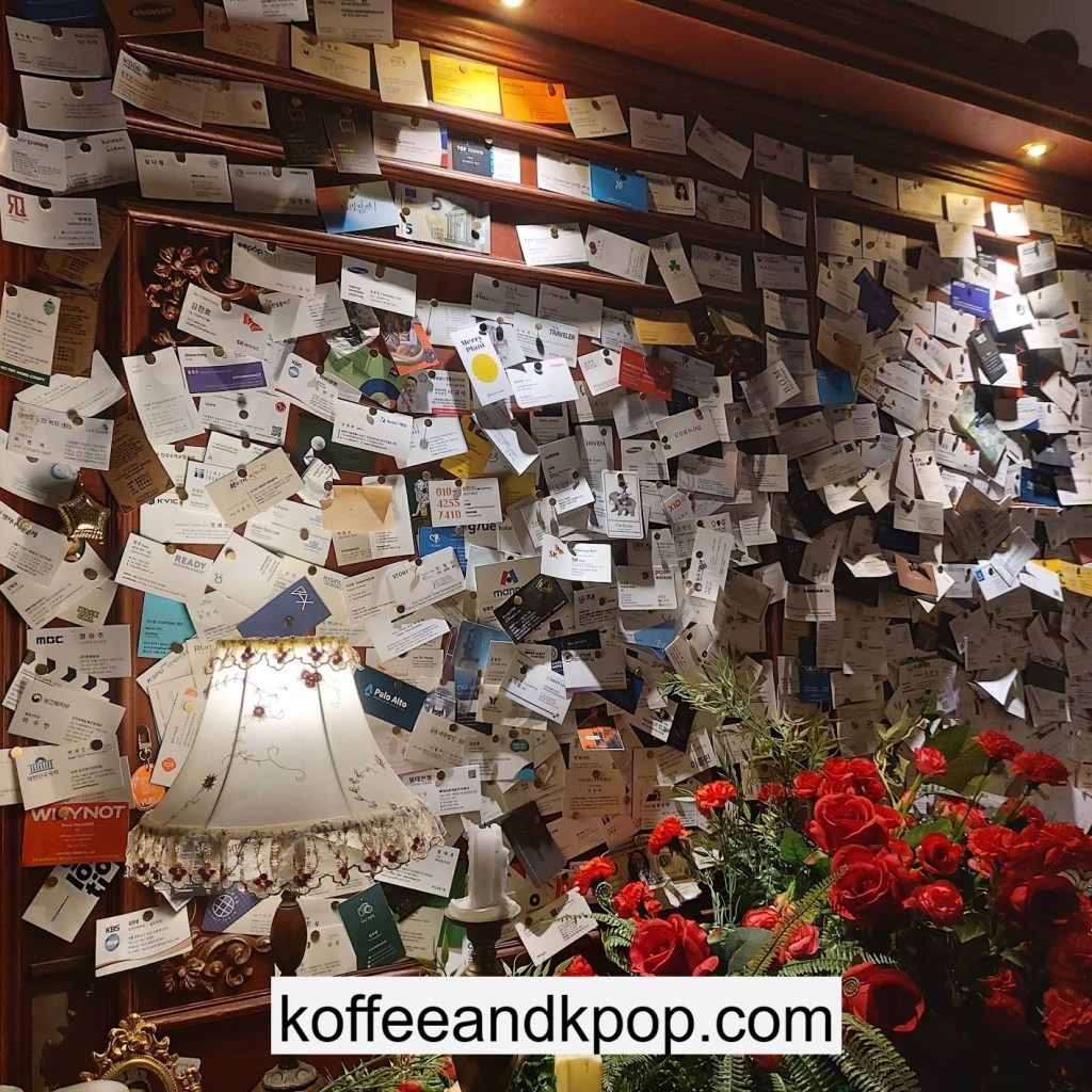the coffee barcrystal chandelier over a large tableworking fountain with angellots of fake leaves, candles, and a wooden deer head posted on the wallchess game, sadly for display onlymirror, lamp and more framed photos of royaltythe second “floor” which is not real, and all the books from floor to ceilingdisplay of various objects including a telephone and bottle of some kind of (fake) alcoholquill pen and glass bottle of (fake) alcoholthe British telephone booth, full of booksstreet signs and lots of fake plantsBritish post office box with Manhole Coffee’s hours listedtelephone inside the telephone booth, surrounded by bookstwo seated table near the bookcaseanother view of the large tableanother view of the bookcasethe bookcase again; I was sad I couldn’t go up thereclose-up of the bookshelvestable of random things for sale, with some melted candles as wellpianomelted candles on the pianobulletin board above the piano filled with business cards pinned to ita brown leather chair and lamp under a flag featuring Manhole’s logo, oddly in the hallway just outside the toiletssleek black roastershelf with things for sale, as well as some booksanother shelf of things for sale, such as cups and teabook pages pinned to the wallmannequin torso of a black suit and hatred flowers beside the ordering kioskview of the space as a wholelarge wooden gear clock with lots of fake plants