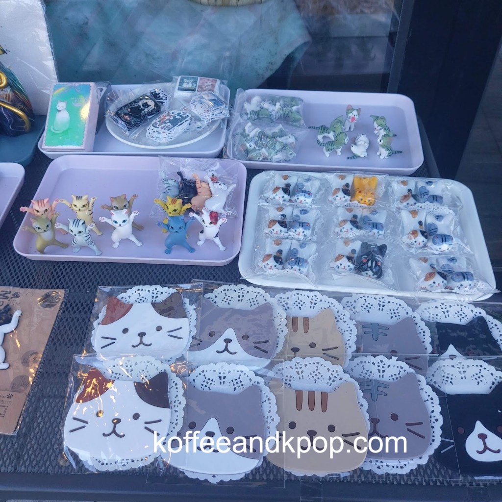 After I finished my meal, I wandered through a traditional market and down Wolhwa Street itself. I walked up to a bridge overlooking the street and decided it was too hot to keep walking more, so I walked back down and passed by a few tables outside a cafe cluttered with cat things.