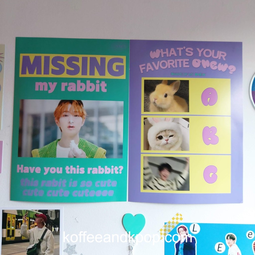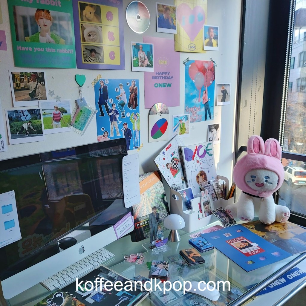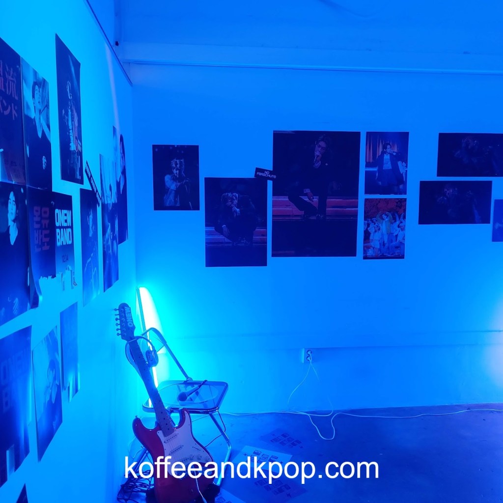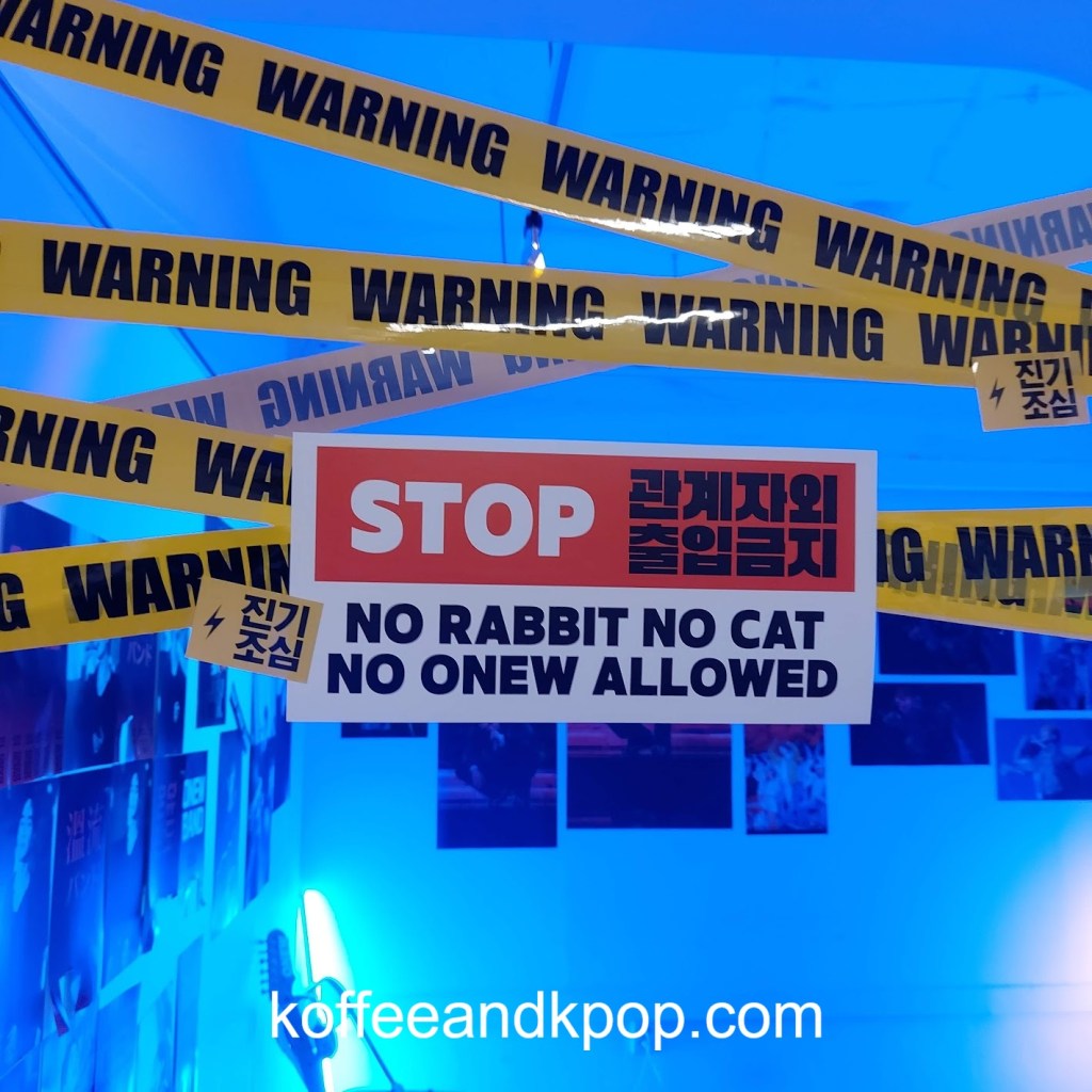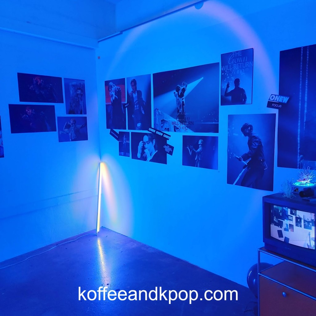 vertical poster outside the cafestack of paper cups on the counterposters arranged in a chaotic way featuring various photos of OnewOnew throwing a baseball pitch and other photos of him in a baseball jerseya little table set up with fake birthday cakes for Onew’s two plush characters: a cat wearing a pink bunny hat, and a white bunnya black Onew jerseythe inside of a locker featuring a bag hanging up and various photos of Onewa baseball glove and copies of his “weekend” version of Flow, which features him in a baseball jersey holding some baseball glovesa desk with a computer decked out in photos of Onew, along with a large plushieWhat’s Your Favorite Onew? poster featuring a rabbit, a cat in bunny ears, and a blurry photo of Onew holding up his armsmore photosmore photos and albumsstanding photos of Onew along with some small cassette-like albumsa blue-lit room wrapped off with warning tape that reads “No rabbit No cat No Onew allowed”posters on the wall of the blue rooma guitar propped up against a chair with a microphone on it, with more posters of Onew on the wall