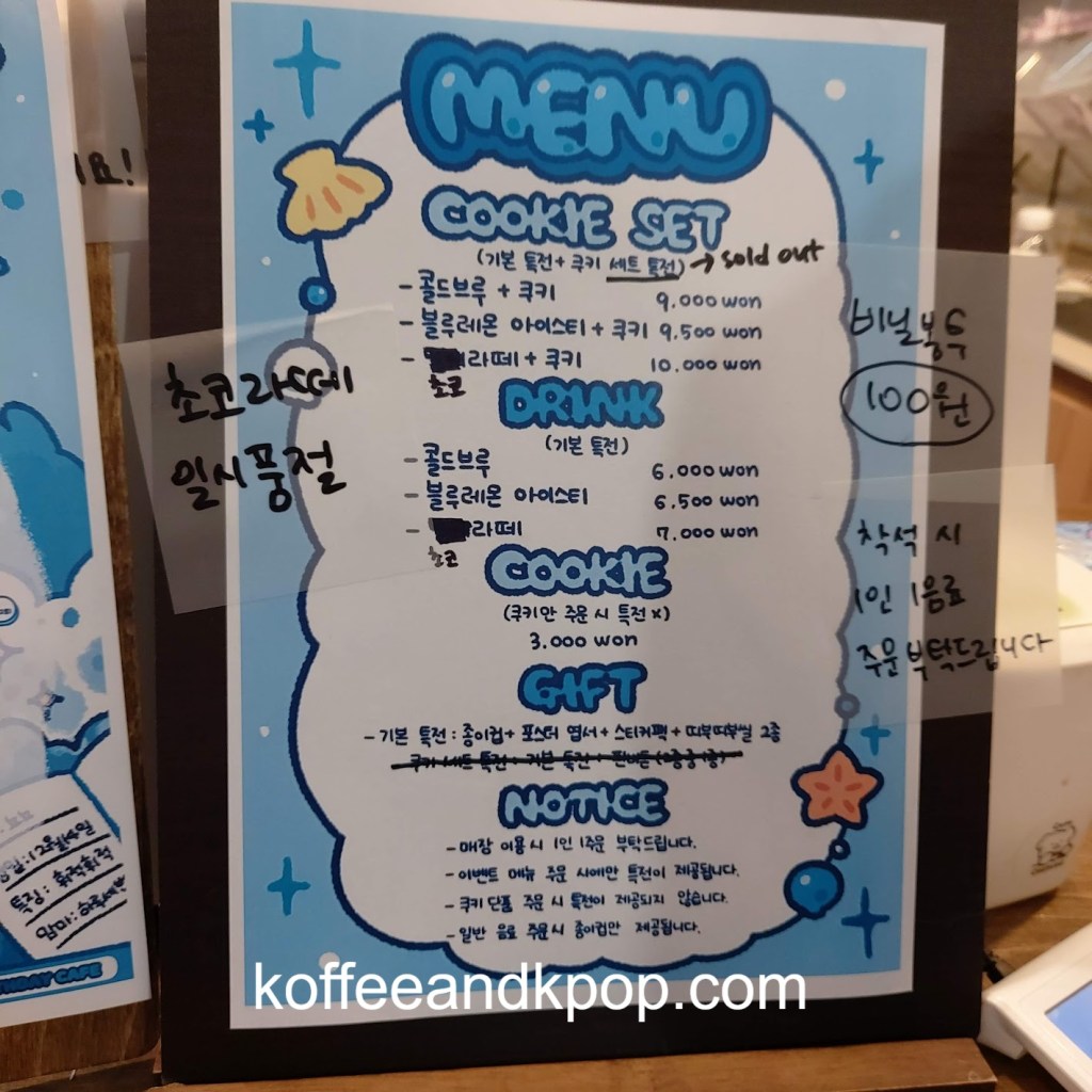 large poster covering the windows of the cafean open notebook with some Korean written in it, next to a blue crayon and magnifying glassanother infamous stack of paper cups on the counteran A4 poster showing the various goodies you can get at the cafean A4 poster showing the various sets and gifts you can receive with said purchasessome of the goodies I got, including a large illustrated calendar featuring a gold fish and a cat wearing a diving helmet under the sea