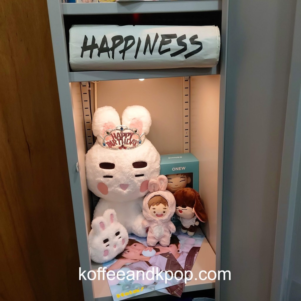 vertical poster outside the cafestack of paper cups behind a birthday cakevarious Onew character plushies a visual set-up of drinks and goodies you can get, as well as a few signed itemssome photos from one of my favorite photoshoots of Onew’sa large cut-out of Onew standing with his hands on his hips in khakis, a white shirt and striped tie, with a blackboard behind him with Korean written on ita desk in front of Onew, with various objects like papers, pens, a little plush pencil case and mirror, etc.a girl’s school uniform hung on the wall with a sky blue plaid skirt, matching bow tie, and sky blue cardiganvarious photos of Onew standing in front of a blackboardthe inside of a locker featuring lots of repeating photocards of Onew along the backanother level of the locker with a sign that reads “Happiness” and various Onew plushiesmore photos and memorabilia in the lockerlots of Onew photocardsmore photosphotos of Onew hung up on strings along the windows of the cafemore photos of OnewOnew albums standing on a shelfmore Onew albums