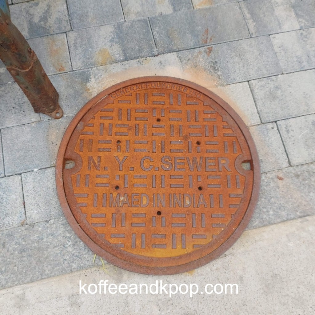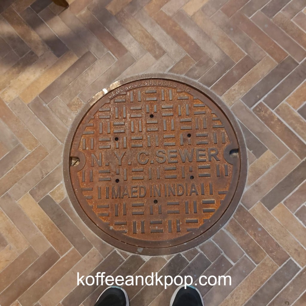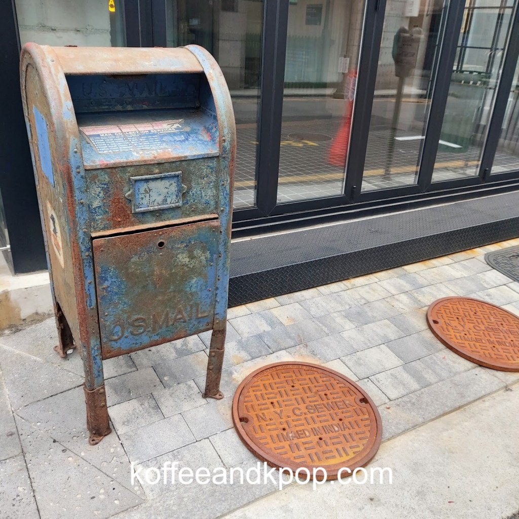 outside signagethe building itselfclose-up of the neon signage outside the buildingrusty metal American mailbox with a couple of manhole covers in front of the cafemanhole cover reading “N.Y.C. Sewer, Maed in India”