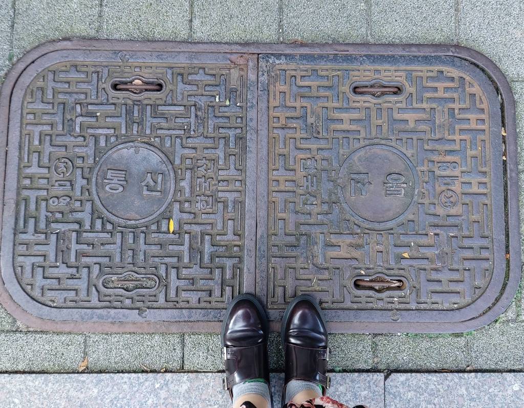 Shoes: one of the big controversies in the manhole cover world. Many people hate seeing shoes in photos, others enjoy it–but it seems the main reason why people include their shoes is to say “I was here.” These are my second-hand Doc Martens. What you can’t see are my dinosaur socks.