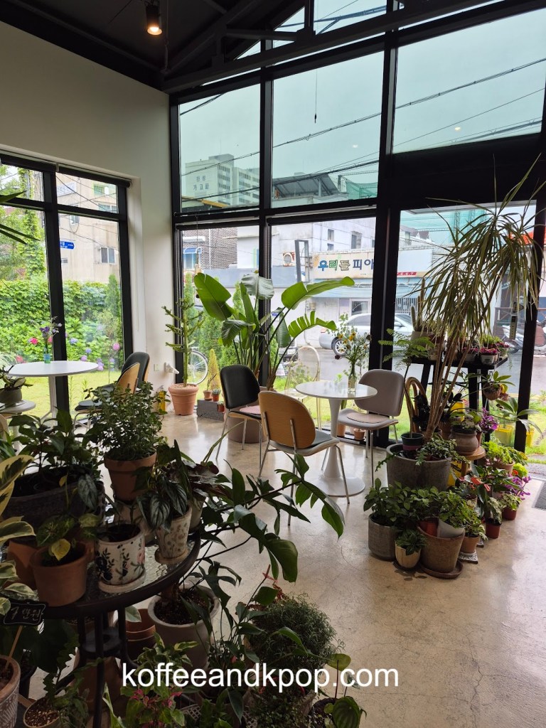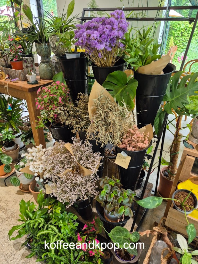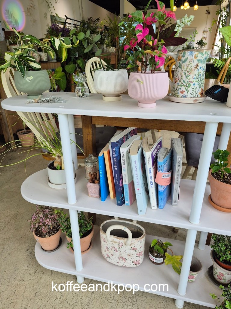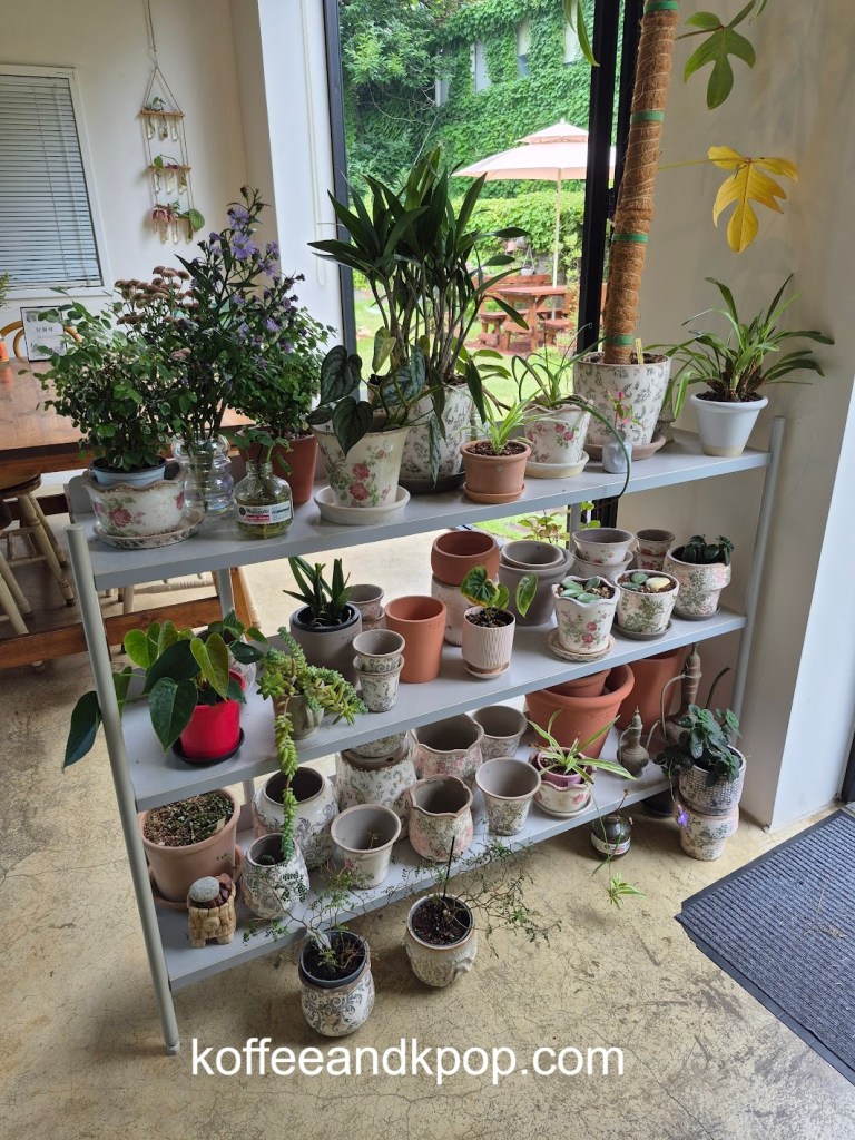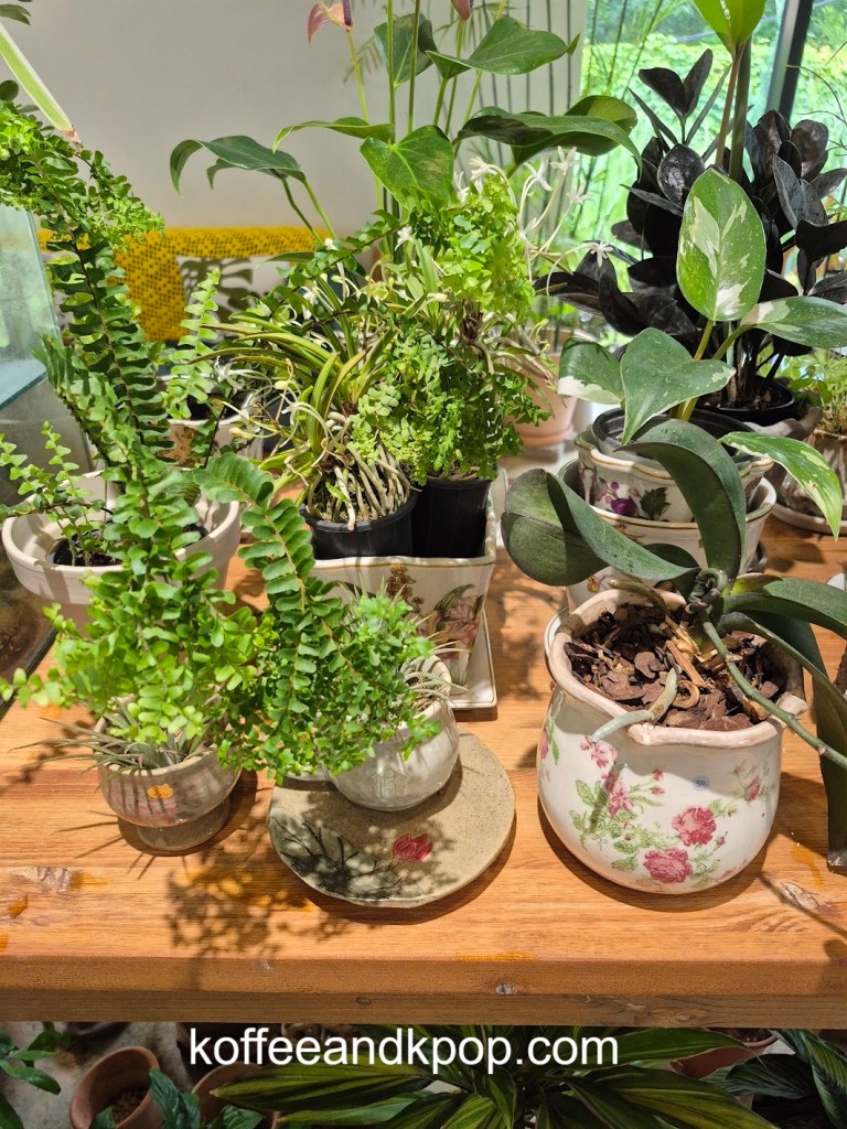 seriously, so many plantsa bookshelf with some Korean books on itclose-up of some of the plantssome more plants dividing the large reservable table from the rest of the seatingthe large table for reservationssome rustic furniture covered in plants and flowersa bulletin boardanother view of some of the plants in the middle of the cafea cute little dog decorationmore plants on a shelfI think I added at least a year to my life being here for an hour because of the sheer number of plantsa napkin transformed into an origami birdindividually wrapped cookiesa sample of the menurefrigerated case with some cakes and drinks insideanother view of the interiorI tucked myself away in that corner over thereherbal tea for saleplants… more plantsa cute little gnome on a string decorationmore plantsa glass case full of flowerslooking down a hallway to the restroomsmore flowers and plants