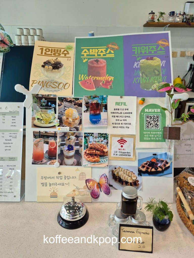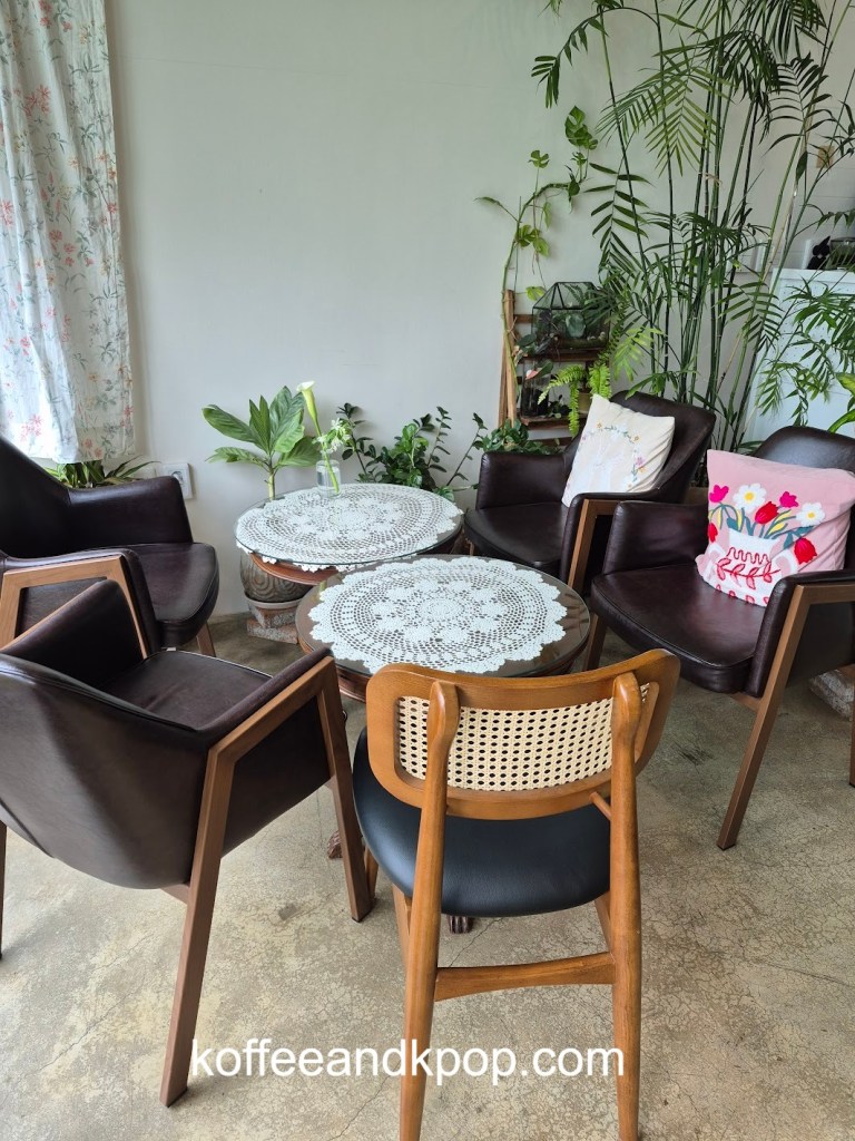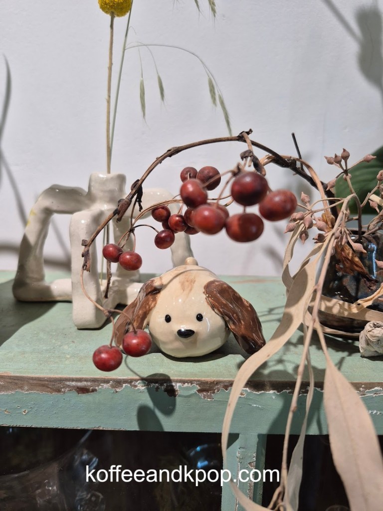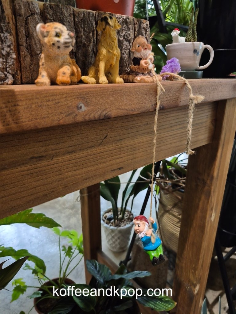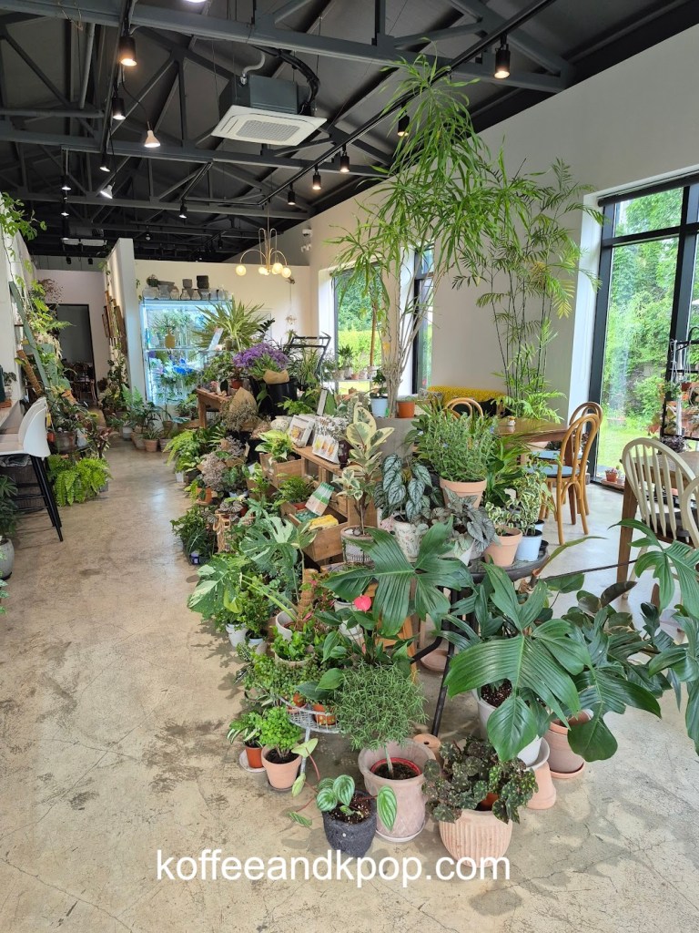 seriously, so many plantsa bookshelf with some Korean books on itclose-up of some of the plantssome more plants dividing the large reservable table from the rest of the seatingthe large table for reservationssome rustic furniture covered in plants and flowersa bulletin boardanother view of some of the plants in the middle of the cafea cute little dog decorationmore plants on a shelfI think I added at least a year to my life being here for an hour because of the sheer number of plantsa napkin transformed into an origami birdindividually wrapped cookiesa sample of the menurefrigerated case with some cakes and drinks insideanother view of the interiorI tucked myself away in that corner over thereherbal tea for saleplants… more plantsa cute little gnome on a string decorationmore plantsa glass case full of flowerslooking down a hallway to the restroomsmore flowers and plants
