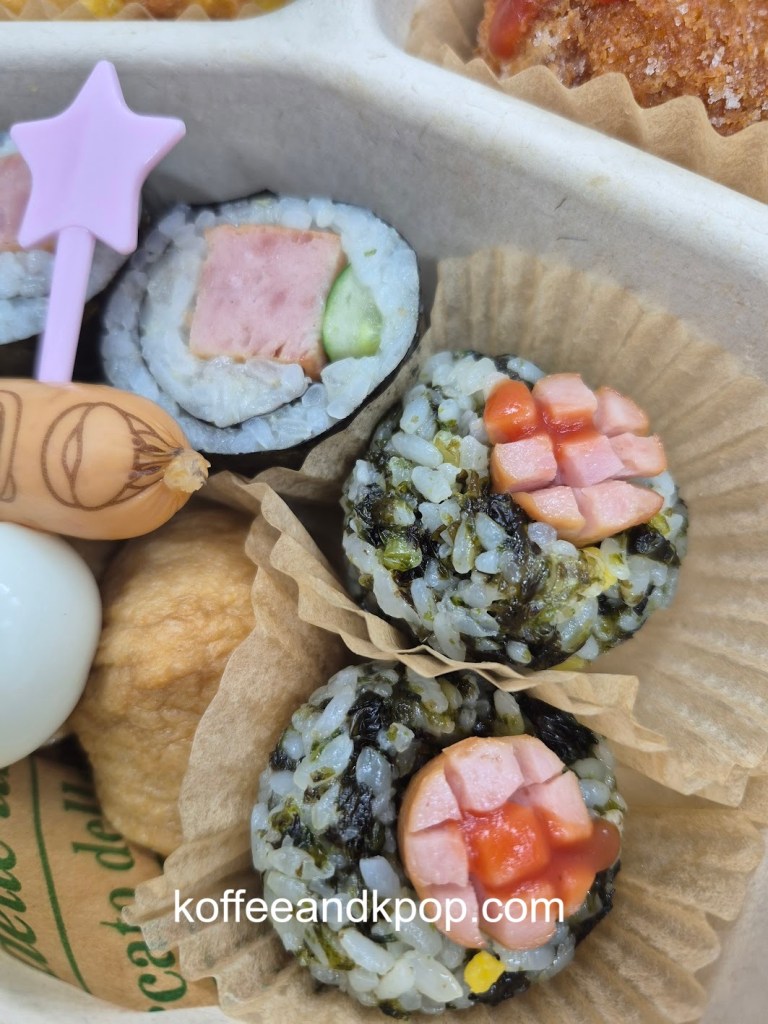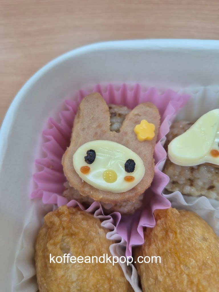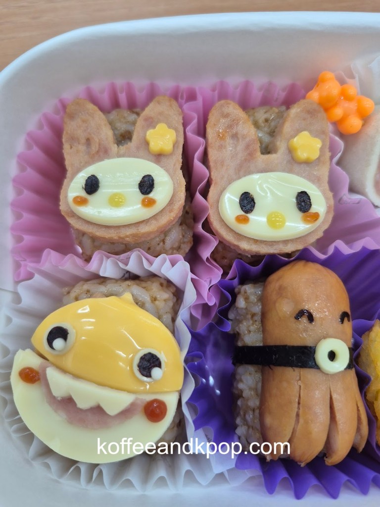Day Six was another adorable lunch. It consisted of two pieces of yubuchobap, two chicken nuggets with honey mustard dipping sauce, a mini corn dog embossed with a smiley face, and the pièce de résistance–molded rice balls with Sanrio characters (My Melody, Cinnamoroll, and Pompompurin) on top made with edible ingredients like spam, cheese, ketchup, and seaweed. It was really great for the kids, but not very filling for the adults.