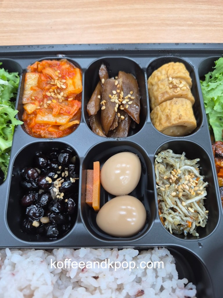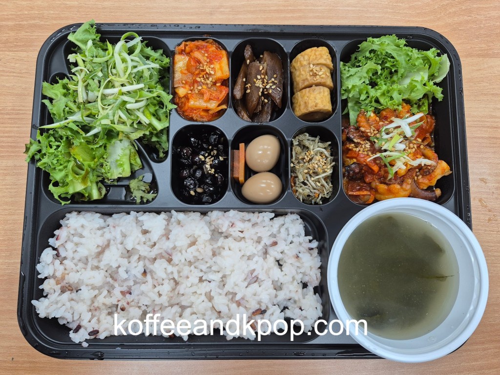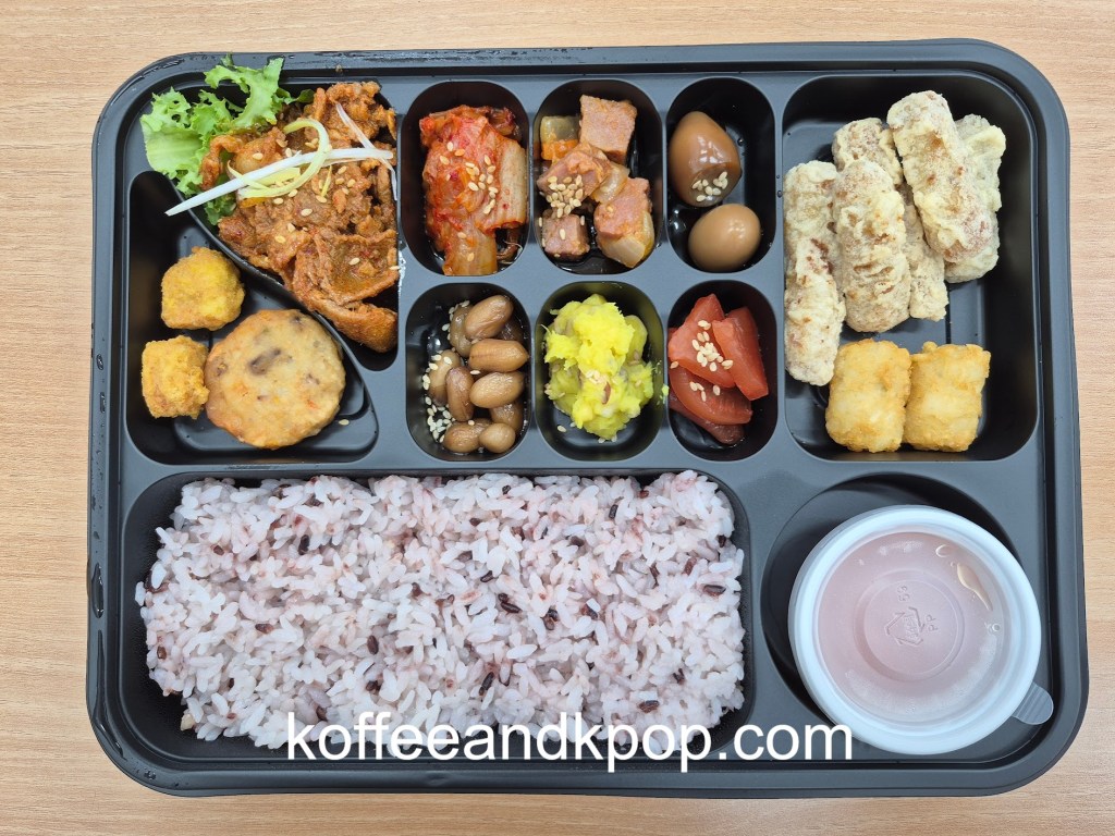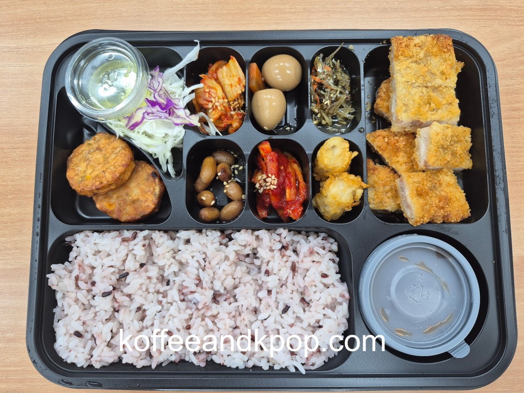 Day Three was a typical dosirak with rice, salad, two small meat patties, kimchi, quail eggs, myeolchi bokkeum (멸치볶음, stir-fried anchovies), peanuts, some kind of vegetable, two tater tots, and some tonkatsu pieces (called “donkkaseu” 돈까스 in Korean) with dipping sauce.