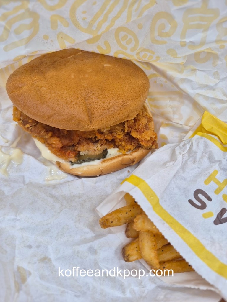 Day Sixteen was a special lunch of a chicken burger and french fries from the Korean chain Mom’s Touch. (The sandwich is actually upside-down in this picture, so you’re looking at the bottom bun.)