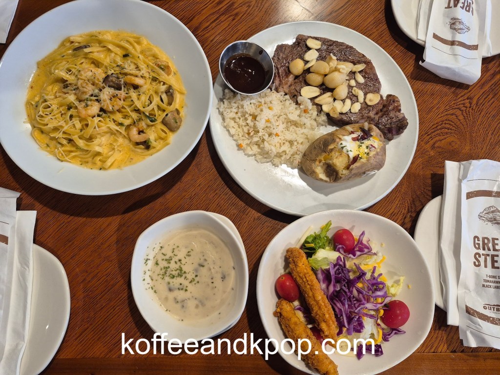 Day Twenty the lunch was at Outback Steakhouse. The spread you see here was shared between four students. There was shrimp pasta, steak, a baked potato, rice, salad, chicken strips, brown bread, and lemonade.